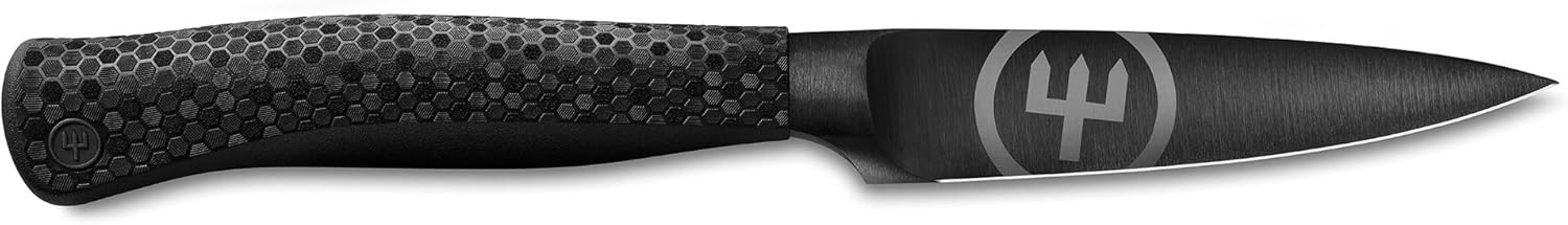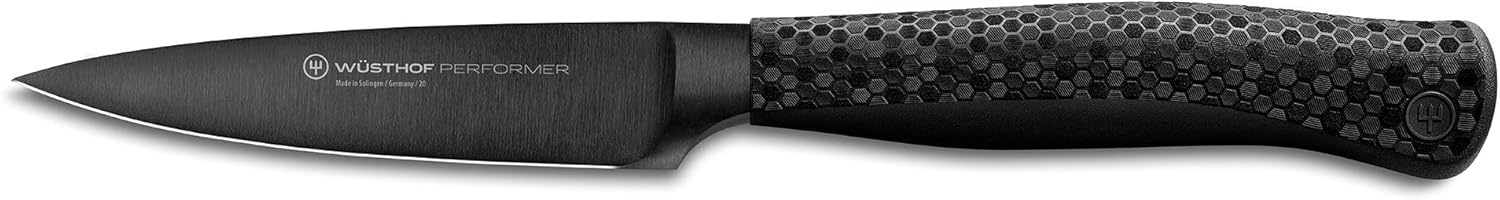 Dieses innovative Wüsthof Performer Messer verbindet einzigartiges Design mit purer Dynamik. Das komplett schwarze Allzweck-Messer aus Solingen (Solingen-Messer) ist extrem robust und super schnitthaltig – ein richtig gutes Messer für ideale Schnitte Das kleine Messer mit schlanker, spitzer Klinge (9cm) ist als Gemüse-, Obstmesser oder Schälmesser ideal für filigrane Schneidaufgaben – ein vielseitiges, ultrascharfes Universalmesser für alle kleinen Lebensmittel, auch als Fleischmesser zum feinen Putzen Einzigartiges Profi Küchenmesser: Die diamantähnliche Beschichtung erhöht die Rockwell-Härte des Edel-Klingenstahls auf extreme 104° HRC – dadurch ist die rostfreie Klinge äußerst unempfindlich gegen Kratzer, Hitze sowie Säuren, Basen und Stärke Hexagon Power Grip: Die neuartige, ergonomische Griff-Konstruktion mit versetzter Antirutsch-Wabenstruktur garantiert eine extreme Kontrolle. So halten Sie das Allround-Messer (Küchenmesser klein) auch bei anspruchsvollen Arbeitsbedingungen fest im Griff Ein handliches Kochmesser Profi-Messer, das Design, Innovation und Funktionalität optimal verbindet – ideal für kulinarisch ambitionierte Food-Fans und Profi-Köche. Das Messer für den idealen Schnitt – Made in Germany, geschmiedet in Solingen | قیمت یورویی : 170€