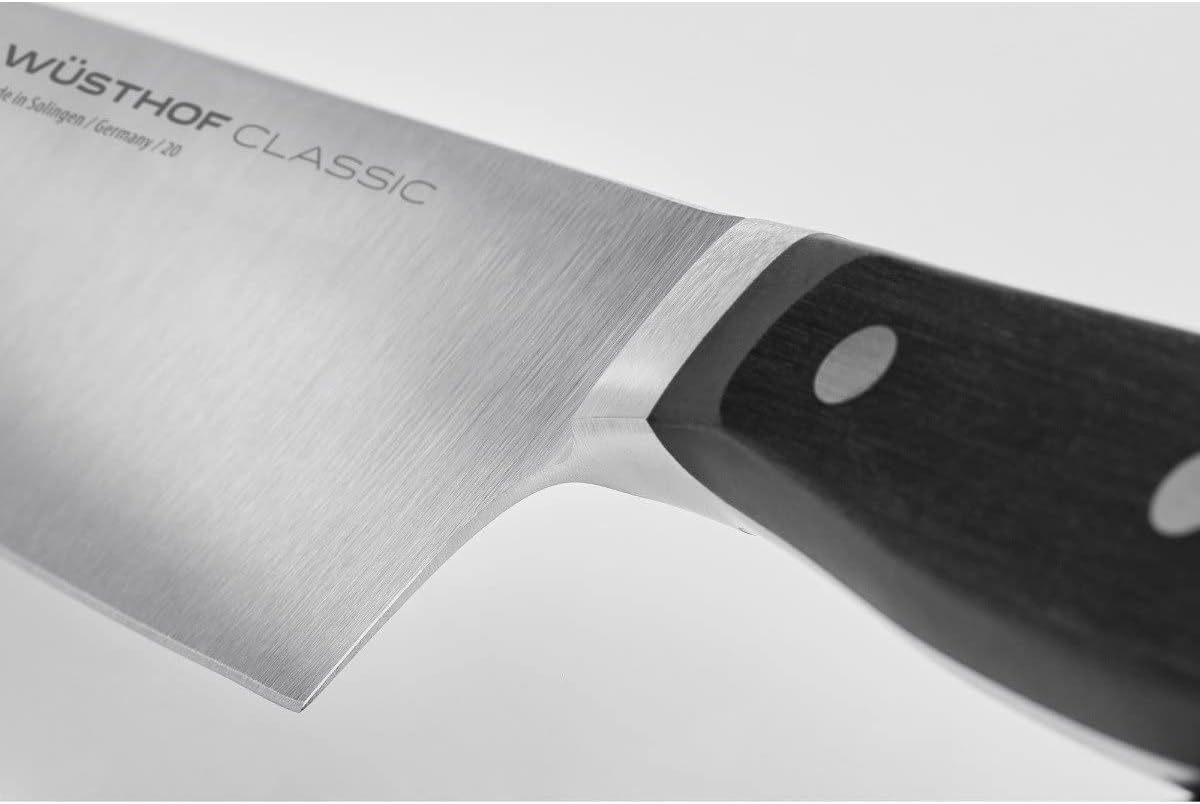 Die Wüsthof Classic Messerserie überzeugt mit zeitlosem Design und zuverlässiger Leistung. Sie ist pflegeleicht und bietet jedem Food-Fan das richtige Koch-Werkzeug – z.B. dieses asiatische Kochmesser zum Schneiden und Hacken von Gemüse und Kräutern Schnell einen Kohl hacken, Salat zerkleinern oder hauchdünne Tomatenscheiben schneiden: dafür bietet das kräftige Spezial-Messer mit dem charismatischen Klingenblatt die ideale Präzision. Entgegen der mächtigen Erscheinung, ist es erstaunlich handlich Die ultrascharfe Klinge wird aus einem Stück Wüsthof Stahl geschmiedet und auf 58° Rockwell gehärtet. Der dünne Schliff und kleine Kropf (Verdickung zwischen Klinge und Griff) verringern das Gewicht, sodass das Messer sehr leicht in der Hand liegt Ein gutes Küchenmesser mit rutschfesten Griffen aus Spezialkunststoff. Sie sind mit Edelstahlnieten dreifach vernietet, fugenlos montiert und sehr hygienisch. Der ergonomische Griff liegt gut in der Hand und unterstützt ermüdungsfreies, sicheres Schneiden Dieses rundum stabile Qualitäts-Messer von Wüsthof ist ideal ausbalanciert, unterstützt sicheres Arbeiten und ist somit ideal für die tägliche Küchenarbeit. Ein Markenmesser eines echten Traditionsunternehmens: Made in Germany – geschmiedet in Solingen | قیمت یورویی : 157.38€