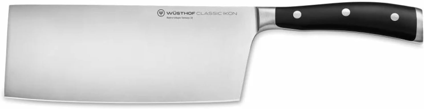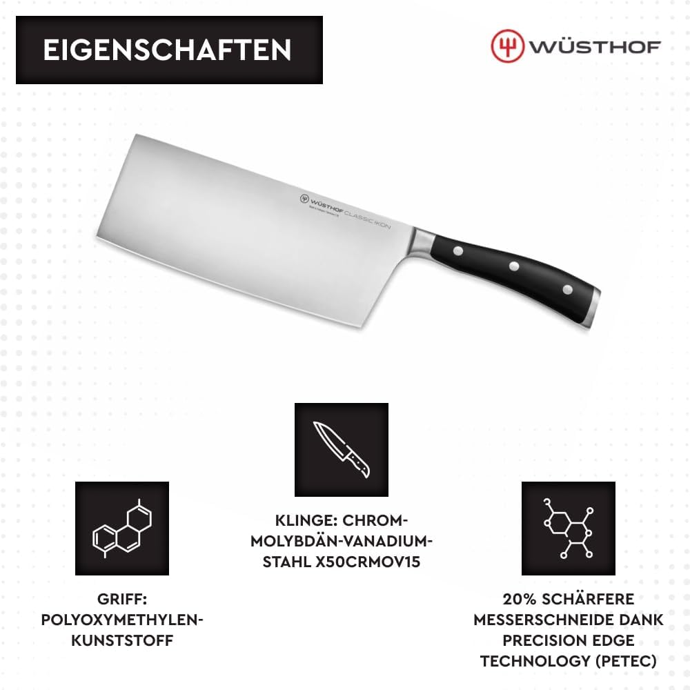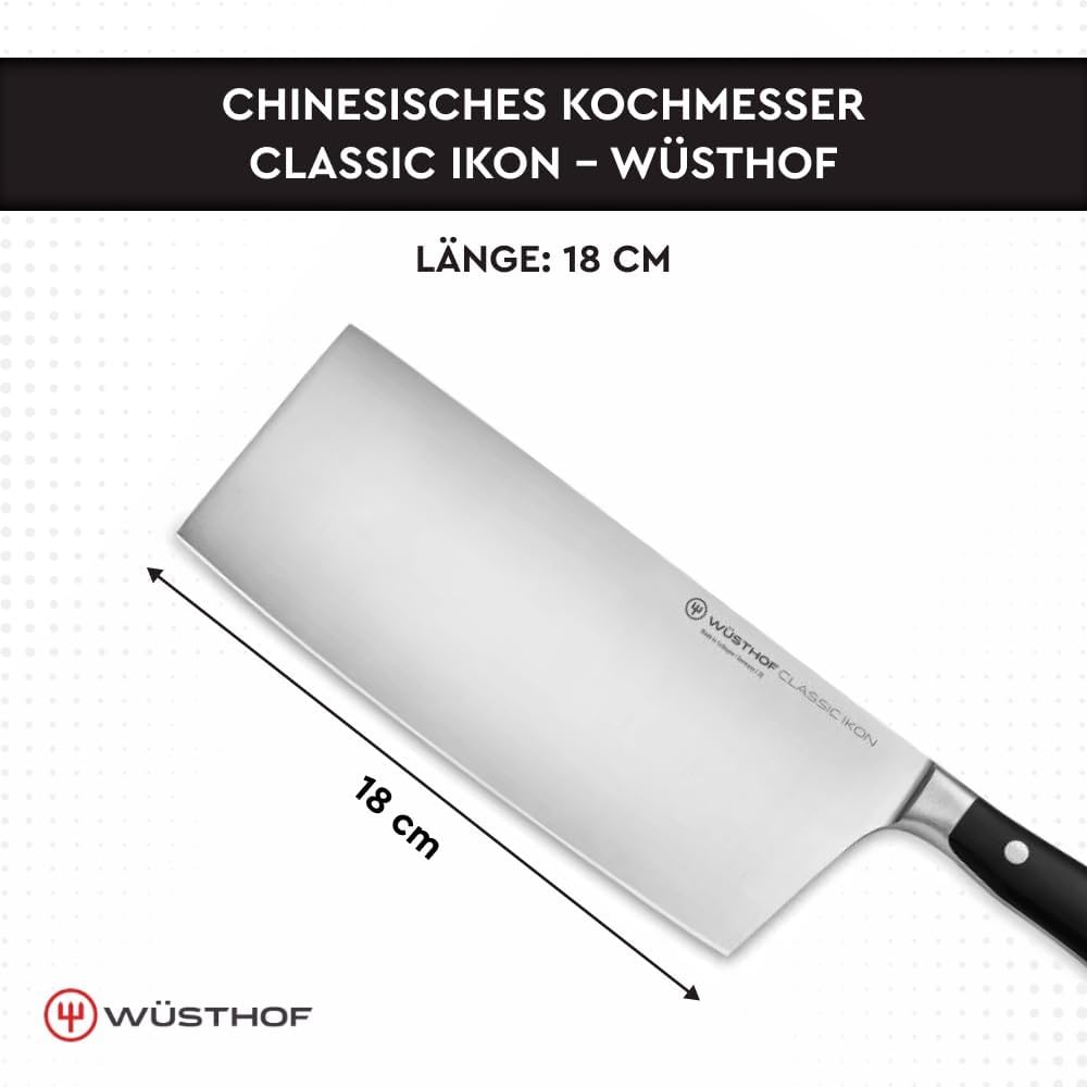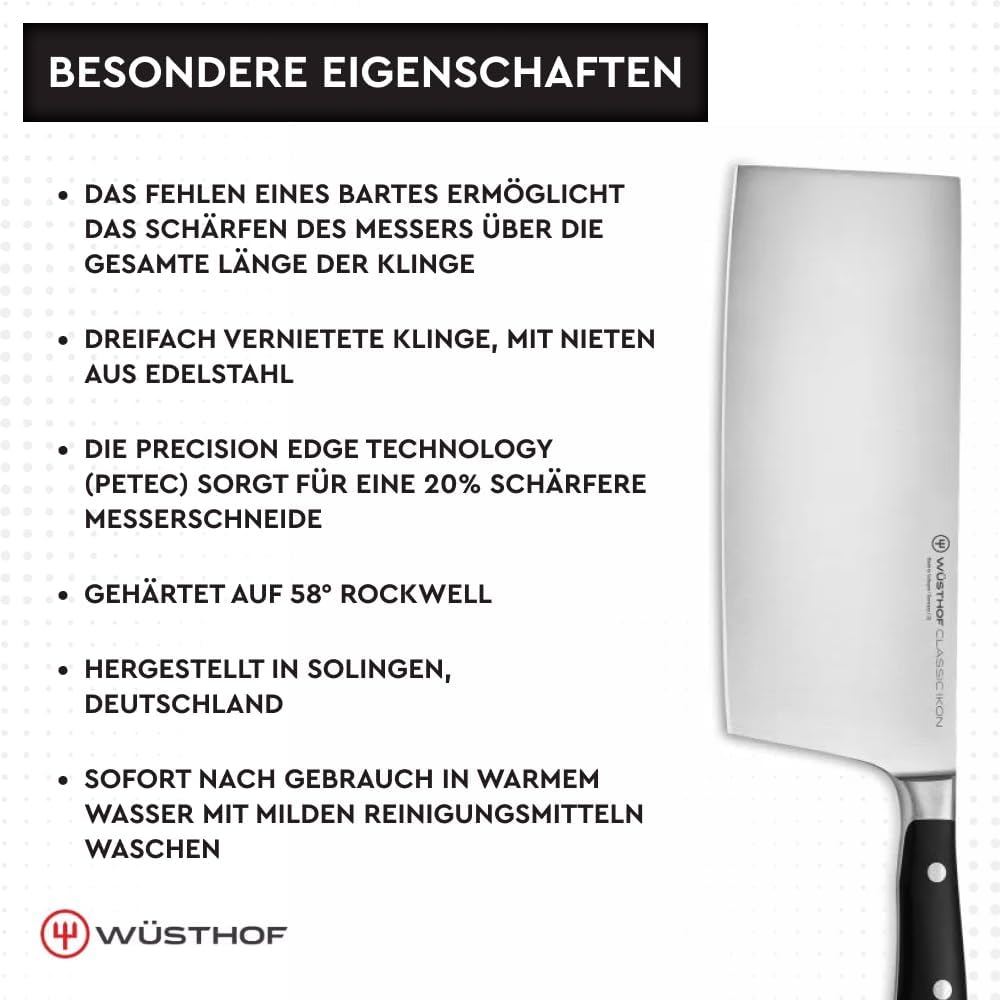 Als elegante Profi Messer aus Solingen beeindrucken die Wüsthof Messer der Classic Ikon Serie selbst anspruchsvolle Perfektionisten. So ist auch dieses asiatische Chefmesser ein kompromisslos gutes Küchenmesser mit zeitlosem Design Schnell Kohl hacken, Salat zerkleinern oder dünne Tomatenscheiben schneiden: dafür bietet das spezielle Gemüsemesser mit dem breiten Klingenblatt (7,75 cm) die ideale Präzision. Entgegen der mächtigen Erscheinung, ist das Hackmesser erstaunlich handlich Die langlebige Solingen Klinge des Küchen Messer (Profi Kochmesser) erhält in Handarbeit den finalen Polierabzug, also ihre ultrascharfe Klinge. Die feine Messerklinge sollte nicht für Knochen oder sehr harte Früchte (z. B. Kokosnüsse) eingesetzt werden Ergonomischer Griff – durch die kleine Wölbung im vorderen Bereich liegen die rutschfesten Griffschalen besonders sicher in der Hand. Der pflegeleichte Griff ist mit Edelstahl-Nieten fugenlos vernietet und sieht in jeder Küche sehr gut aus Als ideal ausbalanciertes Kochmesser beeindruckt Wüsthof Classic Ikon jeden Profi-Koch und ist dank der scharfen Messerklinge das offizielle Kochwerkzeug der deutschen Nationalmannschaft der Köche. Premiummesser – Made in Germany, geschmiedet in Solingen | قیمت یورویی : 202.93€