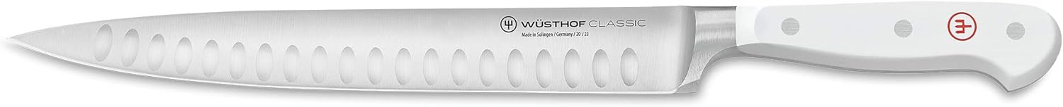 Die Wüsthof Classic White Messerserie verbindet mit ihren einzigartigen, weißen Griffen moderne Leichtigkeit mit bester Qualität. So sind die hochwertigen Solingen-Messer das elegante Extra in jeder Küche – z.B. dieses lange Fleischmesser mit Kullenschliff Das Schinken- und Lachsmesser (Profi-Fleischmesser) mit der schmalen, langen Klinge (23cm) schneidet es Schinken ebenso kraftvoll wie große Früchte und Gemüse. Als Tranchiermesser lösen Sie mühelos Steaks aus oder tranchieren präzise den Festbraten Das Universalmesser mit klassischem Nieten-Griff ist ideal ausbalanciert, liegt gut in der Hand und unterstützt sicheres Schneiden. Der ergonomische Griff ist sehr hygienisch und pflegeleicht – ein elegantes, richtig gutes Messer Die ultrascharfe Klinge des Allzweckmessers (Profi-Kochmesser) wird aus Wüsthof Stahl geschmiedet (58° Rockwell), im laserbasierten Schärfverfahren geschliffen und erhält per Hand ihre finale Schärfe – die Kullen verhindern das Ankleben dünner Scheiben Dieses weiße, hochwertige Qualitätsmesser ist optimal für den täglichen Einsatz und ist auch eine schöne Geschenk-Idee. Ein zuverlässiges Profi-Küchenmesser eines echten Traditionsunternehmens – Made in Germany, geschmiedet in Solingen | قیمت یورویی : 129€
