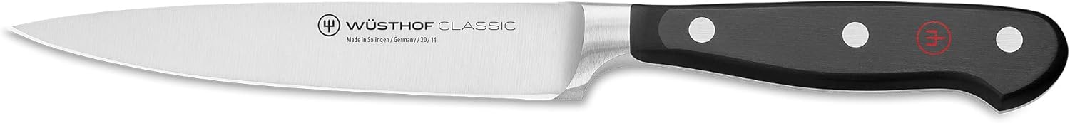 Wüsthof Classic Messer überzeugen mit zeitlosem Design und zuverlässiger Leistung. Sie sind pflegeleicht und bieten mit dem großen Sortiment für jeden Food-Fan das richtige Koch-Werkzeug – z.B. dieses kurze Messer mit 14 cm Klinge für sehr feine Schnitte Braten, Schinken oder Geflügel, egal ob rohes oder gekochtes Fleisch, zerteilt und portioniert das scharfe Fleischmesser (Tranchiermesser) mit der schmalen, festen Klinge exakt und mühelos und eignet sich auch zum Zerteilen von Früchten mit weicher Haut Die ultrascharfe Klinge wird aus einem Stück Wüsthof Stahl geschmiedet, auf 58° Rockwell gehärtet und wird im laserbasierten Schärfverfahren geschliffen, bevor sie per Hand ihren finalen Polierabzug erhält – und somit ihre extreme, langanhaltende Schärfe Ein gutes Messer mit rutschfesten Griffen aus Spezialkunststoff. Sie sind mit Edelstahlnieten dreifach vernietet, fugenlos montiert und sehr hygienisch. Der ergonomische Griff liegt gut in der Hand und unterstützt ermüdungsfreies, sicheres Schneiden Dieses hochwertige Messer für den Profikoch und Hobbykoch ist in vielen Ausführungen mit Klingenlängen von 14 cm bis 26 cm erhältlich. Ein Markenmesser eines echten Traditionsunternehmens: Wüsthof – Made in Germany, geschmiedet in Solingen | قیمت یورویی : 75€