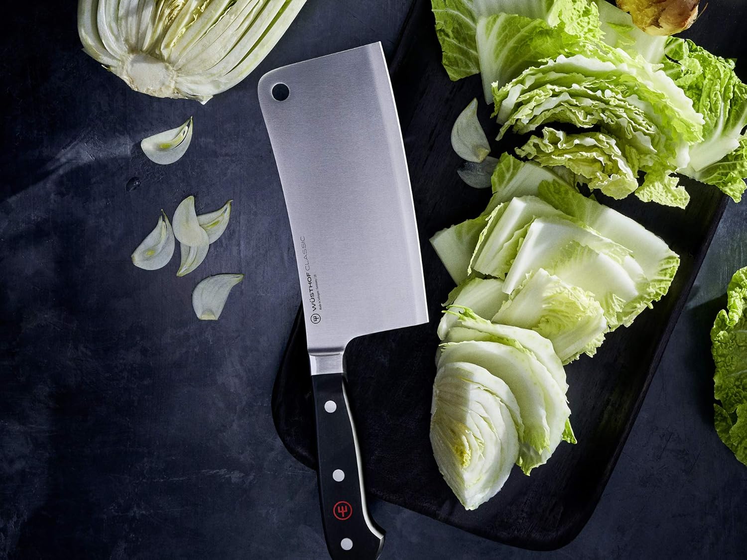 Die Wüsthof Classic Messerserie überzeugt mit zeitlosem Design und zuverlässiger Leistung. Sie ist pflegeleicht und bietet mit ihrem großen Sortiment jedem Food-Fan das ideale Koch-Werkzeug – z.B. dieses kräftige Profi-Hackmesser für Knochen und Fleisch Das große Klingenblatt und die starke Klinge erfüllen höchste Ansprüche an Härte und Kraft. So ist das Fleischer-Beil ideal zum Zerteilen von Rippen, Koteletts, Knochen oder auch extrem hartschaligem Obst (Kokosnuss) – das ultimative Werkzeug zum Hacken Die widerstandsfähige Klinge wird aus einem Stück Wüsthof Stahl geschmiedet und auf 58° Rockwell gehärtet. Der kleine Kropf (Verdickung zwischen Klinge und Griff) verringert das Gewicht, sodass das große Messer überraschend leicht in der Hand liegt Ein gutes Küchenmesser mit rutschfesten Griffen aus Spezialkunststoff. Sie sind mit Edelstahlnieten dreifach vernietet, fugenlos montiert und sehr hygienisch. Der ergonomische Griff liegt gut in der Hand und unterstützt ermüdungsfreies, sicheres Schneiden Dieses rundum stabile Qualitäts-Messer von Wüsthof ist ideal ausbalanciert, unterstützt sicheres Arbeiten und ist somit ideal für die tägliche Küchenarbeit. Ein Markenmesser eines echten Traditionsunternehmens: Made in Germany – geschmiedet in Solingen | قیمت یورویی : 202.95€