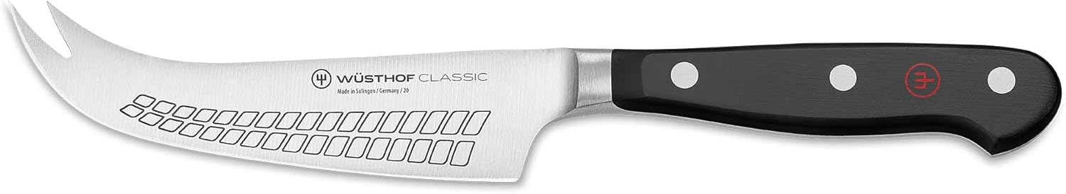 Die Wüsthof Classic Messerserie überzeugt mit zeitlosem Design und zuverlässiger Qualität. Sie ist pflegeleicht und bietet mit ihrem großen Sortiment für jeden Food-Fan das richtige Küchen-Werkzeug – z.B. das Spezialmesser für Käse-Liebhaber Das Messer schneidet mühelos harten Käse wie Gruyère, Comté und Bergkäse oder Schnittkäse wie Gouda und mit der Spitze nehmen Sie ihn gekonnt wieder auf. Die Spezialätzung auf der Klinge vermeidet zudem das Anhaften – ideal für Picknick und zu Tisch Die stabile und scharfe Klinge wird aus einem Stück Wüsthof Stahl geschmiedet, auf 58° Rockwell gehärtet und wird im laserbasierten Schärfverfahren geschliffen, bevor sie per Hand ihren finalen Polierabzug erhält – und dauerhaft für saubere Schnitte sorgt Ein gutes Küchenmesser mit rutschfesten Griffen aus Spezialkunststoff. Sie sind mit Edelstahlnieten dreifach vernietet, fugenlos montiert und sehr hygienisch. Der ergonomische Griff liegt gut in der Hand und unterstützt ermüdungsfreies, sicheres Schneiden Dieses rundum stabile Qualitäts-Messer von Wüsthof ist ideal ausbalanciert, unterstützt sicheres Arbeiten und ist somit ideal für die tägliche Küchenarbeit. Ein Markenmesser eines echten Traditionsunternehmens: Made in Germany – geschmiedet in Solingen | قیمت یورویی : 109€