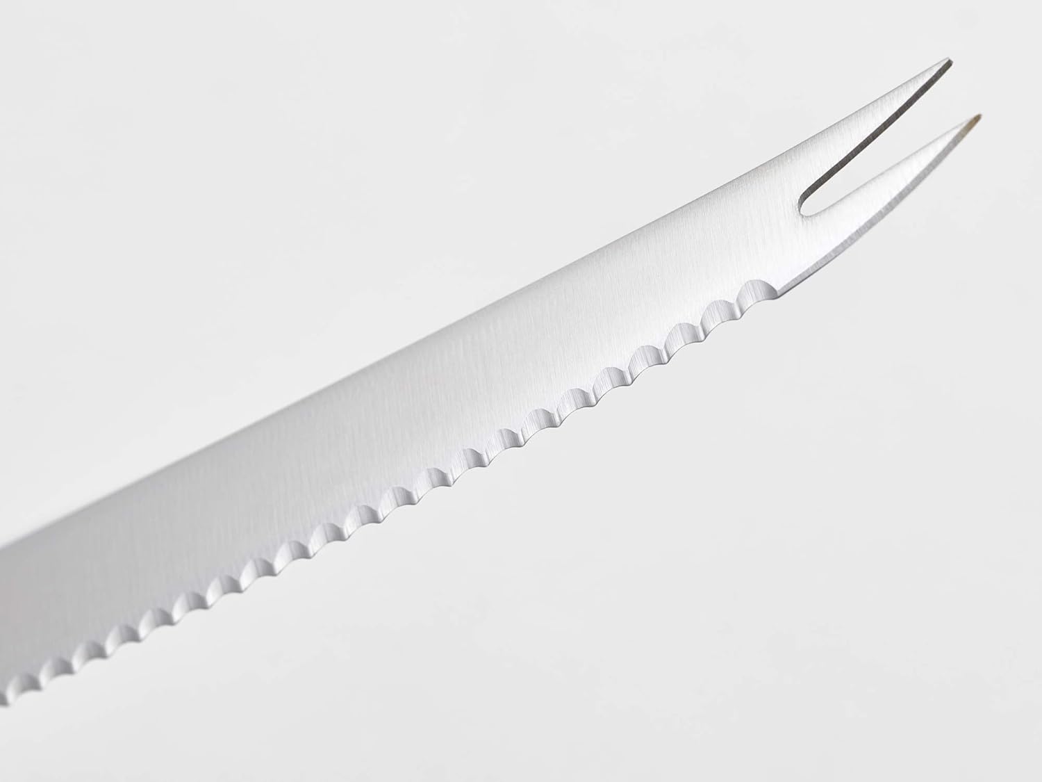 Mit Gourmet hat Wüsthof Messer Basics im Angebot, die als scharfe Kochmesser nicht nur durch richtig gute Qualität und einen günstigen Preis begeistern, sondern als zuverlässige Solinger Messer – so wie dieses vielseitige Universalmesser z.B. für Tomaten Gemüsemesser mit Spezial-Welle – für glatte Schnitte durch Obst oder Gemüse mit harter Schale und weichem Inneren, wie Trauben oder Tomaten – auch als Brötchenmesser oder Aufschnittmesser zum Frühstück. Mit der gegabelten Spitze ideal für die Brotzeit Scharf und stabil – die ausgelaserte Messerklinge wird in 35 Arbeitsgängen so verarbeitet, dass sie durch eine Härte von 56° Rockwell und der Verlängerung unter dem Griff mit der Stabilität und Schärfe geschmiedeter Profi Küchenmesser vergleichbar ist Agil und spülmaschinengeeignet – der ergonomische Griff aus Spezialkunststoff ist 3-fach vernietet und absolut pflegeleicht. Dank des geringen Gewichts ermöglicht das Küchenmesser Profi Messer präzises, schwungvolles Schneiden – also viel Spaß in der Küche Wüsthof Gourmet überzeugt durch ein sehr gutes Preis-Leistungsverhältnis und ist als Starterset für den Privat-Haushalt ebenso interessant wie als Grundausstattung für die Gastronomie (Profiküche). Küchen Messer – Made in Germany, hergestellt in Solingen | قیمت یورویی : 42€