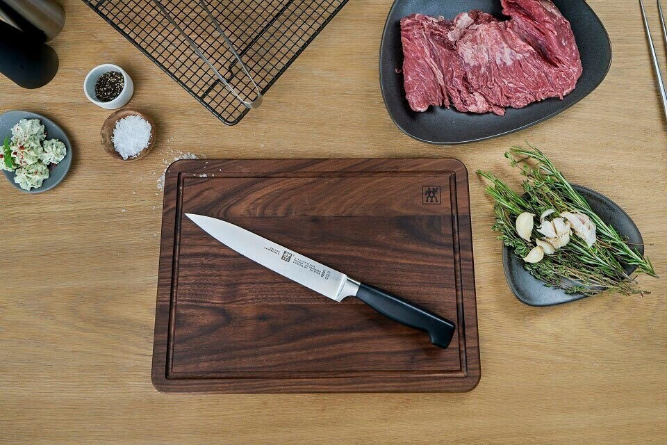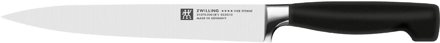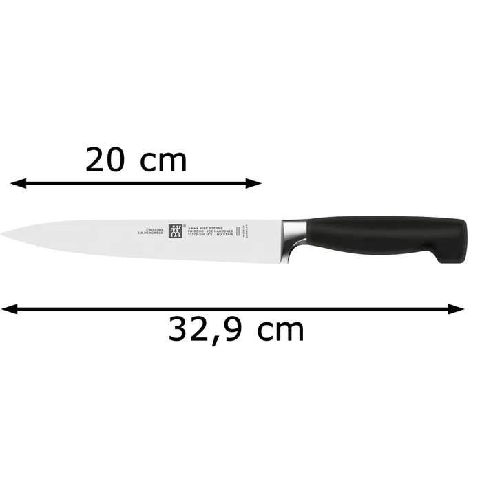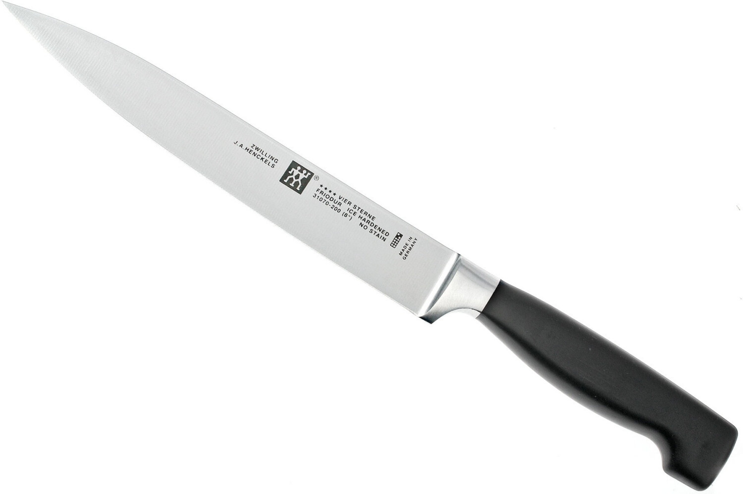 چاقو تکی برش ژامبون zwilling vier sterne، با تیغه فولادی ضد زنگ و دسته ارگونومیک، ابزاری حرفهای برای برش نازک و دقیق ژامبون، گوشت و مواد غذایی نرم است. طراحی تخصصی این چاقو باعث میشود که برشها یکدست و بدون له شدن مواد غذایی انجام شوند.