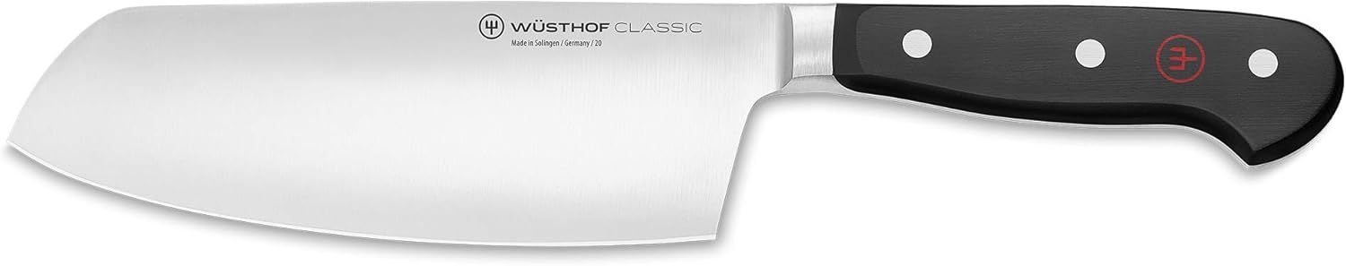 Die Wüsthof Classic Messerserie überzeugt mit zeitlosem Design und zuverlässiger Leistung. Sie ist pflegeleicht und bietet mit ihrem großen Sortiment für jeden Food-Fan das richtige Koch-Werkzeug – z.B. dieses asiatische Kochmesser für Fleisch und Gemüse Das breite, asiatische Messer kombiniert das japanisches Santoku mit chinesischem Kochmesser. Die gebogene Form eignet sich ideal zum Schneiden und Hacken sowie für sicheren Wiegeschnitt – die filigrane Klinge bitte nicht zum Hacken von Knochen verwenden Die ultrascharfe Klinge wird aus einem Stück Stahl geschmiedet. Der dünne Schliff und kleine Kropf (Verdickung vor dem Griff) verringern das Gewicht, sodass es verblüffend leicht in der Hand liegt und über die gesamte Länge nachgeschliffen werden kann Ein gutes Küchenmesser mit rutschfesten Griffen aus Spezialkunststoff. Sie sind mit Edelstahlnieten dreifach vernietet, fugenlos montiert und sehr hygienisch. Der ergonomische Griff liegt gut in der Hand und unterstützt ermüdungsfreies, sicheres Schneiden Dieses rundum stabile Qualitäts-Messer von Wüsthof ist ideal ausbalanciert, unterstützt sicheres Arbeiten und ist somit ideal für die tägliche Küchenarbeit. Ein Markenmesser eines echten Traditionsunternehmens: Made in Germany – geschmiedet in Solingen | قیمت یورویی : 113.76€