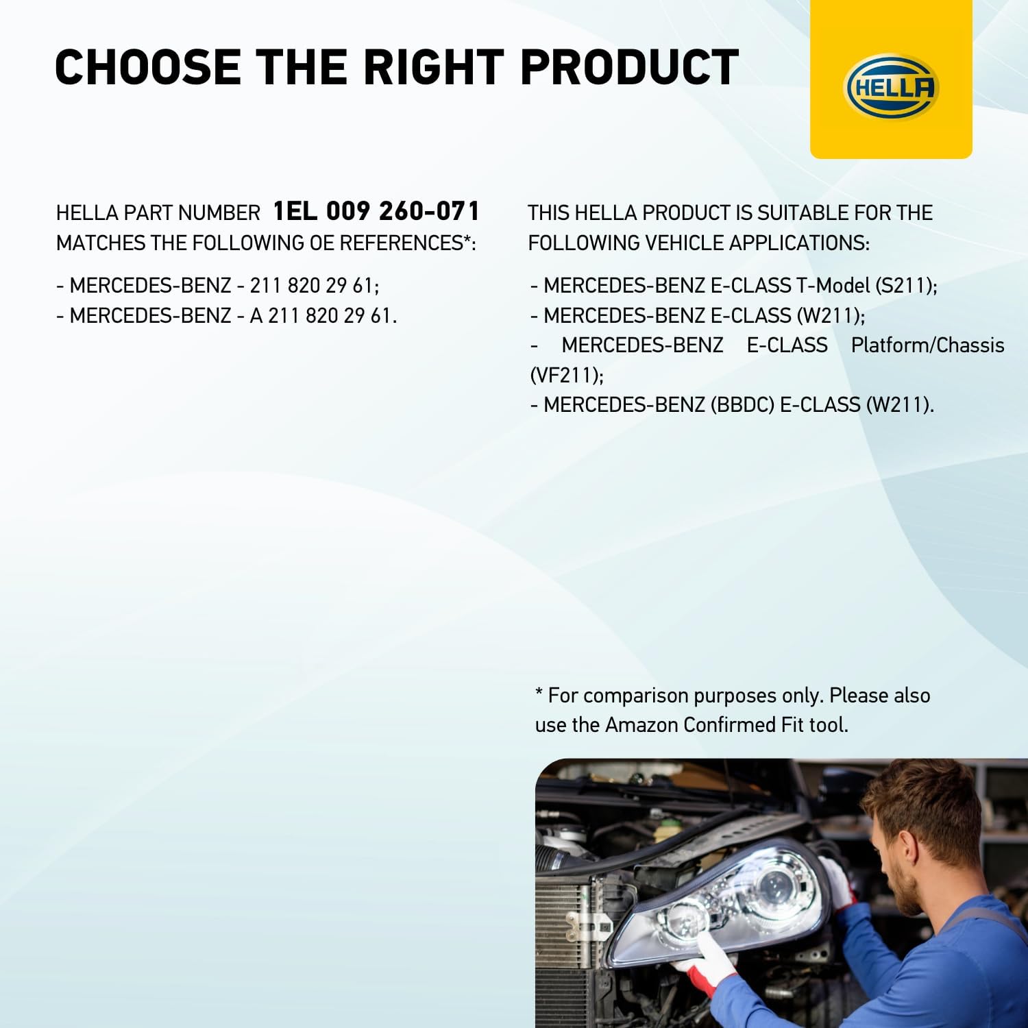 چراغ جلو هالوژن HELLA 1EL 009 260-071 - برای مرسدس بنز کلاس E (W211) - ECE/CCC - برای ترافیک سمت راست - هالوژن چپ چپ