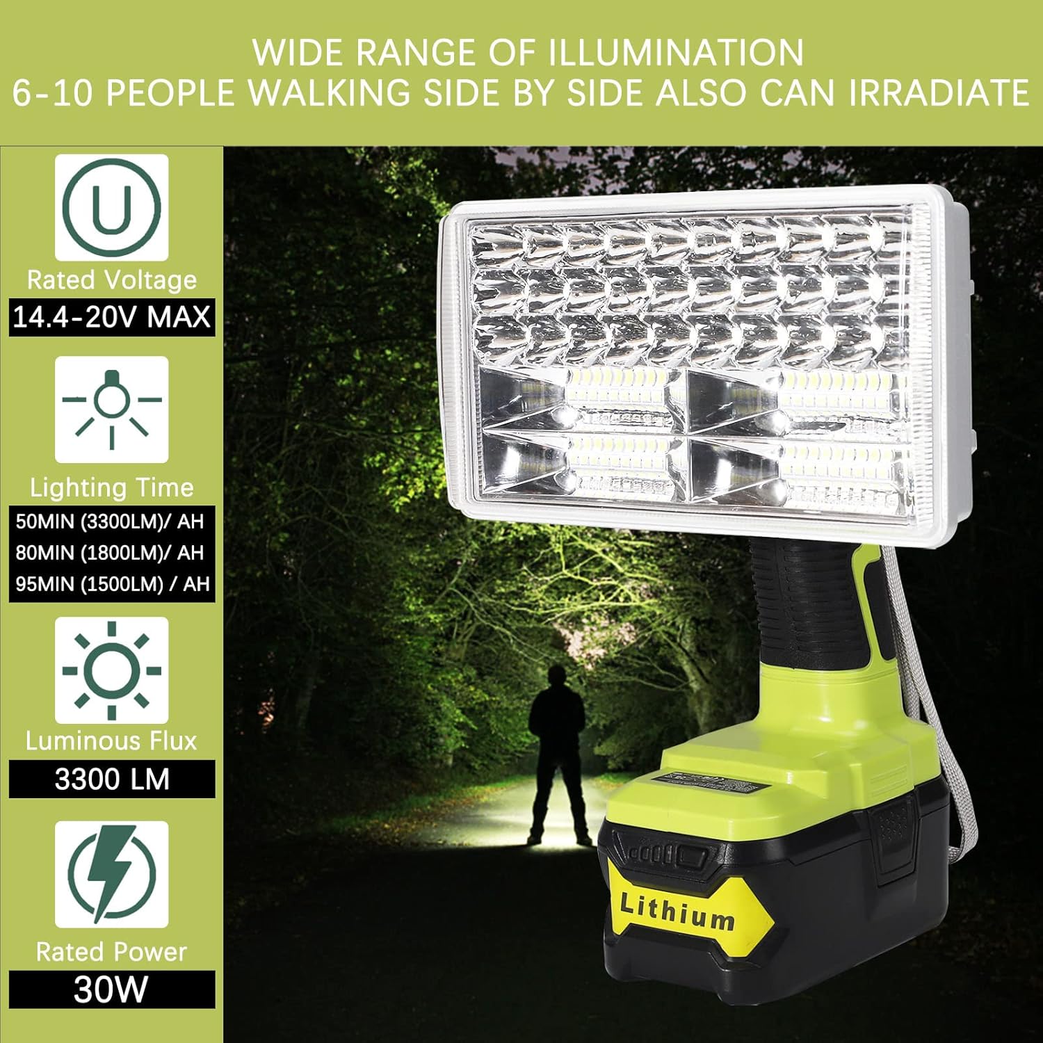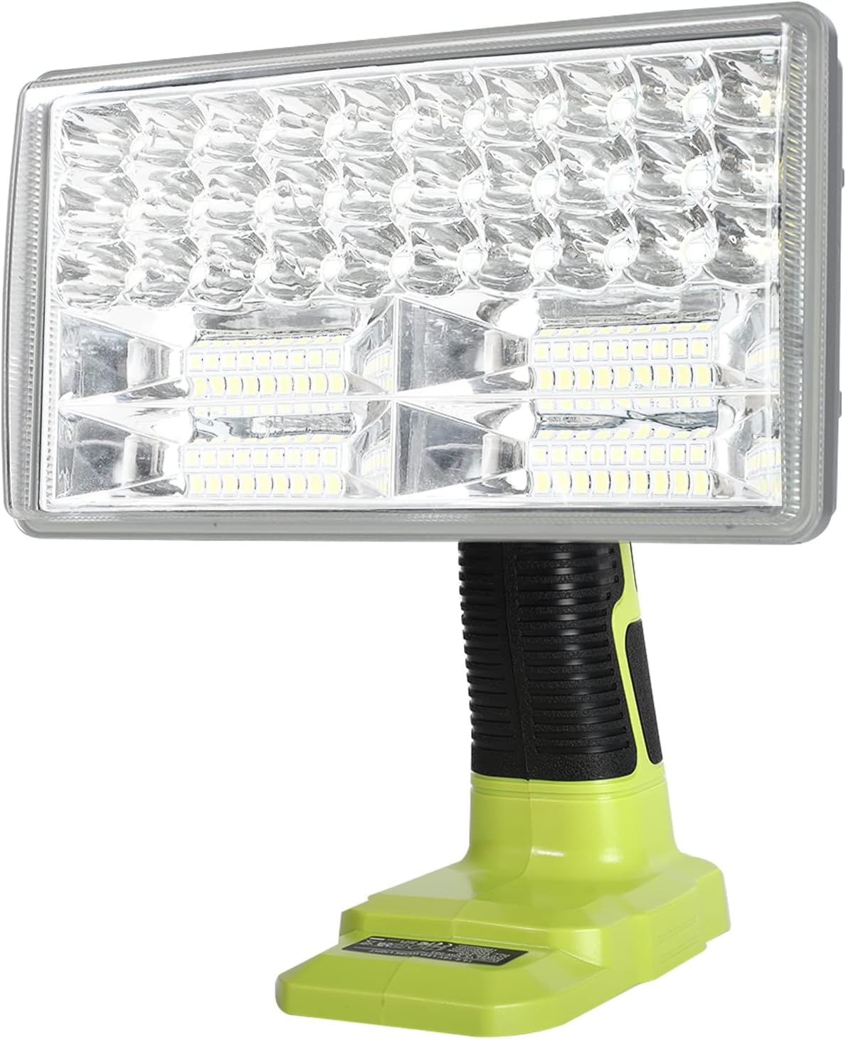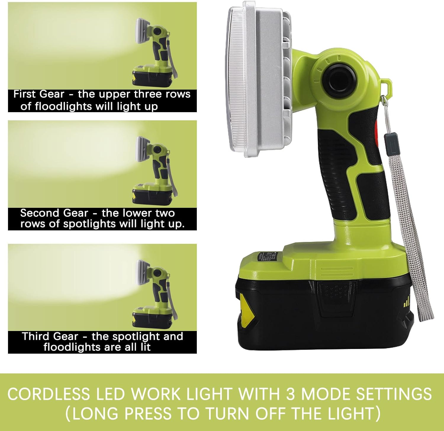 🌲【BETRIEBEN DURCH RYOBI-BATTERIE】Kabellose LED-Arbeitsleuchte, kompatibel mit Ryobi 18V ONE + Lithium-Ionen-NiCd-NiMh-Batterien P102 P103 P104 P105 P107 P108 P109 P190 und mehr. (Batterie nicht enthalten). 🌲【LED-ARBEITSLEUCHTE MIT 3 EINSTELLUNGEN】►Kurzes Drücken der Schaltertaste beim 1. Mal, die oberen drei Reihen von Scheinwerfern leuchten auf. ►Beim 2. Mal leuchten die unteren beiden Strahlerreihen. ►Beim 3. Mal leuchten Scheinwerfer und Flutlicht. LANGE DRÜCKEN, UM DAS LICHT AUSZUSCHALTEN. 🌲【FLEXIBLES DESIGN】①Der um 110 Grad schwenkbare Kopf bietet Vielseitigkeit für die Beleuchtung von Arbeitsflächen. Licht, das in mehrere Richtungen projiziert werden soll. ②66 LED-Perlen-Design, superhell. ③Praktische Handschlaufe erleichtert das Mitnehmen.④Robustes und langlebiges Zinklegierungsmaterial, luxuriöses und temperamentvolles Werkzeugarbeitslicht. 🌲【ZUVERLÄSSIGKEIT】YEX-BUR 30W 3300LM wiederaufladbare Arbeitsleuchte wurde CE- und FCC-zertifiziert, um strenge Sicherheitsteststandards zu erfüllen. Bietet mehrfachen Schutz vor Überlastung, Überstrom, Überhitzung und Niederspannung für Sie und Ihre Geräte. 🌲【BREITE ANWENDUNGEN】 für Ryobi Außenstrahler 18V kann im Arbeitsbereich der Dunkelheit, im Keller, in der Tiefgarage, beim Wandern, Camping, Jagen, Erkunden, Grillen, Gehen mit Hunden und Notlichtern für Stromausfall zu Hause usw. verwendet werden. | قیمت یورویی : 68.99€