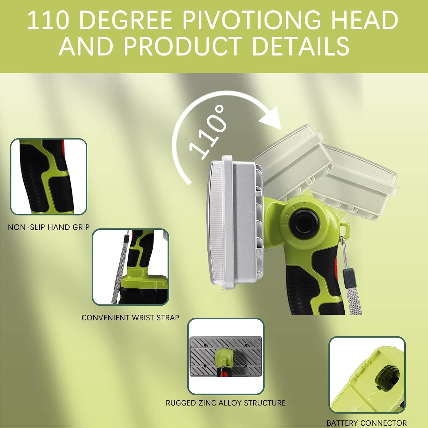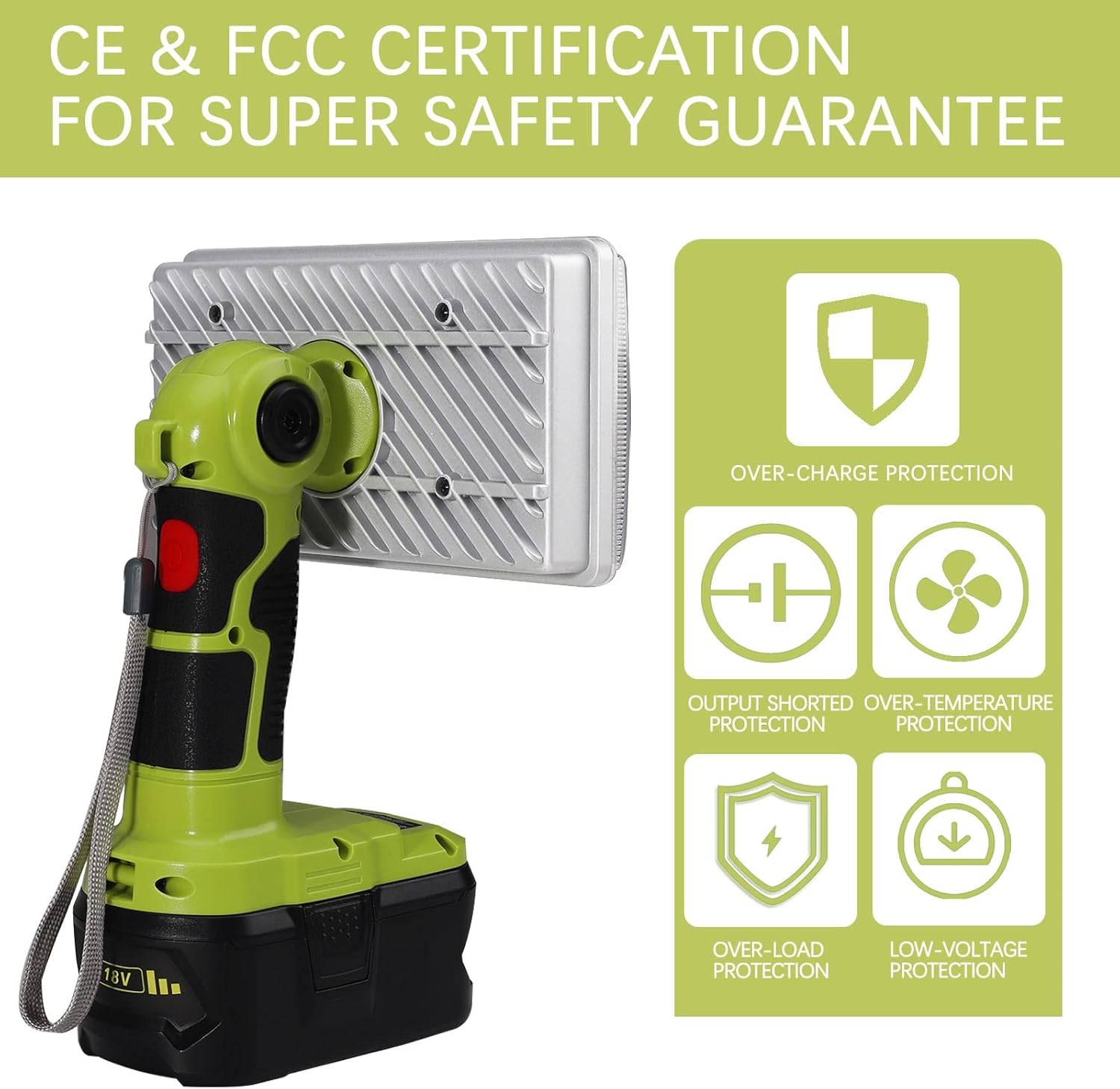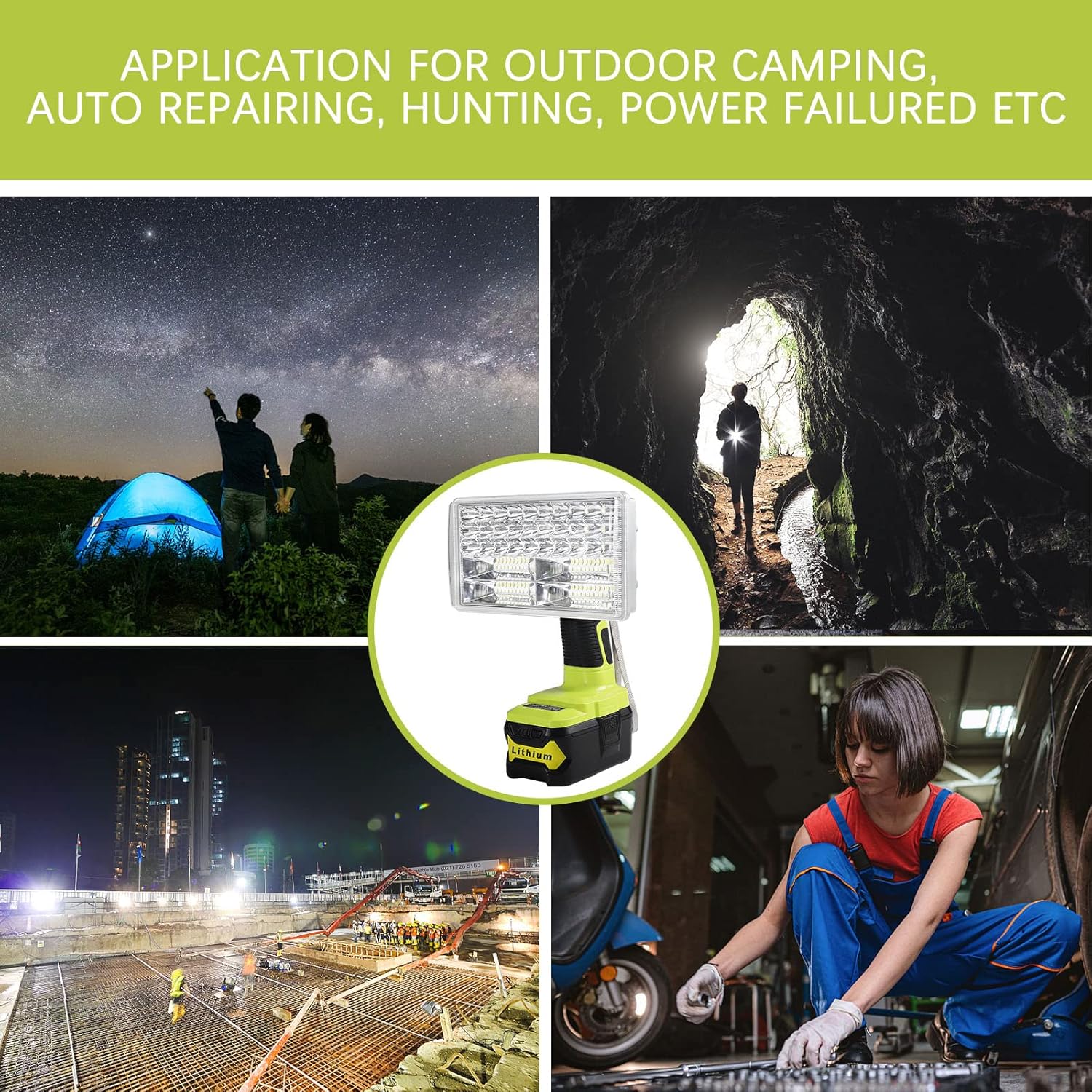 🌲【BETRIEBEN DURCH RYOBI-BATTERIE】Kabellose LED-Arbeitsleuchte, kompatibel mit Ryobi 18V ONE + Lithium-Ionen-NiCd-NiMh-Batterien P102 P103 P104 P105 P107 P108 P109 P190 und mehr. (Batterie nicht enthalten). 🌲【LED-ARBEITSLEUCHTE MIT 3 EINSTELLUNGEN】►Kurzes Drücken der Schaltertaste beim 1. Mal, die oberen drei Reihen von Scheinwerfern leuchten auf. ►Beim 2. Mal leuchten die unteren beiden Strahlerreihen. ►Beim 3. Mal leuchten Scheinwerfer und Flutlicht. LANGE DRÜCKEN, UM DAS LICHT AUSZUSCHALTEN. 🌲【FLEXIBLES DESIGN】①Der um 110 Grad schwenkbare Kopf bietet Vielseitigkeit für die Beleuchtung von Arbeitsflächen. Licht, das in mehrere Richtungen projiziert werden soll. ②66 LED-Perlen-Design, superhell. ③Praktische Handschlaufe erleichtert das Mitnehmen.④Robustes und langlebiges Zinklegierungsmaterial, luxuriöses und temperamentvolles Werkzeugarbeitslicht. 🌲【ZUVERLÄSSIGKEIT】YEX-BUR 30W 3300LM wiederaufladbare Arbeitsleuchte wurde CE- und FCC-zertifiziert, um strenge Sicherheitsteststandards zu erfüllen. Bietet mehrfachen Schutz vor Überlastung, Überstrom, Überhitzung und Niederspannung für Sie und Ihre Geräte. 🌲【BREITE ANWENDUNGEN】 für Ryobi Außenstrahler 18V kann im Arbeitsbereich der Dunkelheit, im Keller, in der Tiefgarage, beim Wandern, Camping, Jagen, Erkunden, Grillen, Gehen mit Hunden und Notlichtern für Stromausfall zu Hause usw. verwendet werden. | قیمت یورویی : 68.99€
