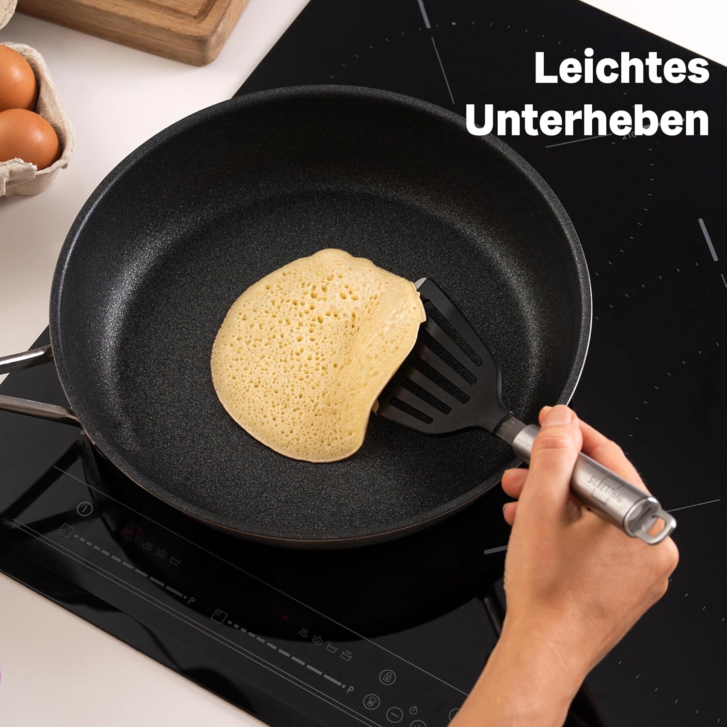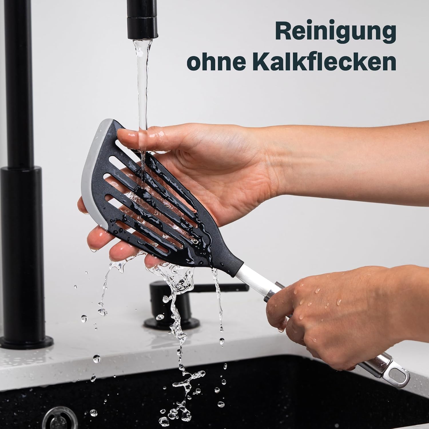 ✔Perfekter Allrounder – Das Küchenutensil, das in der Wohnung nicht fehlen darf und kompromisslos alles erledigt. Der Wender ist ideal für Spiegelei, Fisch oder für Pfannkuchen. ✔ Restlos sauber – Mit der smarten Silikonlippe, sind Pfannen und Töpfe nach dem Ausschaben bis auf den letzten Tropfen sauber. Außerdem schützt das Silikon Pfannen & Töpfe vor Kratzern. ✔ Kein Verbiegen & dennoch flexibel – Die Griffe vom Kochbesteck Set besteht aus widerstandsfähigem Edelstahl (18/8), passt sich der Handform ideal an und gibt bei Kraftausübungen oder der Schwere deines Gerichts nicht ungewollt nach. ✔ Hitzebeständig – bestehend aus hochqualitativem Edelstahl und hitzebeständigem Plastik (BPA-frei), kann das Kochbesteck bei Temperaturen bis 200 °C eingesetzt werden. ✔ Spülmaschinenfest – Das Küchen Zubehör ist 100 % spülmaschinenfest und bekommt auch nach mehreren Gängen keine Wasserflecken. | قیمت یورویی : 9.95€