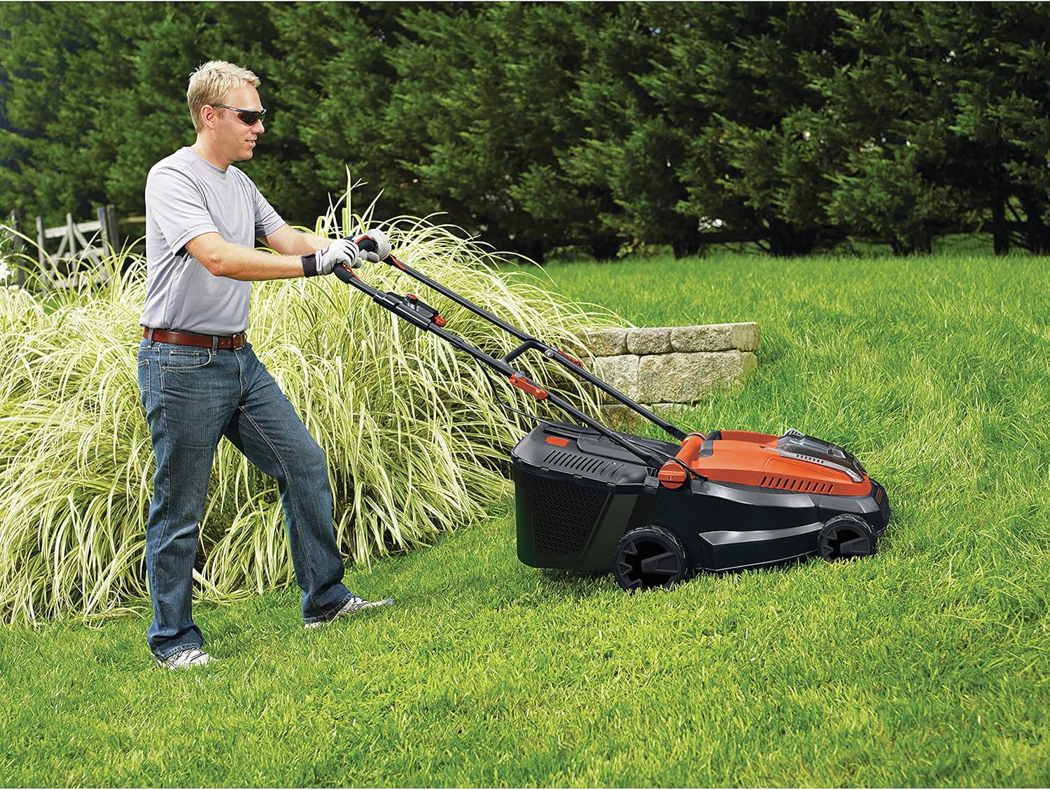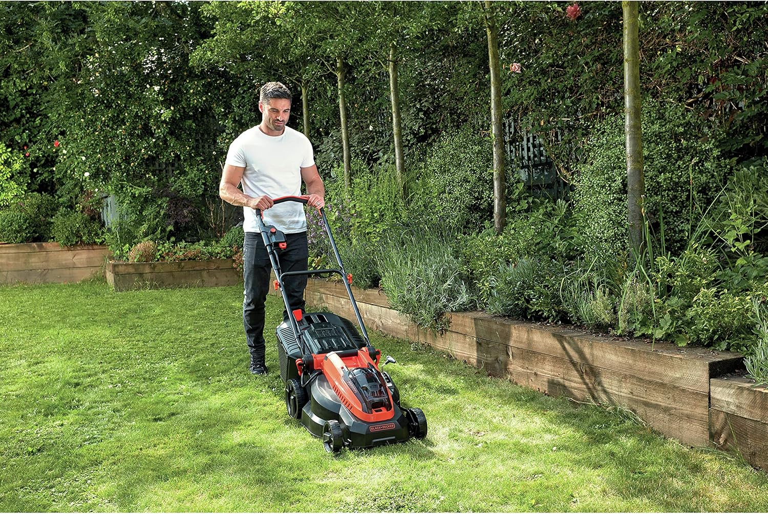چمن زنی شارژی Black+Decker CLM3825L2 (36 ولت، 2.5 آمپر ساعت، عرض برش 38 سانتی متر، برای چمن های بزرگ تا 600 متر مربع، تنظیم ارتفاع در 6 جهت، شامل 2 باتری، شارژر، علف گیر 35 لیتری)