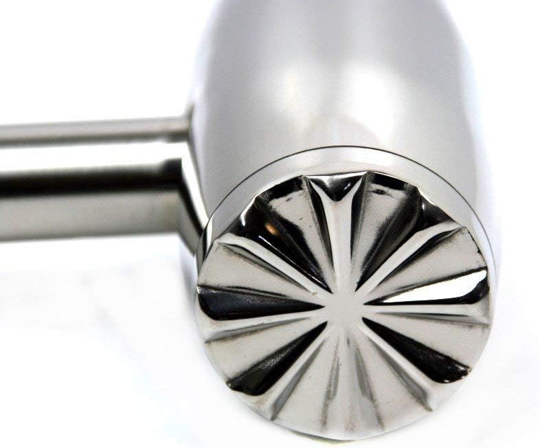 Inhalt: 1x Fleischklopfer Edelstahl (Länge 34 cm, Höhe 10,8 cm, Ø 4,3 cm) - Artikelnummer: 1873086040 Material: Cromargan Edelstahl 18/10, teilmattiert. Rostfrei, spülmaschinengeeignet, formstabil, hygienisch, säurefest und unverwüstlich Die flache Schlagfläche des Fleischhammers dient zum Planieren und die genoppte Fläche zum Aufrauhen der Fleischstücke. Der Klopfer liegt gut in der Hand, sodass nicht viel Kraft bei der Benutzung aufwenden müssen. Schnitzel, Koteletts und Steaks sind so im Handumdrehen vorbereitet Die Funktionsteile sind fest im Griff einzementiert. Mit praktischer Öse zur Aufbewahrung an einer Hängeleiste mit Haken | قیمت یورویی : 36.06€