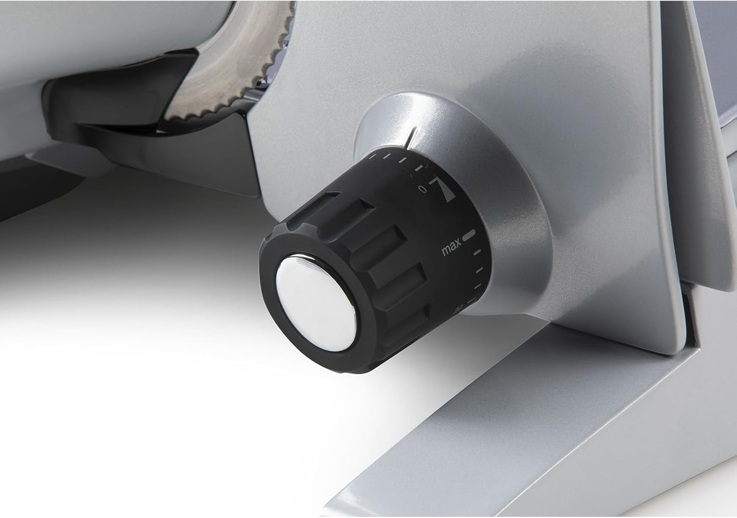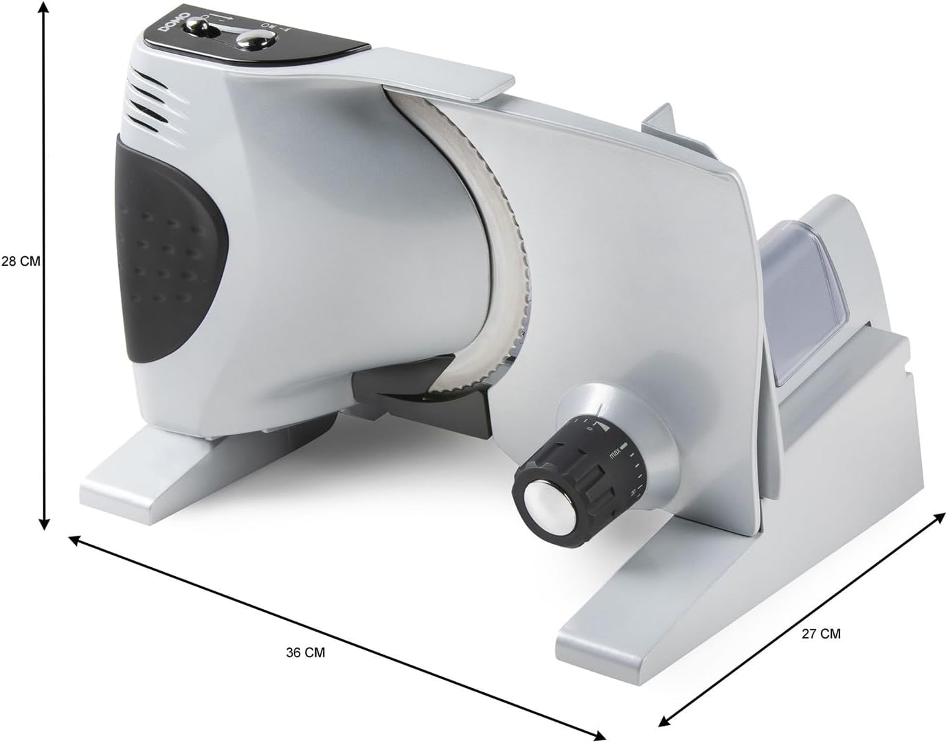 Edelstahlmesser mit Wellenschliff (Ø 19cm) Aluminiumgehäuse Stufenloses Verstellen der Schnittstärke (0-30mm) Mit Kunststoff-Auffangschale DC-Motor Sicherheitsschalter Optional glattes Messer für Schinken etc. 230 V - 50 Hz - 100 W | قیمت یورویی : 139.99€