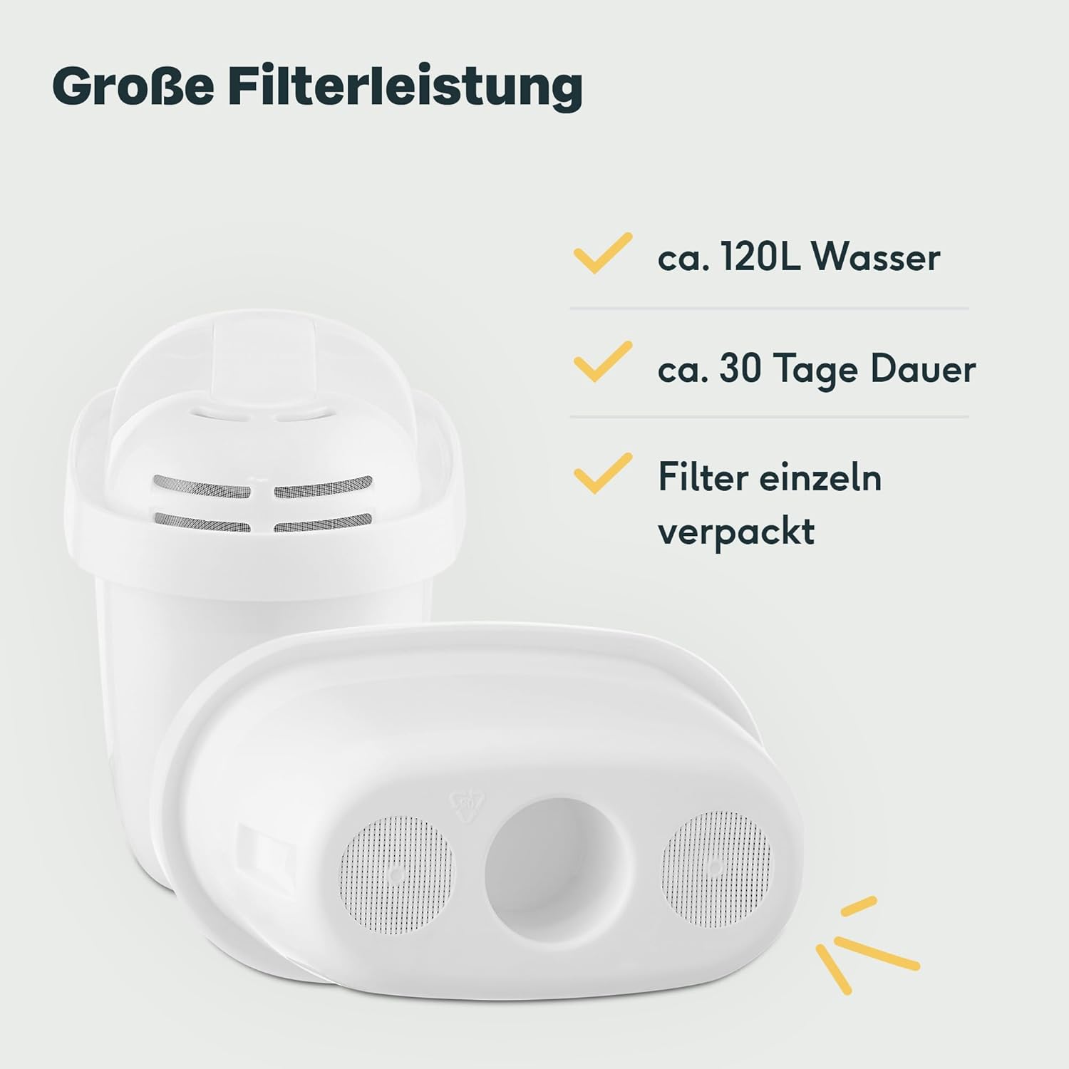 ✔ Guter Geschmack – für den besten Kaffee- und Teegenuss empfehlen Baristas gefiltertes Wasser, das die unterschiedlichen Wassergeschmäcker je nach Region ausgleicht. Auch für Babynahrung, zum Kochen oder zum Filtern von Wasser für Pflanzen. ✔ Schutz vor Verkalkung – Durch die Reduzierung von Kalk, Chlor und anderen Verunreinigungen vom Leitungswasser bleiben Geräte wie der Wasserkocher oder die Kaffeemaschine länger frisch und sauber. ✔ Kompatibel mit Brita Maxtra, Amazon Basics, und der SILBERTHAL Filterkanne aus Glas und ähnlichen Filterkannen für Trinkwasser ✔ Lebensdauer deiner Maschinen verlängern – Je nach Wasserhärte und Verschmutzungsgrad können 120–160 Liter gefiltert werden. Wir empfehlen aus hygienischen Gründen die Kartusche spätestens 1 Mal im Monat zu wechseln. Dafür ist einer manueller Kalender zur Erinnerung auf dem Deckel. ✔ Ressourcen sparen – Weniger Einwegflaschen und lästiges Schleppen von Wasser. Das Pack mit 3 Kartuschen reicht für ein halbes Jahr. Auch im 6er-Pack verfügbar. | قیمت یورویی : 17.95€