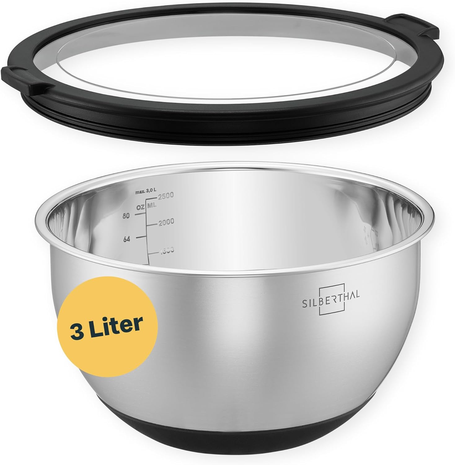 SILBERTHAL Edelstahl Schüssel mit Deckel - 3l Rührschüsseln zum Servieren, Kochen, Backen, Aufbewahren - Rutschfester Boden | قیمت یورویی 19.95€