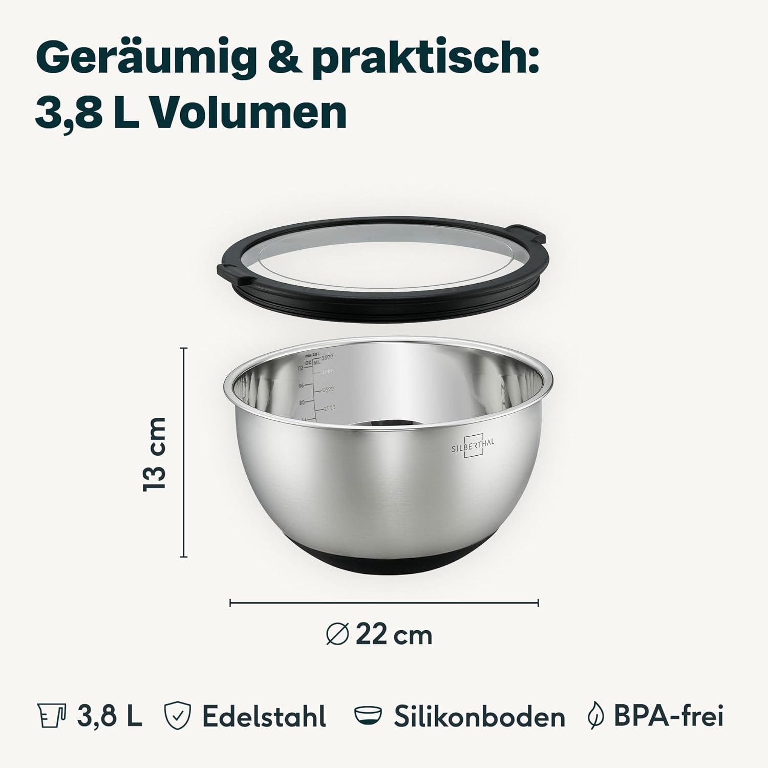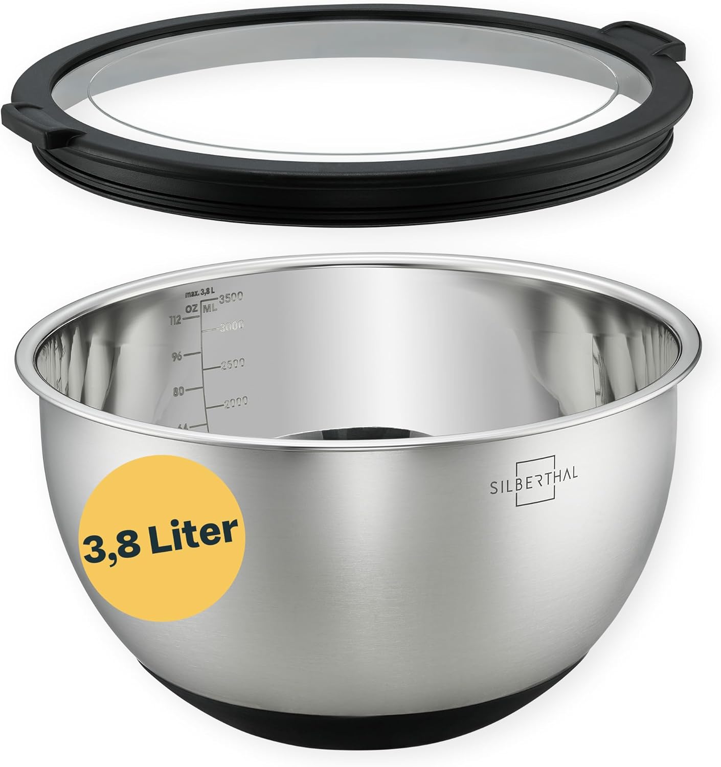 SILBERTHAL Edelstahl Schüssel mit Deckel - 3,8l Rührschüsseln zum Servieren, Kochen, Backen, Aufbewahren - Rutschfester Boden | قیمت یورویی 21.95€