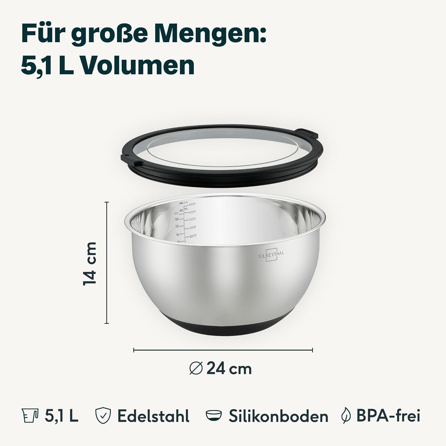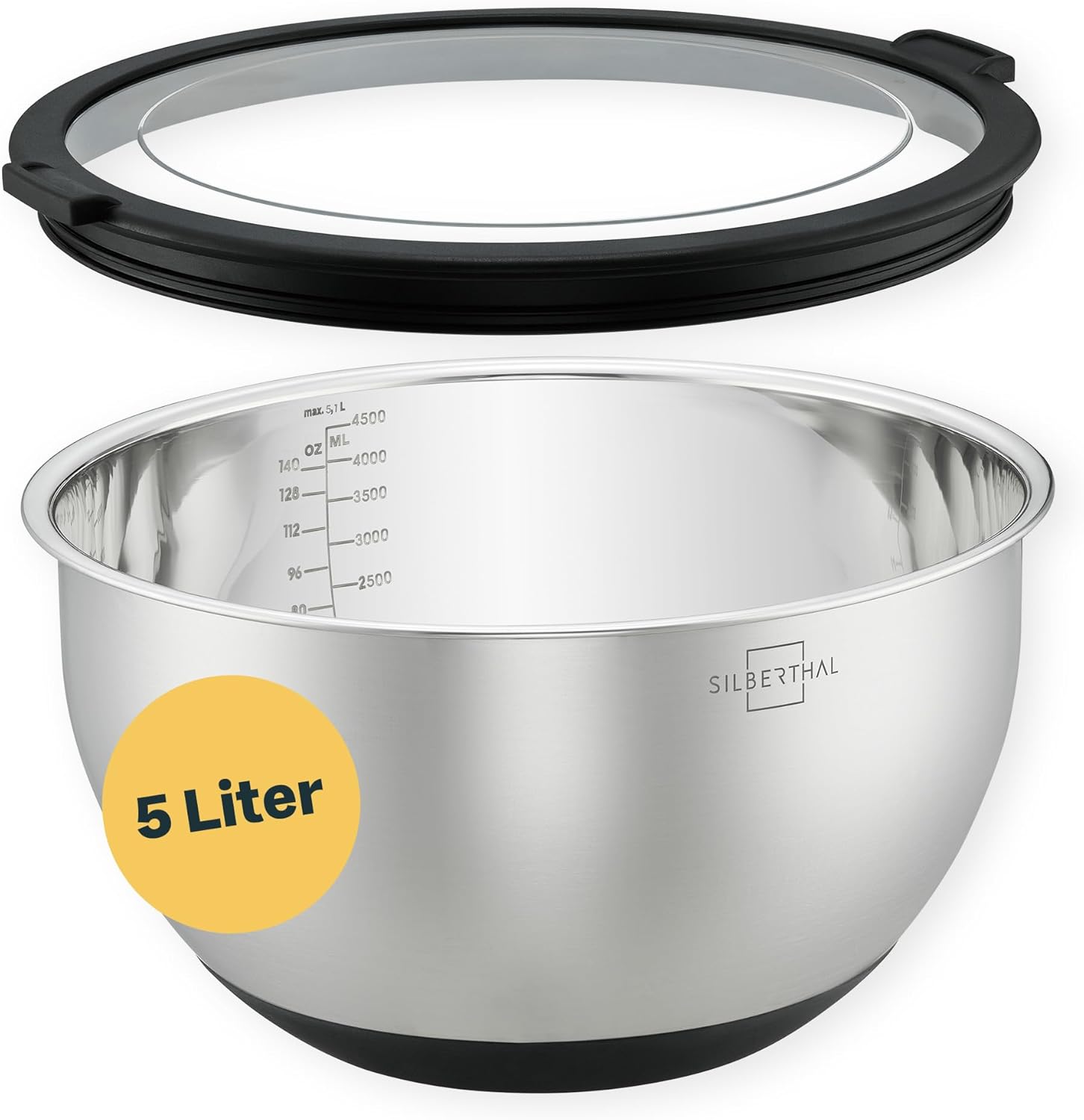 SILBERTHAL Edelstahl Schüssel mit Deckel - 5l Rührschüsseln zum Servieren, Kochen, Backen, Aufbewahren - Rutschfester Boden | قیمت یورویی 23.95€