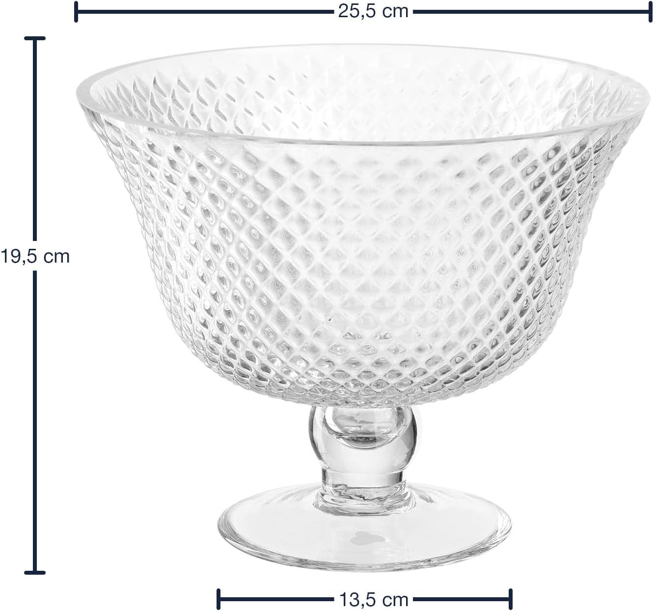 Klassisches Design: Die Dekovase mit Fuß kombiniert zeitlose Eleganz mit einem Hauch von Nostalgie, was sie zu einem stilvollen und vielseitigen Dekorationsstück macht Stabiler Stand: Dank des stabilen Fußes bietet die Vase eine sichere Basis für frische Blumenarrangements oder andere dekorative Elemente und gewährleistet, dass sie fest auf Ihrem Tisch oder Ihrer Kommode steht Vielseitige Verwendung: Die Vase mit Fuß eignet sich nicht nur für frische Blumen, sondern kann auch als hübsche Aufbewahrung für Trockenblumen, Zweige oder kreative Dekorationsideen genutzt werden Dekorative Ergänzung: Ob als Einzelstück oder in Kombination mit anderen Vasen oder Dekoartikeln, diese Vase verleiht Ihrer Inneneinrichtung eine besondere Note und ist ein Blickfang in jedem Raum Lieferumfang & Maße: 1 Dekoschale mit Fuss, Glasvase für Blumen, Maße: 19,5 x 25,5 x 25,5 cm (HxBxT), Durchmesser Fuß 13,5 cm, Durchmesser oben 25,2 cm, Nutzvolumen 2700 ml, Volumen randvoll 3300 ml, Gewicht: 1,32 kg | قیمت یورویی : 38.33€
