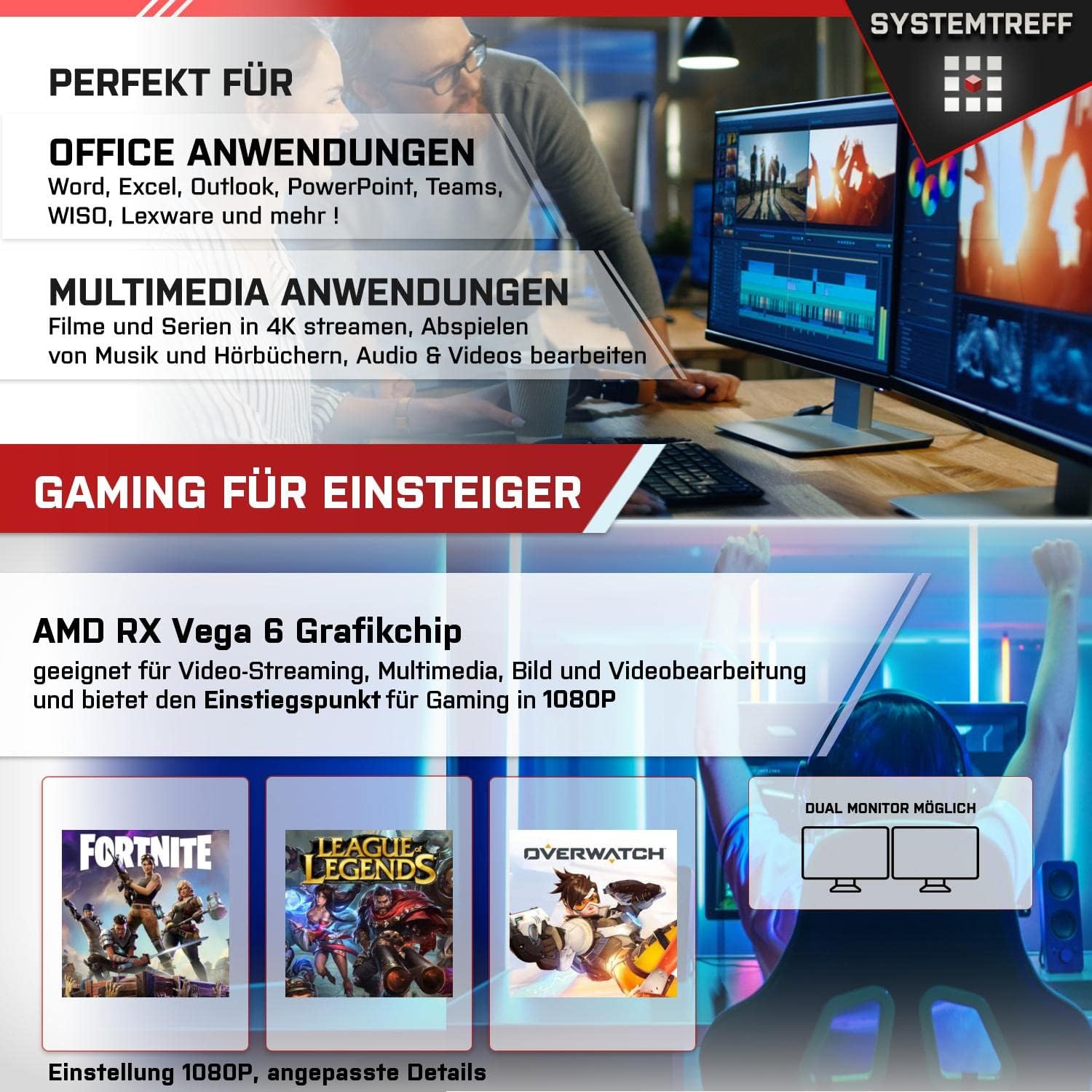 Made in Germany! Unser Gaming-PC für Einsteiger ist der perfekte Startpunkt für alle, die in die Welt der Videospiele eintauchen möchten. Dieses Modell, zusammengestellt von unserem erfahrenen IT-Team, eignet sich ideal für das Spielen von Einsteiger- und Casual-Spielen. Wir stehen voll hinter der Qualität unserer Produkte. Mit Windows 11 Pro vorinstalliert, sind Sie sofort bereit für Ihre ersten Gaming-Erfahrungen. Ihr Einsteiger Gaming PC punktet mit einem AMD Ryzen 3 4300G 4x4GHz und 16GB 3200MHz RAM, eine Kombination, die speziell für reibungslose Leistung unter Windows 11 optimiert ist. Diese Ausstattung ist ideal für die Anforderungen beliebter Spielgenres wie First-Person-Shooter, Rollenspiele und Online-Gaming. Mit diesem PC sind Sie bestens vorbereitet, um in die vielfältigen Welten des Gamings einzutauchen. Um ausreichenden Speicherplatz für Ihre Daten zu bieten, stellen wir eine schnelle 1000 GB M.2 NVMe Festplatte, auf der Windows 11 sowie alle essentiellen Treiber vorinstalliert sind. Mit seiner umfassenden Auswahl an Anschlüssen, darunter Audio, LAN, PS2, USB 3.2, USB 2.0, HDMI, DVI-D, erweist sich das Mainboard als idealer Allrounder, perfekt geeignet für Streaming und Gaming. Der integrierte Grafikchip AMD RX Vega 6 sorgt für hervorragende Bildqualität, die über die Displayausgänge des Mainboards bereitgestellt wird. In unseren Systemen verwenden wir ausschließlich hochwertige Komponenten renommierter Hersteller. Jedes System unterzieht sich vor der Auslieferung einem gründlichen Test, um seine einwandfreie Funktionalität zu gewährleisten. | قیمت یورویی : 434.9€