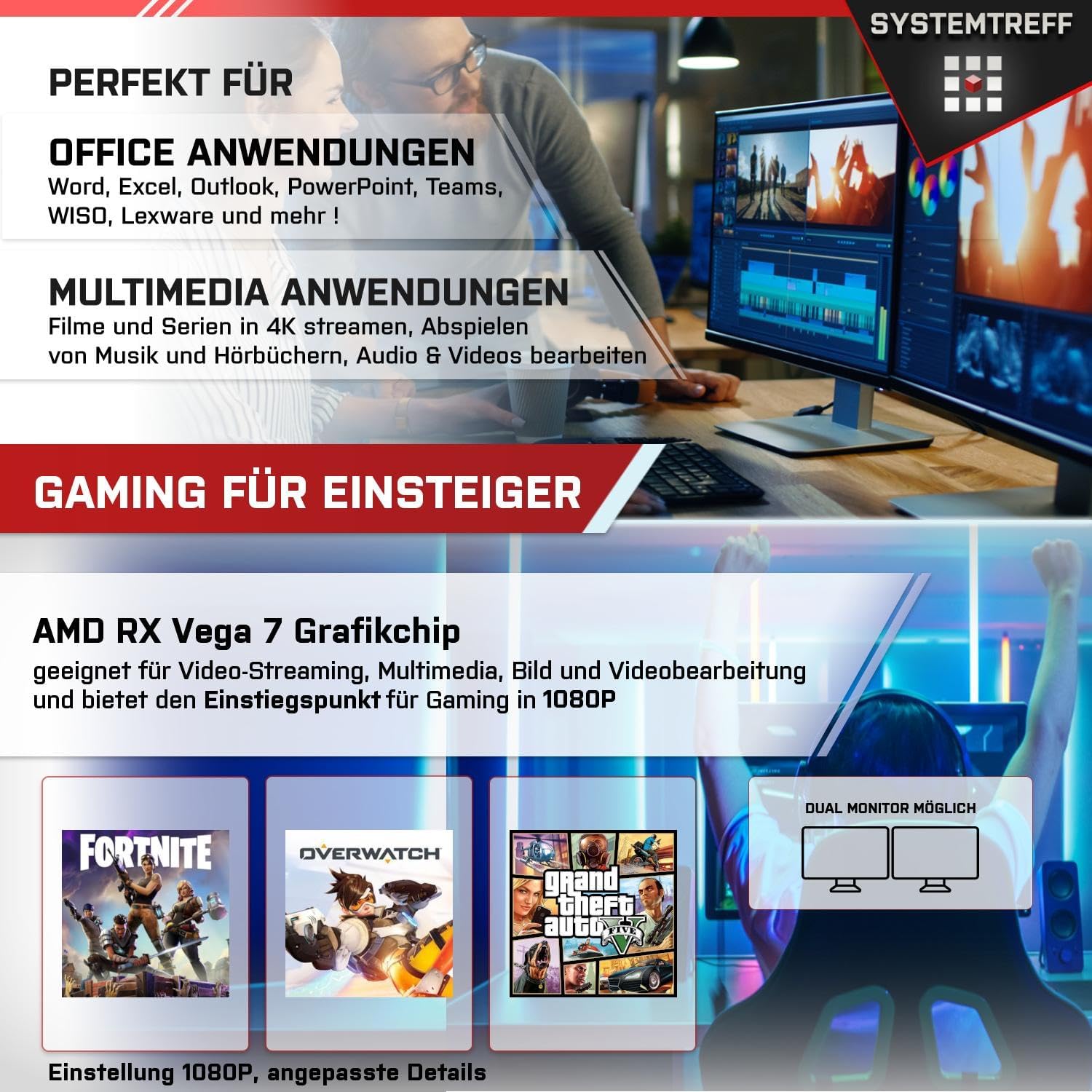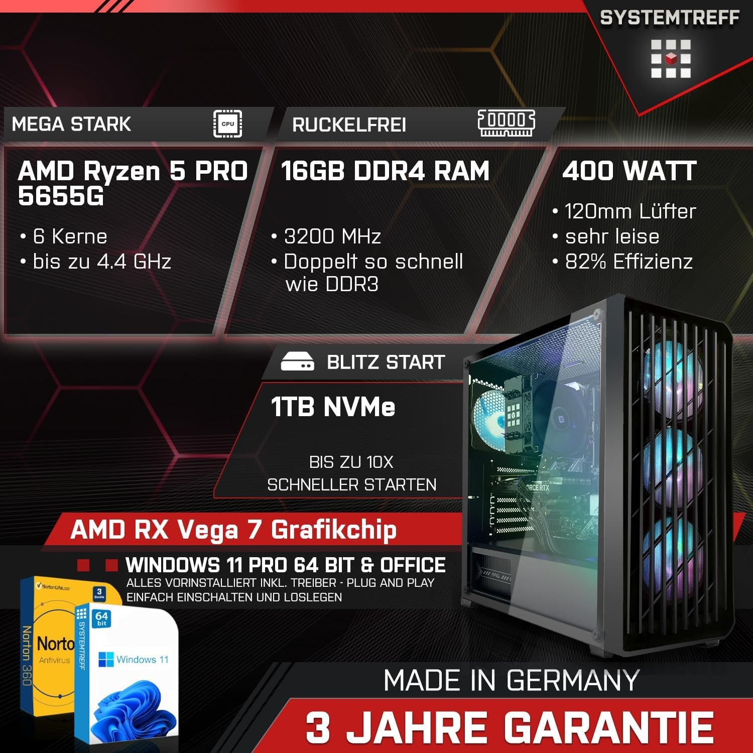 SYSTEMTREFF Basic Gaming PC AMD Ryzen 5 PRO 5655G 6x4.4GHz | AMD RX Vega 7 4K HDMI DX12 | 1TB M.2 NVMe | 16GB DDR4 RAM | WLAN Desktop Computer Rechner für Gamer, Zocker AMD Ryzen 5 PRO 5655G 16.0 GB 1000.0 GB Gamer Grafik: RX Vega 7 7Kern Grafikchip Technik:(AMD APU,1.9 GHz,7 Core,DX 12) | قیمت یورویی 409.9€