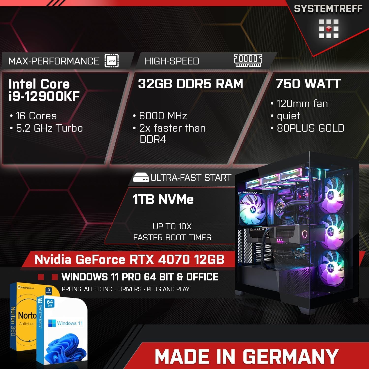 SYSTEMTREFF High-End Gaming PC Intel Core i9-12900KF 16x5.2GHz | Nvidia RTX 5070 12GB DX12 | 1TB M.2 NVMe | 64GB DDR5 RAM | Windows 11 | Desktop Computer Rechner für Gamer, Zocker & Streamer Intel Core i9-12900KF 64.0 GB 1000.0 GB Nvidia GeForce RTX 5070 12GB GDDR7 Technik:(4K,GDDR7,256bit,PCIe 5.0,DX12,DLSS 4) | قیمت یورویی 1879.9€
