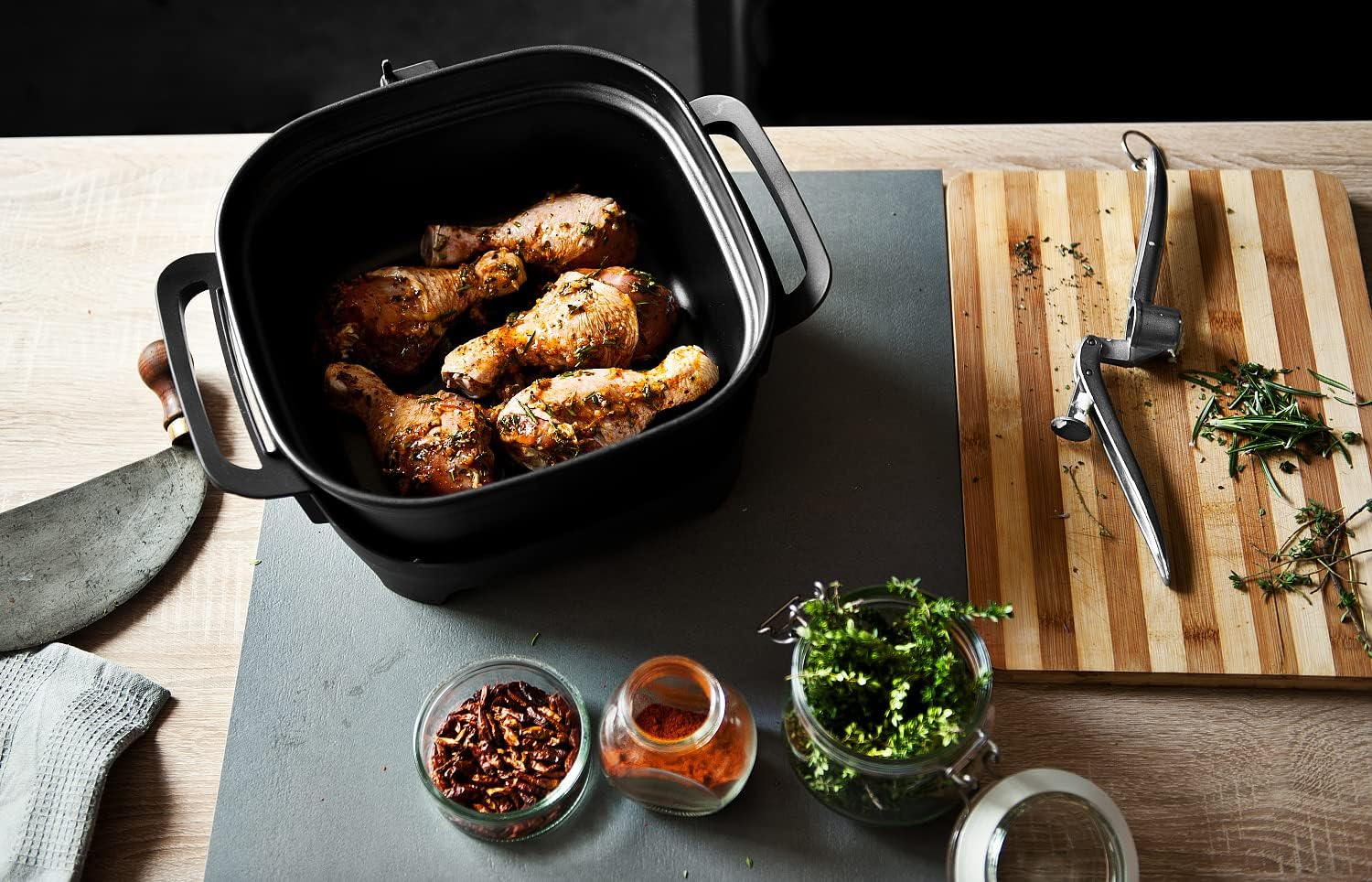 کاربرد چند منظوره - پخت و پز، کباب کردن، گریل کردن. گرمایش سریع و کارآمد به لطف صفحه گرمایش تعبیه شده در درب. تا ۸۰٪ اقتصادیتر از فرهای معمولی. ظرف و درب آن دارای روکش نچسب هستند که تمیز کردن آن را آسان میکند. به لطف ابعاد جمع و جور، قابل حمل و جاگیر است. کتاب دستور غذا به زبان آلمانی فقط به صورت دیجیتالی موجود است.