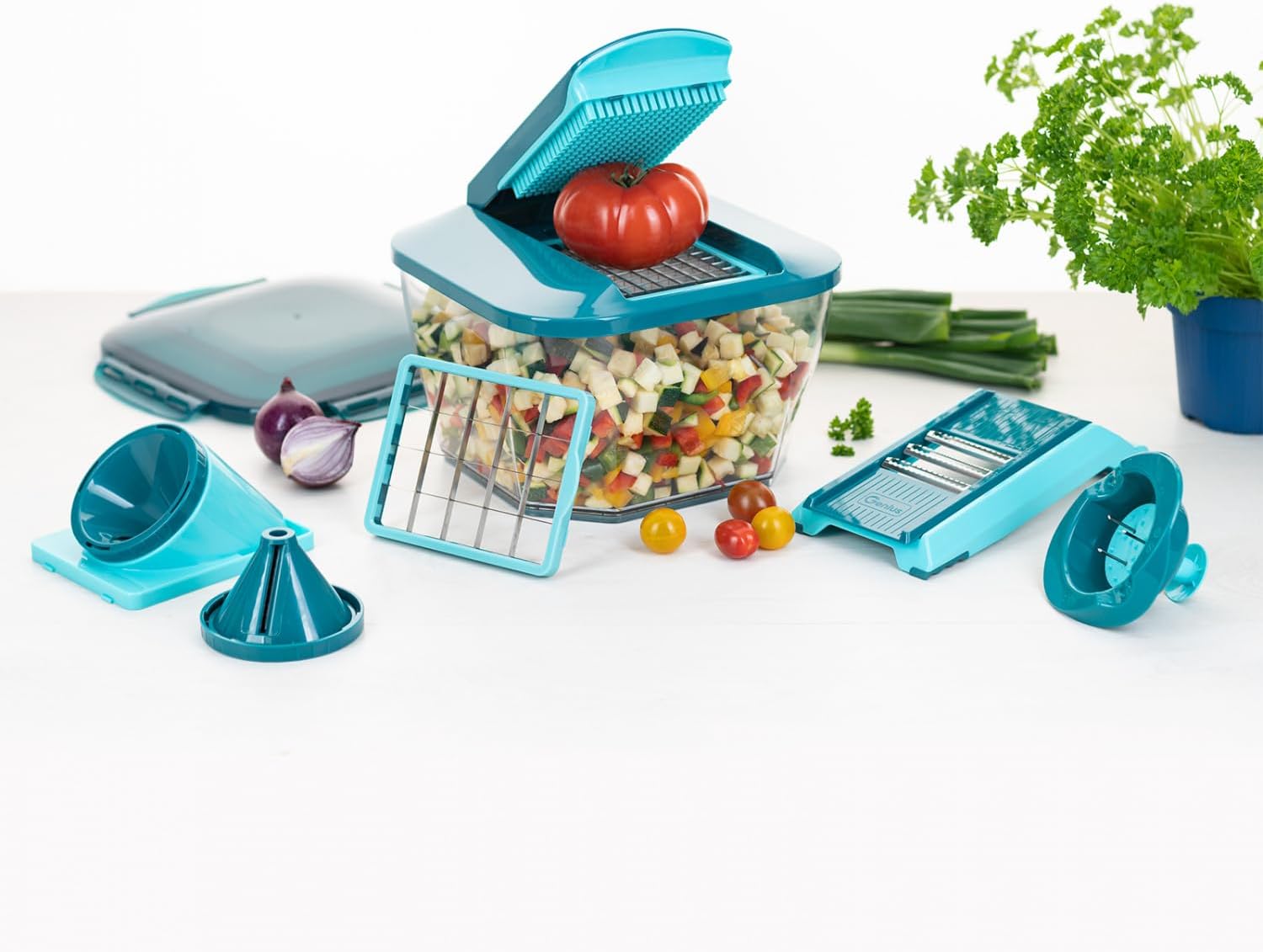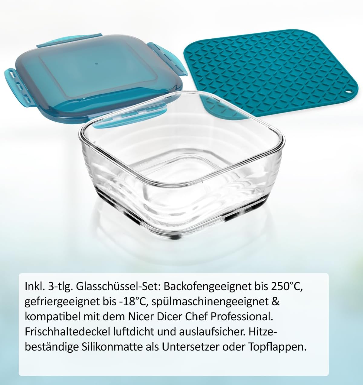 Nicer Dicer Chef Professional Gemüseschneider Gemüsehobel manuell 18-tlg, 5.2L Behälter extra Glassschüssel Deckel, Spiralschneider Pommesschneider Küchenhelfer mit Rezept | قیمت یورویی 66.94€
