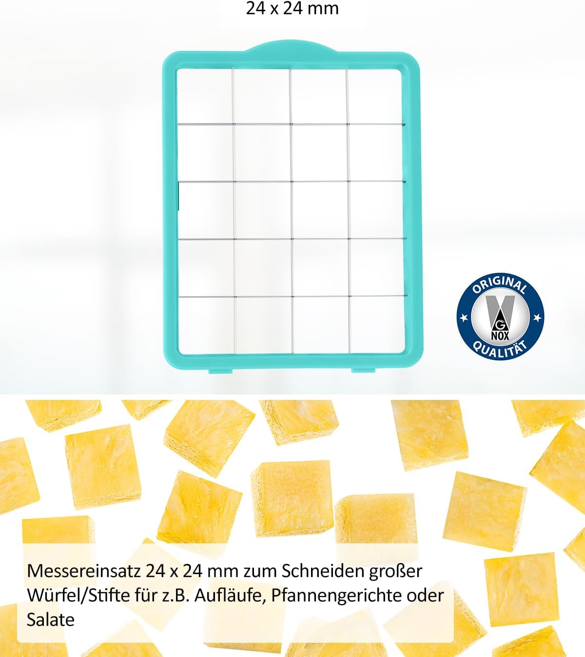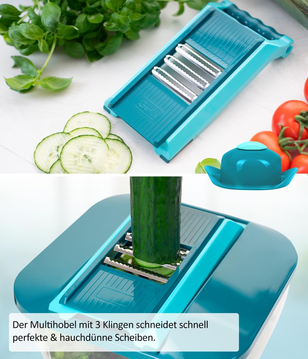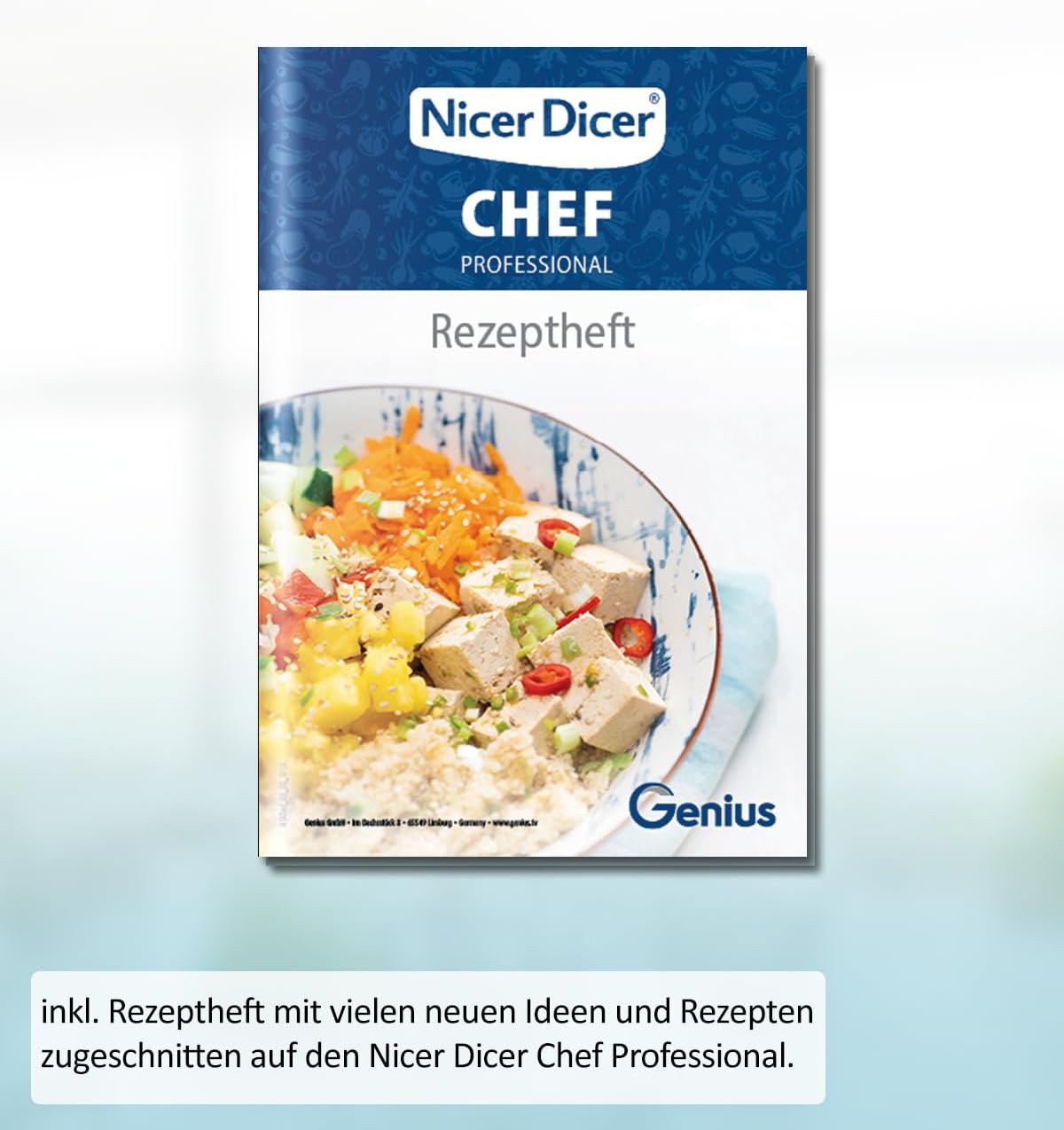 Der Allrounder unter den Lebensmittelschneidern. Der Nicer Dicer Chef Professional ist 37 % größer als sein Vorgänger 8-eckiger Auffangbehälter mit Fassungsvermögen von 5.200 ml inkl. Frischhaltedeckel Egal ob Sie Mahlzeiten vorbereiten, einen Salat machen oder einen schnellen Auflauf zaubern wollen. Mit dem Nicer Dicer Chef Professional haben Sie alles in einem. Messereinsätze, Schneide-Stempel, Hobel und Reib-Einsätze mit Schneidguthalter. Egal wie Sie Ihre Lebensmittel schneiden wollen, mit dem Nicer Dicer Chef Professional geht das schnell und einfach. Extra scharfe Edelstahl-Klingen in feinster G-NOX-Qualität. Für das bisschen extra Sicherheit inklusive Schutzabdeckung | قیمت یورویی : 66.94€