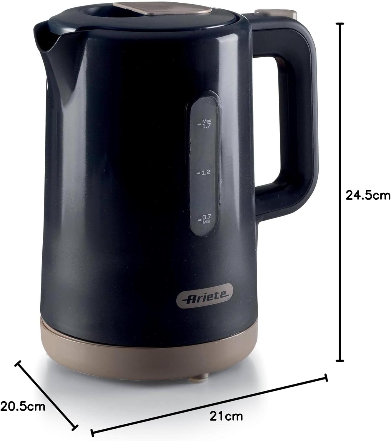 کتری برقی Ariete مدل 2846/00 با طراحی مینیمال و رنگ مشکی، یکی از محصولات سری Breakfast این برند ایتالیایی است. این دستگاه دارای بدنهای مقاوم، توان ۲۰۰۰ وات، فیلتر ضد رسوب، نشانگر میزان آب و خاموشی خودکار پس از جوش آمدن است. با ظرفیت ۱.۷ لیتری، مناسب برای تهیه چای، قهوه، دمنوش و دیگر نوشیدنیهای گرم در کمترین زمان است. پایه چرخان ۳۶۰ درجه و سیستم ایمنی دوگانه نیز از دیگر ویژگیهای آن هستند.