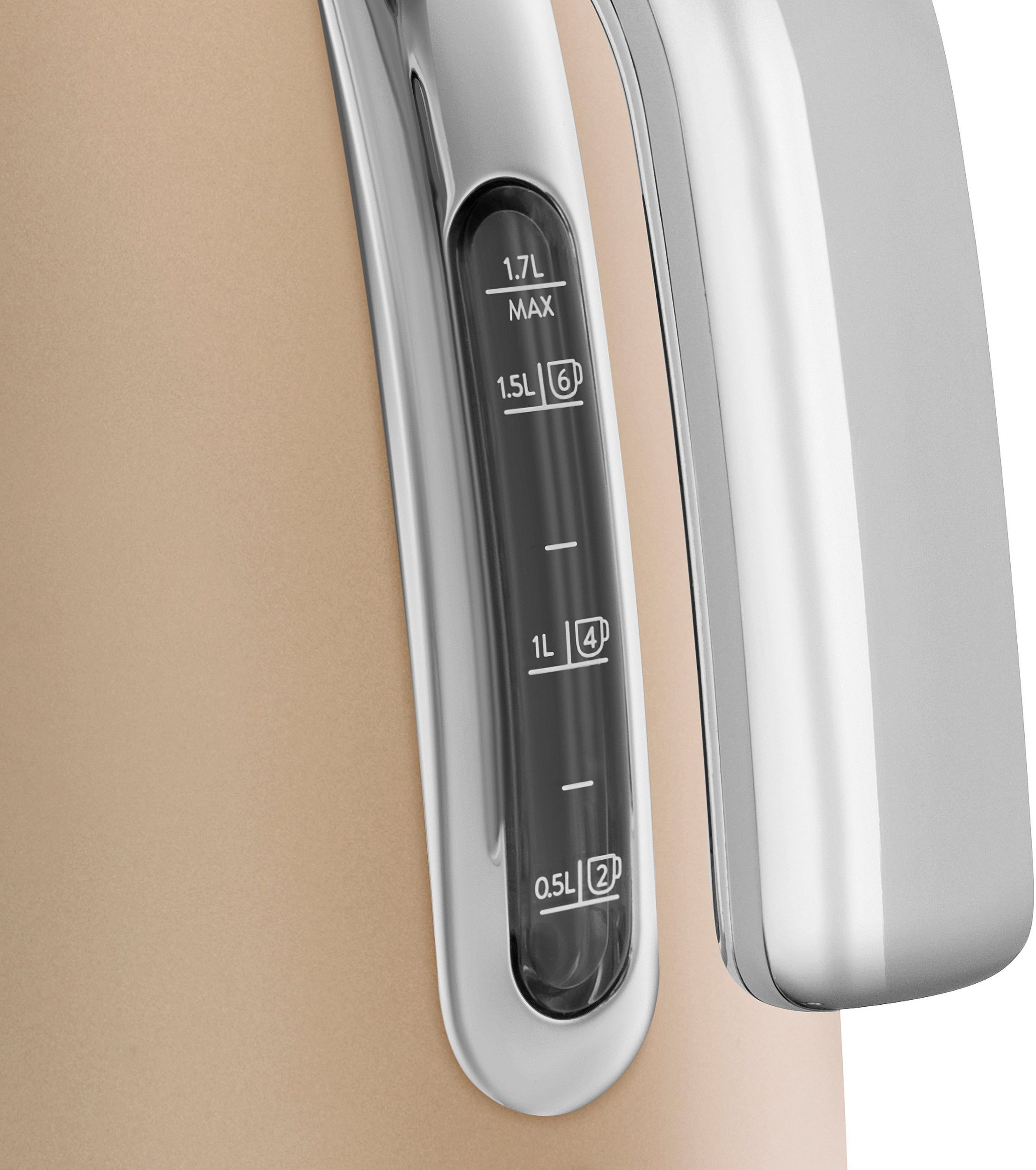 طراحی شامپاینی این کتری با سایر لوازم شامپاینی و کرم رنگ و چوب هماهنگی فوقالعادهای دارد.