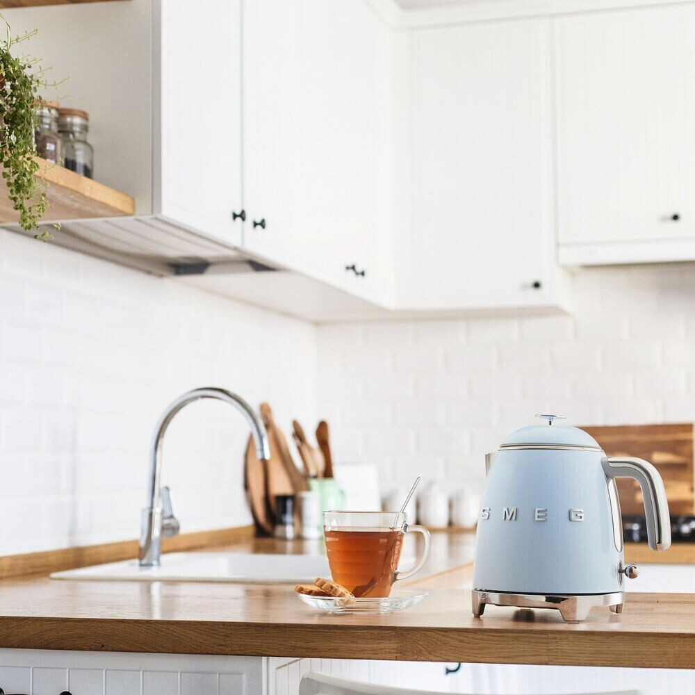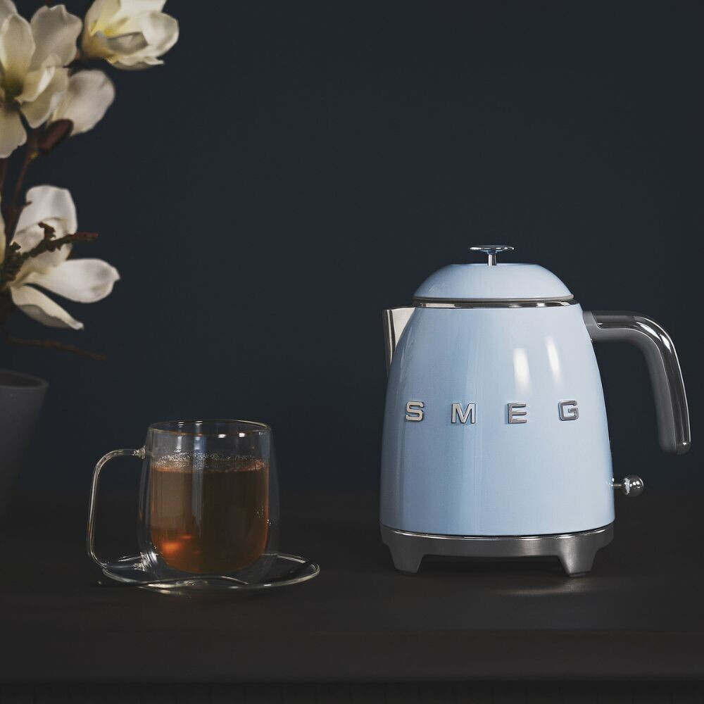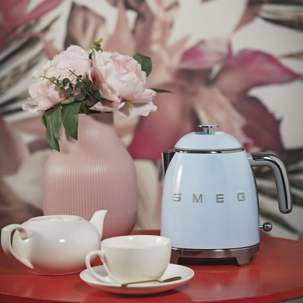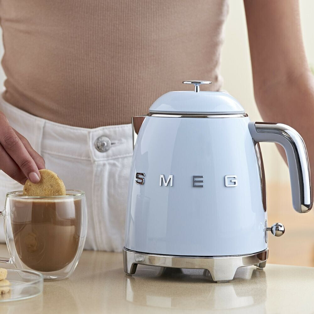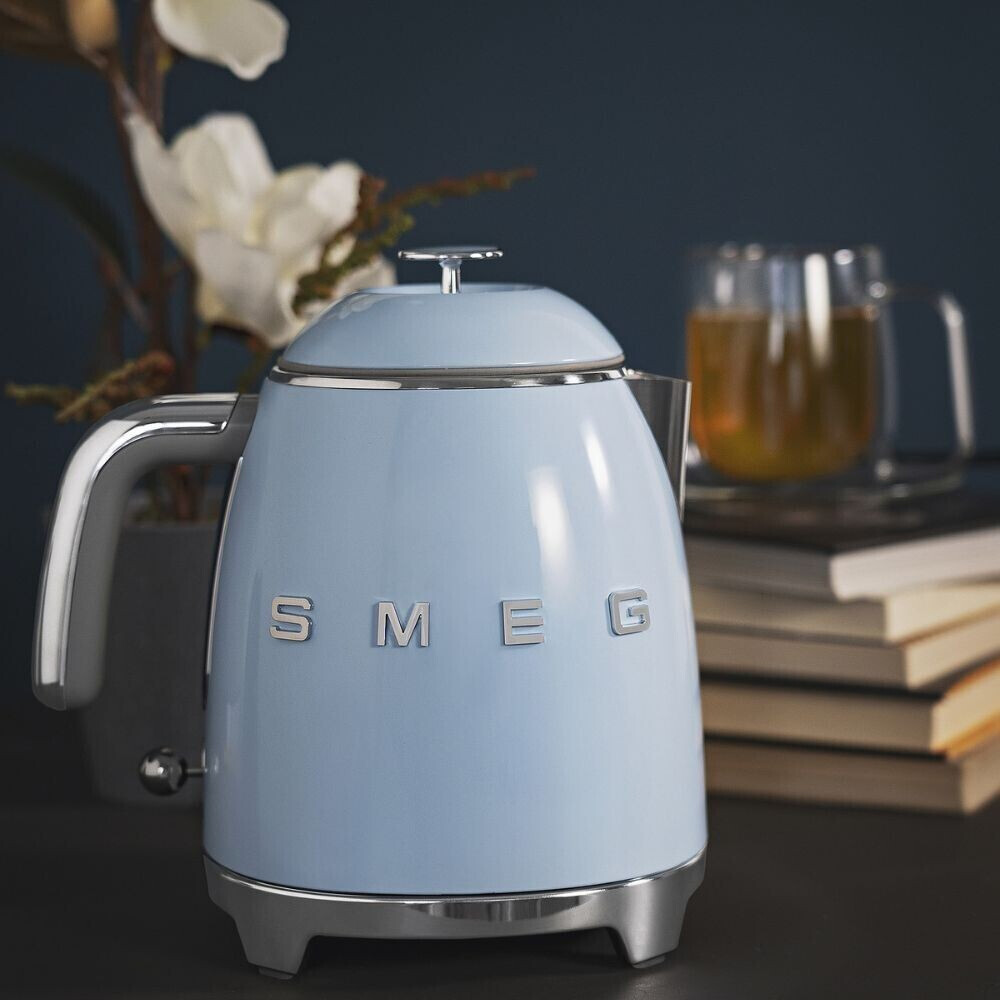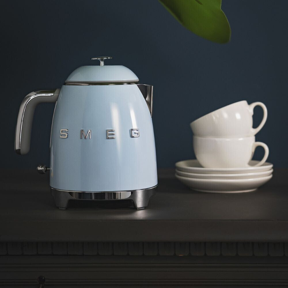 کتری برقی اسمگ مدل KLF05، محصولی از برند ایتالیایی SMEG با طراحی کلاسیک دهه 50 میلادی و رنگ آبی، جلوهای خاص به آشپزخانه میبخشد.