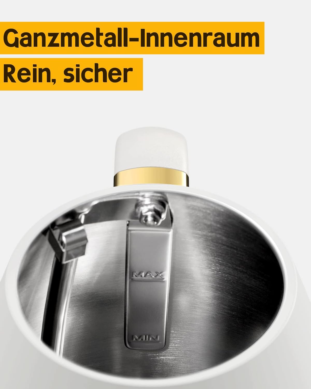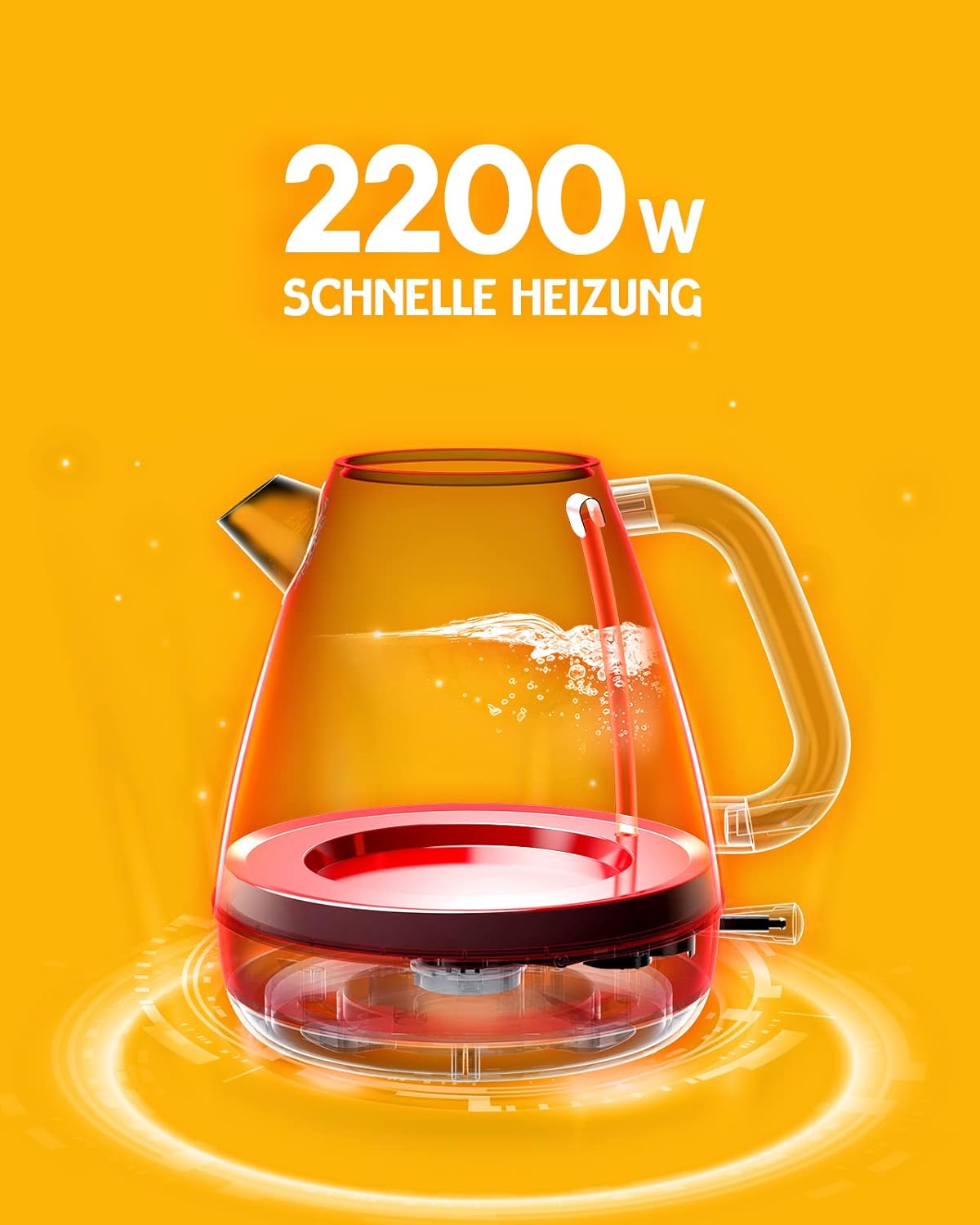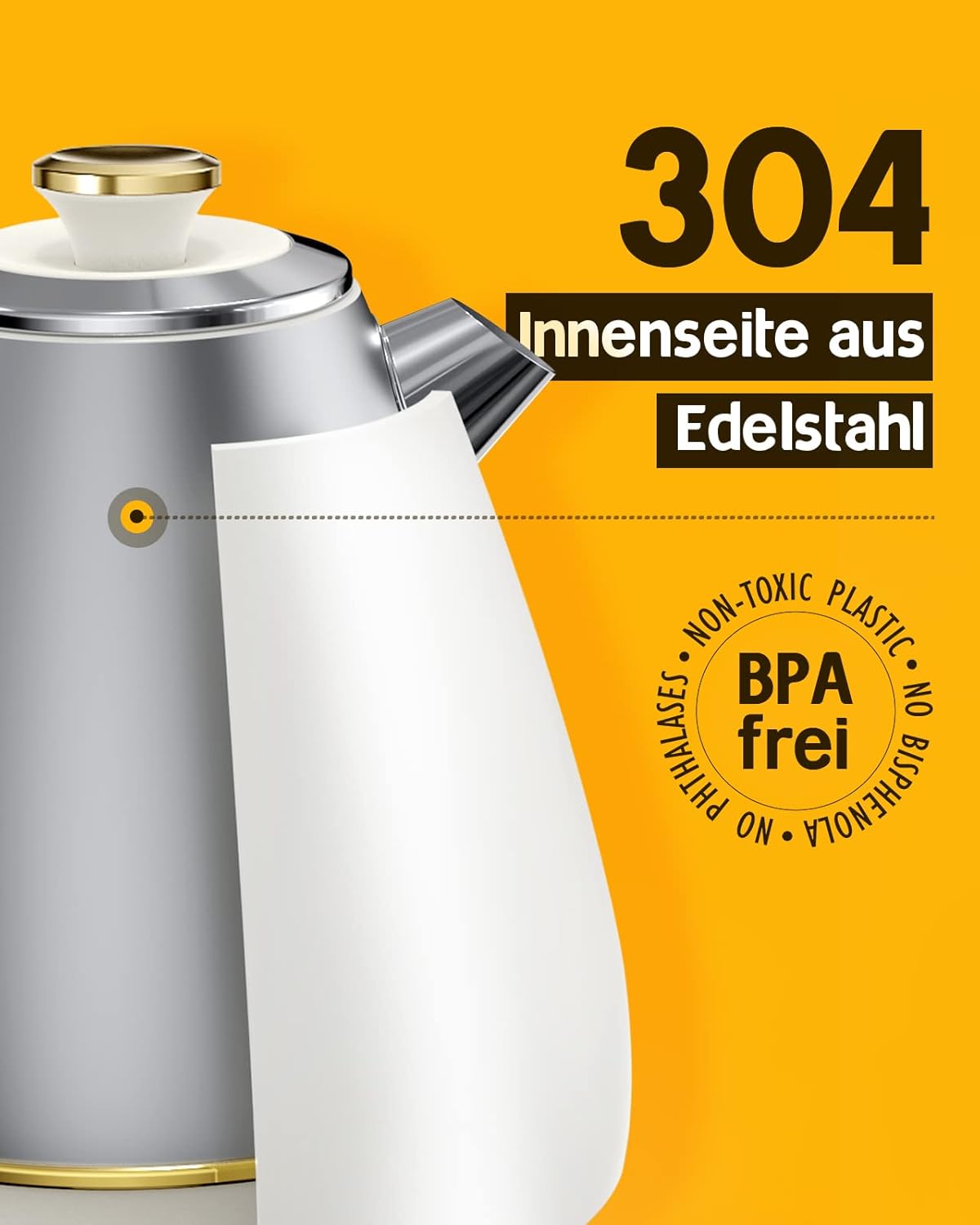 [Ganz aus Edelstahl] Dieser Retro-Wasserkocher ist aus lebensmittelechtem 304er Edelstahl im Inneren, im Deckel und im Filter gefertigt. Es kommt kein Plastik mit dem Wasser in Berührung, so dass Sie und Ihre Familie BPA-frei und gesund trinken können. [Dreifache Sicherheitsgarantie] Die STRIX-Thermostat-Technologie bietet dreifache Sicherheit für Ihren Gebrauch. 1-Automatische Abschaltung, wenn das Wasser zu kochen beginnt; 2-Automatische Abschaltung, wenn der Wasserkocher von der Basis angehoben wird; 3-Verhindern Sie, dass der Wasserkocher ohne Wasser eingeschaltet wird. [Großes Fassungsvermögen, schnelles Kochen] Dieser leistungsstarke 2200 Watt Teekessel kann schnell 1,7 Liter Wasser in 4 bis 5 Minuten kochen. Seien Sie immer bereit für die Zubereitung von bis zu 7 Tassen Getränken für Ihren Bedarf. [LED-Taste & Thermometer-Skala] Die Thermometer-Skala ist bequemer für Sie, um die gewünschte Temperatur von heißem Wasser für verschiedene Nutzungsszenarien vorzubereiten, wie die Zubereitung von Kaffee, Tee und gebrühter Milch. Die One-Touch-Taste mit einer hellen LED-Anzeige macht die Bedienung einfach. [Kabelloser Betrieb] Dieser Wasserkocher hat einen 360-Grad-Drehfuß und ist für den kabellosen Betrieb vollständig abnehmbar. Er lässt sich leichter aufheben und ausgießen und ist für Links- und Rechtshänder geeignet. | قیمت یورویی : 65.99€