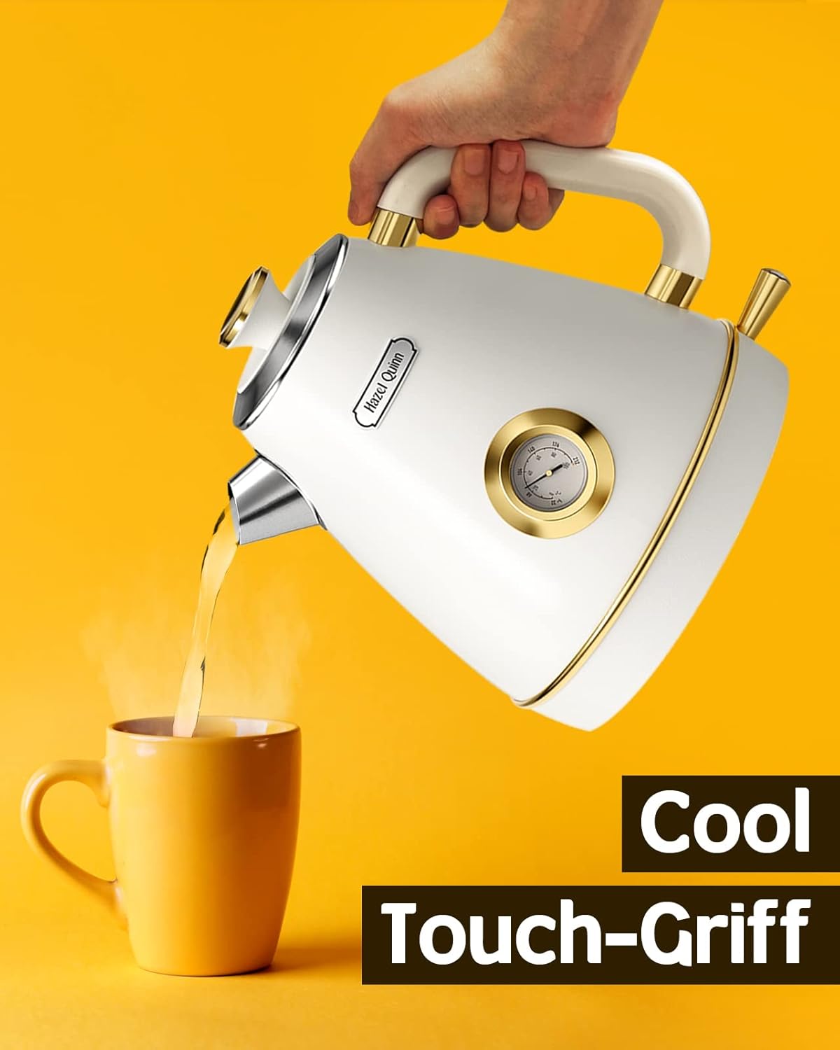 کتری برقی Hazel Quinn Retro با دماسنج، تمام فولاد ضد زنگ، بدون پلاستیک، کتری شارژی، خاموش شدن خودکار، 2200 وات، بدون BPA، طراحی قدیمی، سفید مرواریدی