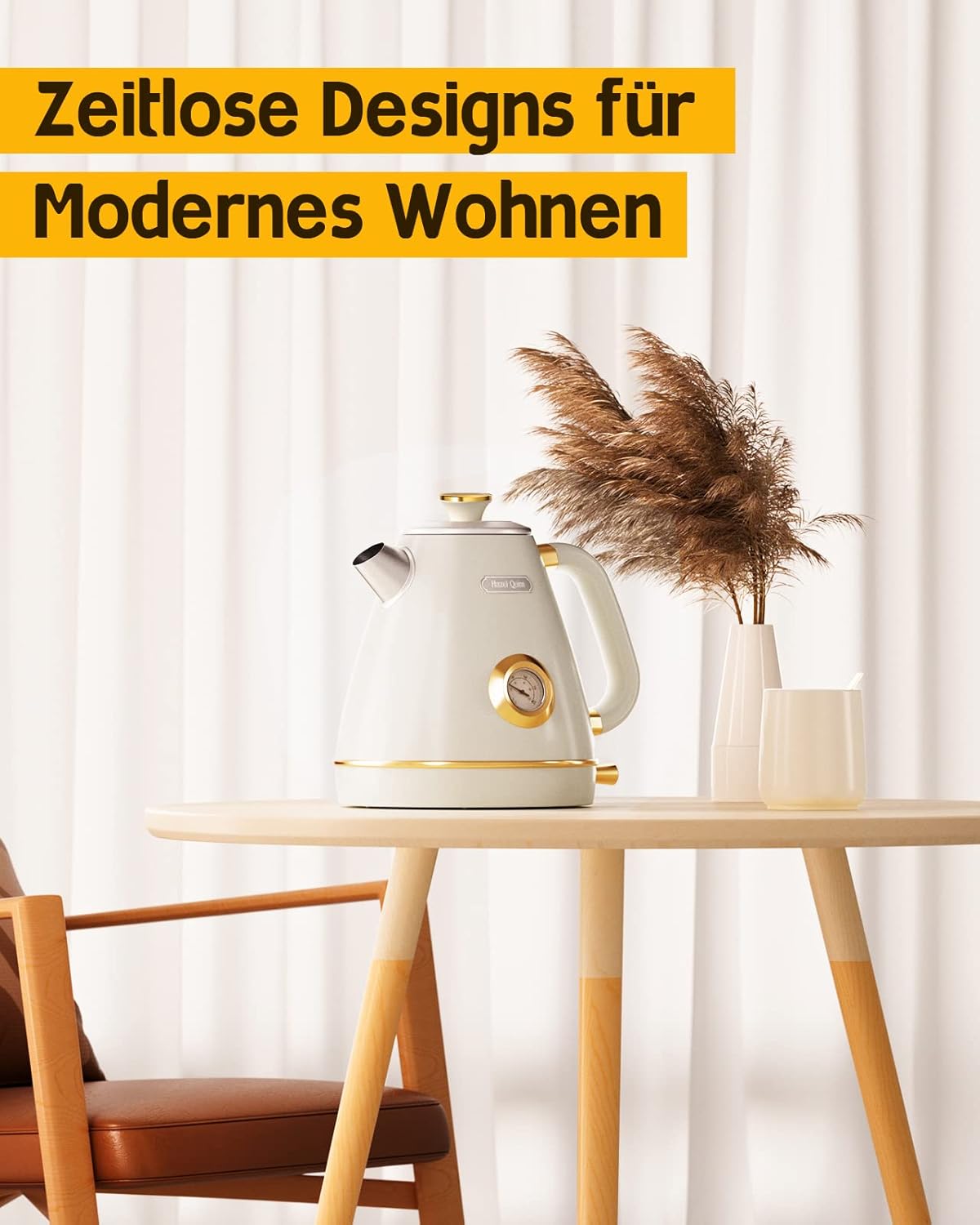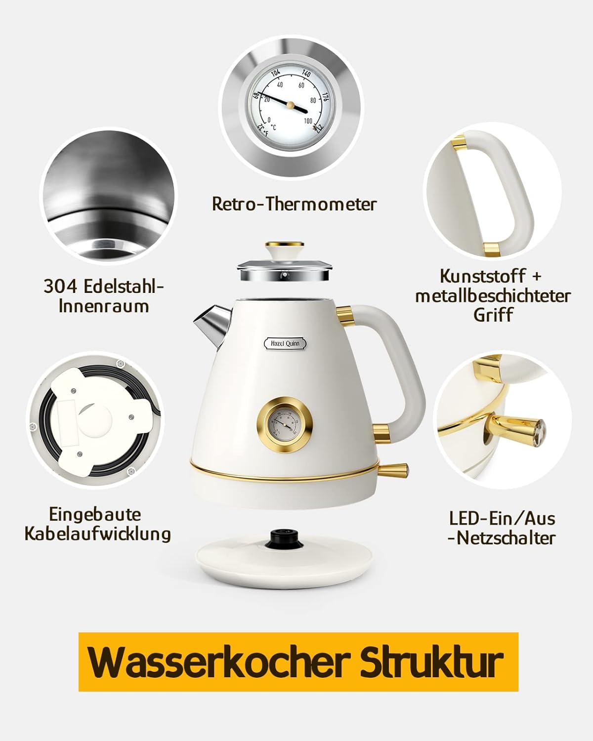 Hazel Quinn Elektrischer Wasserkocher Retro mit Thermometer, komplett aus Edelstahl, ohne Kunststoff, kabelloser Wasserkocher, automatische Abschaltung, 2200 W, BPA-frei, Vintage-Design, Perlweiß | قیمت یورویی 65.99€