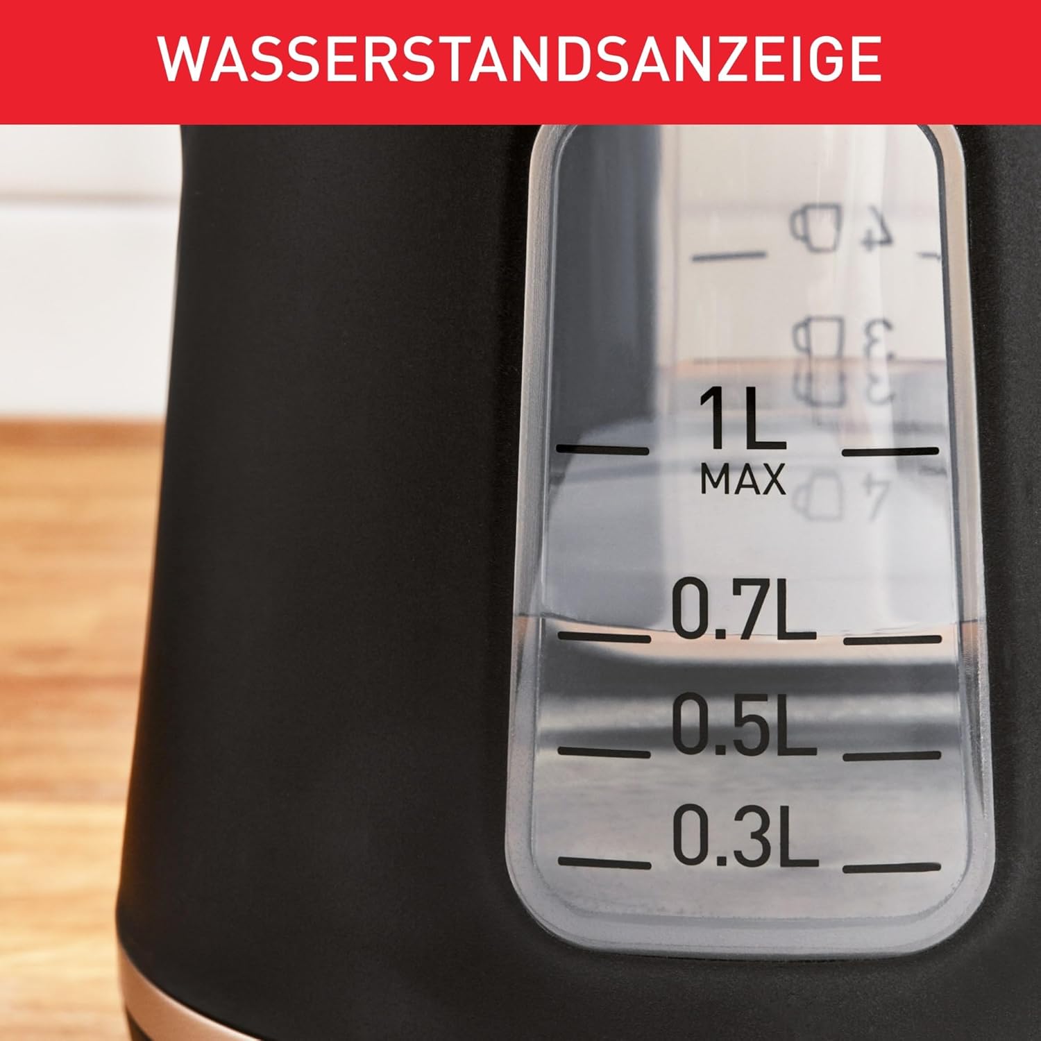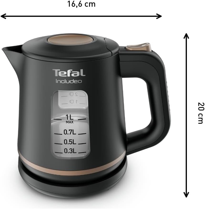 کتری تفال KI5338 Includeo | ظرفیت 1 لیتر | دسته ضد لغزش | نشانگر سطح آب آسان | پایه چرخشی 360 درجه | فیلتر قابل جابجایی | 2400 وات | کتری 23.3 x 16.6 x 20 سانتی متر در طراحی منحصر به فرد، 1 لیتری تکی