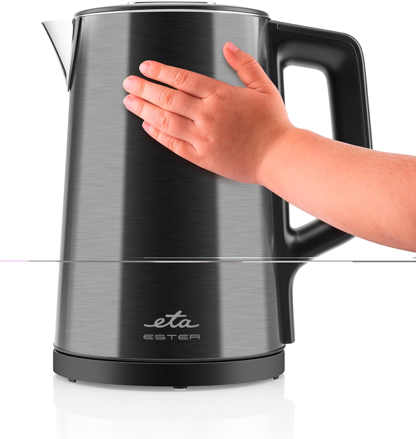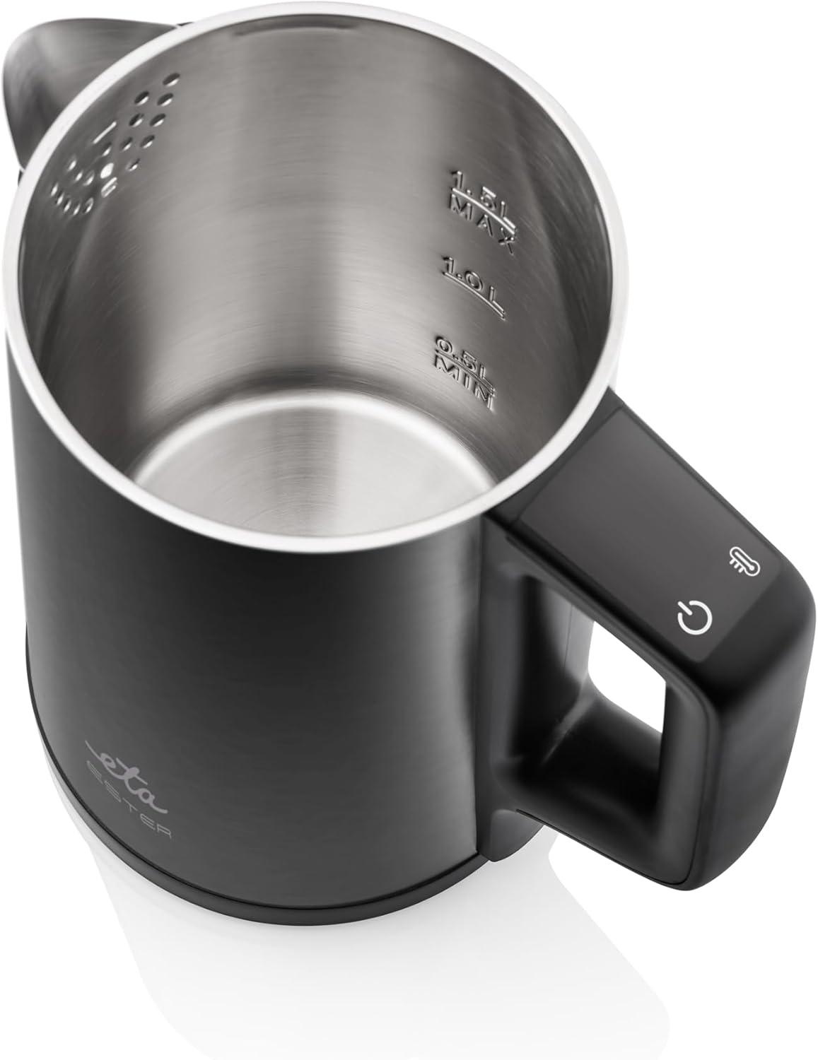 Der Wasserkocher ETA Ester ist mehr als nur ein praktischer Alltagshelfer. Dank seines eleganten Designs wird er zu einem Highlight in jeder Küche. Trotz zahlreicher praktischer Funktionen ist die Bedienung sehr einfach. Das übersichtliche LED-Display erleichtert die Einstellungen erheblich und informiert Sie gleichzeitig über die aktuelle Temperatur während des Kochvorgangs. Die Temperatur können Sie im Bereich von 40 bis 100 °C über die Touch-Tasten einstellen. Das Fassungsvermögen des Kessels beträgt ausreichend 1,5 l, und der aktuelle Wasserstand wird durch das interne Wasseranzeigefenster angezeigt. Die äußere Schicht des ETA Ester Wasserkochers besteht aus hochwertigem Edelstahl und bleibt immer angenehm berührbar, auch wenn es innen kräftig kocht. Verbrennungen sind somit definitiv ausgeschlossen. Der ETA Ester Wasserkocher erfüllt auch die Ansprüche der anspruchsvollsten Feinschmecker. Dank der Möglichkeit, die Temperatur von 40 bis 100 °C einzustellen, findet jeder seine ideale Einstellung. Eine Temperatur von 40 °C eignet sich für Babynahrung, 50–60 °C können für alle warmen Getränke gewählt werden, 70 °C sind ideal für die Zubereitung von grünem Tee, 80 °C für weißen Tee und bestimmte Oolong-Tees, 90 °C passen für Kaffee, Instantgetränke und Suppen, und 100 °C ist die ideale Temperatur für schwarzen und Kräutertee. Planen Sie, Ihr Getränk später zu genießen? Dank der KEEP WARM-Funktion können Sie sicher sein, dass es weiterhin warm bleibt. Der Wasserkocher speichert die eingestellte Temperatur und hält sie bis zu 2 Stunden. Neben der KEEP WARM-Funktion können Sie auch die Speicherfunktion nutzen. Wenn Sie den Wasserkocher vom Sockel nehmen und wieder zurückstellen, wird der Wasserkocher die Temperaturaufrechterhaltungsfunktion fortsetzen. Der ETA Ester Wasserkocher schützt dank seiner doppelwandigen Konstruktion vor Verbrennungen. Während das Wasser innen kocht, bleibt die äußere Edelstahl-Oberfläche kühl. Der dreifache Schutz des ETA Ester Wasserkochers sorgt für Ihre maximale Sicherheit. Die Sicherheitsvorrichtungen des Wasserkochers werden bei Überhitzung, Trockenlauf oder beim Abnehmen vom Sockel aktiviert. | قیمت یورویی : 54.99€
