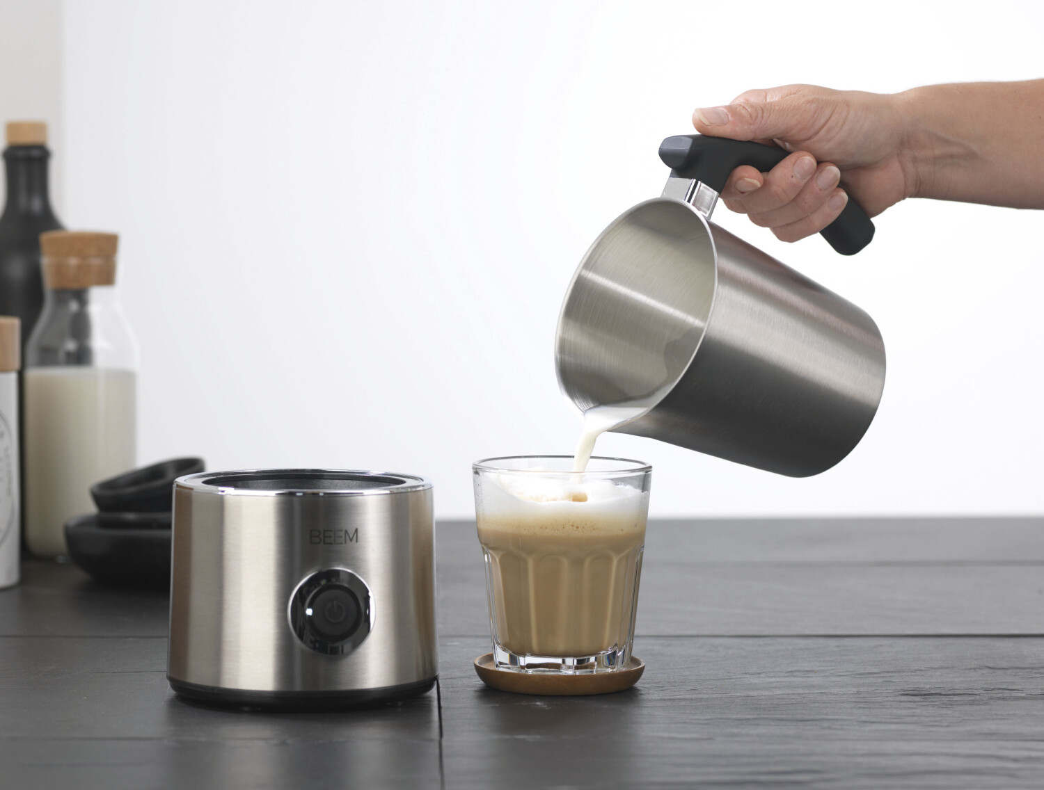 کفساز شیر BEEM مدل Milk-Swirl با طراحی شیک استیل و ظرفیت 200 میلیلیتر، مناسب تهیه کف شیر گرم، سرد و گرمکردن شیر است.