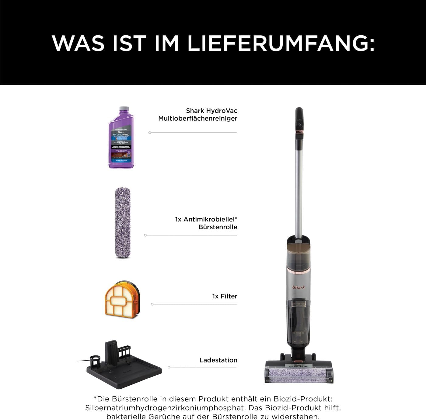 ENTFERNT NASS- UND TROCKENVERSCHMUTZUNGEN: Der Shark HydroVac saugt, wischt und reinigt gleichzeitig. Er reinigt Hartböden gründlich, entfernt nassen Schmutz, Ablagerungen, Staub und erfrischt Teppiche FÄNGT SAUBER AN, BLEIBT SAUBER: Bürstenrolle mit antimikrobiellem Selbstreinigungssystem. (*Die Bürstenrolle wurde mit antimikrobiellen Substanzen behandelt, um die Rolle zu erhalten und bakterielle Gerüche von der Bürstenrolle fernzuhalten.) GERUCHSNEUTRALISIERER: Enthält die HydroVac Mehrzweckreinigungslösung, die dazu beiträgt, Gerüche auf allen Böden zu beseitigen und für ein frischer riechendes Zuhause zu sorgen. Schnelle Trockenzeit EINFACH ZU BENUTZEN: Schmutzfiltration im Schmutzwassertank für schnelles Entleeren. Der Selbstreinigungsmodus hält ihn bereit für die nächste Verwendung. Deckt bis zu 88,5m² mit einer Ladung ab (bei zwei Nachfüllungen des sauberen Wassertanks) ENTHÄLT: Shark HydroVac Kabelloser Hartbodenreiniger, Bürstenrolle, Filter, Mehrzweckreinigungslösung Starterflasche, Ladestation - EU-Stecker. Gewicht: 3,95 kg. Farbe: Anthrazitgrau | قیمت یورویی : 199€