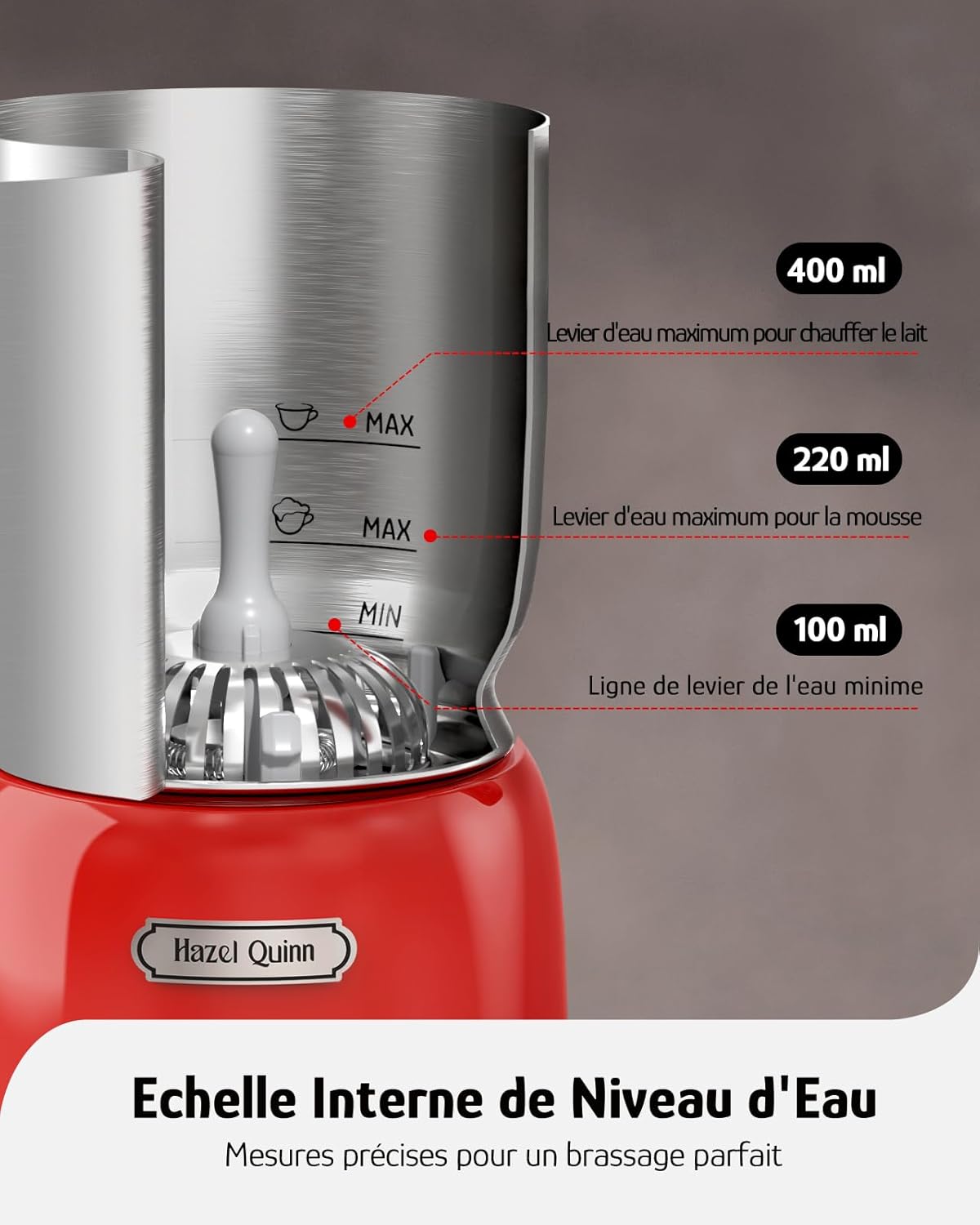 [Heiß- und Kalt-Aufschäumen] Der Hazel Quinn Milchaufschäumer verfügt über 4 einstellbare Temperaturen für Ihren perfekten Schaum - 45 °C/55 °C/65 °C & kaltes Aufschäumen. Ideal für die Zubereitung von sowohl heißem als auch eiskaltem Kaffee und erfüllt alle Ihre Getränkewünsche. [5 vielseitige Funktionen] Erleben Sie mit dem elektrischen Milchaufschäumer von Hazel Quinn eine gehobene Aufschäumerfahrung - genießen Sie dicken/leichten Schaum (heiß), kaltes Aufschäumen, Heizmodus und gönnen Sie sich den Genuss des Heiße-Schokolade-Modus. Die Gestaltung Ihres perfekten Schaums war noch nie so erfreulich! [304 Edelstahl] Der Krug besteht aus 304-Edelstahl im Inneren, dieser Milchaufschäumer von Hazel Quinn garantiert ein BPA-freies Trinkerlebnis und vermeidet jeden Kontakt mit Plastik und Wasser. Mit Priorität auf Langlebigkeit und Reinheit schützt er Ihre Gesundheit. [Magnetisches & abnehmbares Design] Erleben Sie Stabilität durch die magnetische Anziehungskraft zwischen Tasse und Basis während des Aufschäumens, was Sorgen um Verschüttungen beseitigt. Die abnehmbare Tasse ist spülmaschinenfest für eine bequeme und mühelose Reinigung. [Extra Große 13,5oz/400ml Kapazität] Entfesseln Sie Ihre Kreativität mit dem 13,5oz/400ml fassenden Krug von Hazel Quinn. Ausgestattet mit zwei "Max"-Wasserlinien im Inneren der Tasse - die höhere für die Heizfunktion und die leicht niedrigere für das Aufschäumen, um Präzision bei der Zubereitung Ihrer perfekten Getränke zu gewährleisten. | قیمت یورویی : 70.99€