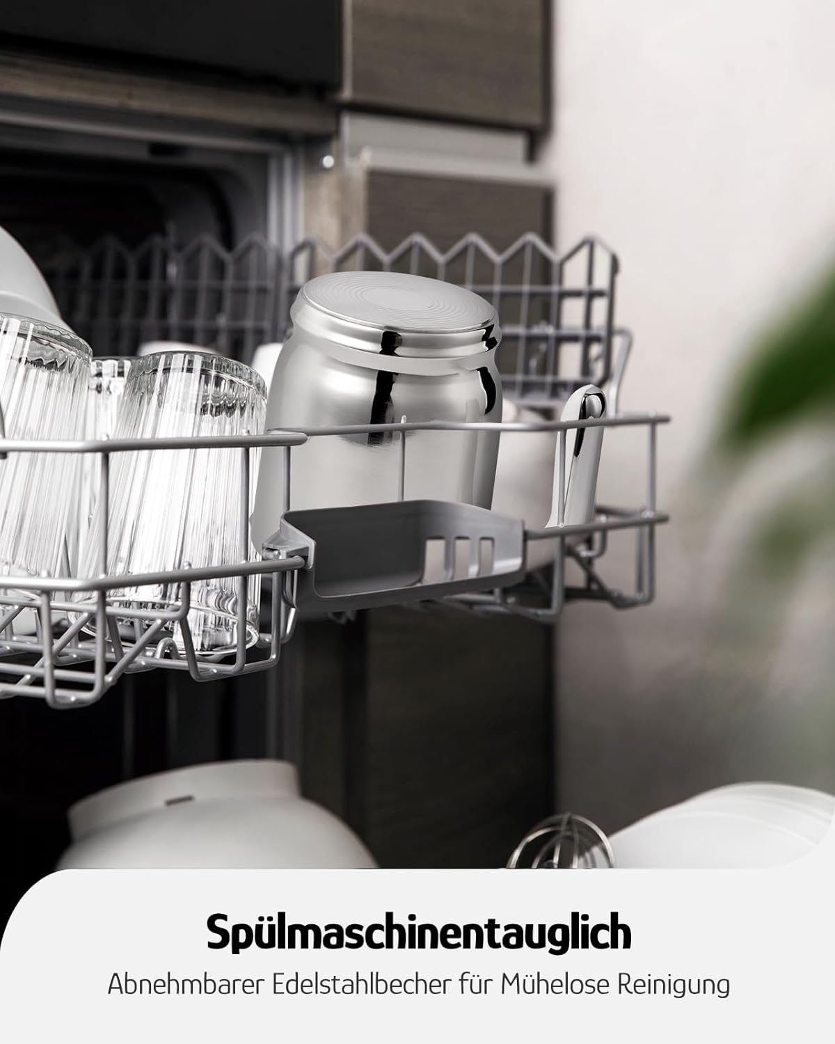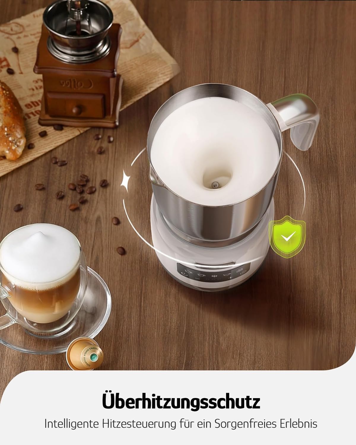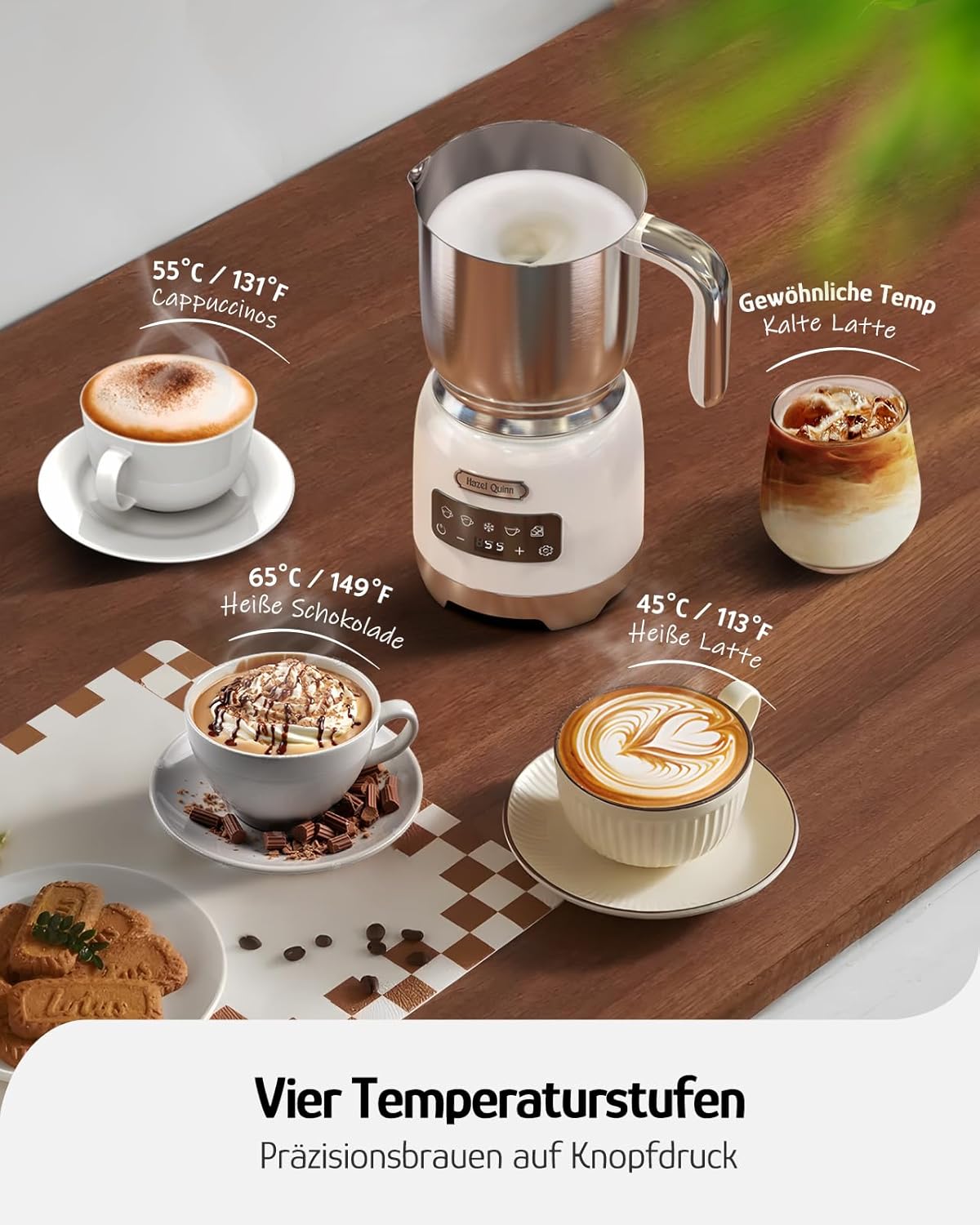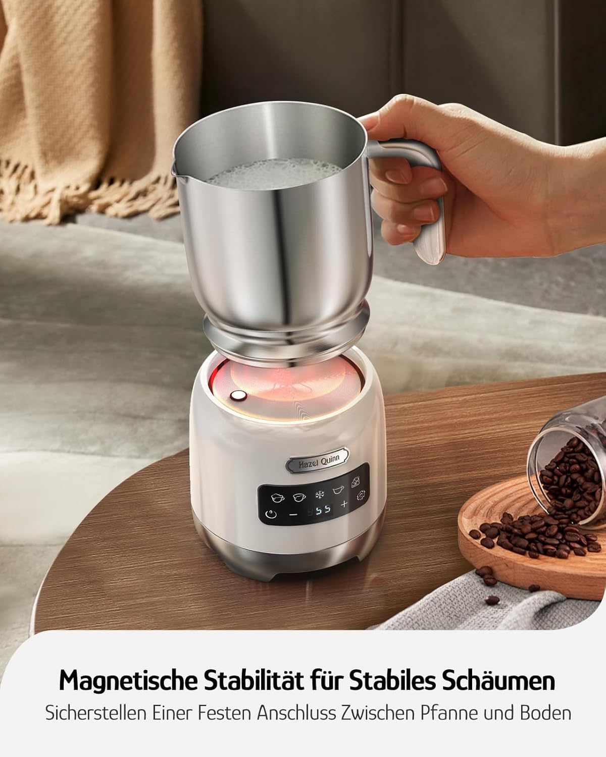[Heiß- und Kalt-Aufschäumen] Der Hazel Quinn Milchaufschäumer verfügt über 4 einstellbare Temperaturen für Ihren perfekten Schaum - 45 °C/55 °C/65 °C & kaltes Aufschäumen. Ideal für die Zubereitung von sowohl heißem als auch eiskaltem Kaffee und erfüllt alle Ihre Getränkewünsche. [5 vielseitige Funktionen] Erleben Sie mit dem elektrischen Milchaufschäumer von Hazel Quinn eine gehobene Aufschäumerfahrung - genießen Sie dicken/leichten Schaum (heiß), kaltes Aufschäumen, Heizmodus und gönnen Sie sich den Genuss des Heiße-Schokolade-Modus. Die Gestaltung Ihres perfekten Schaums war noch nie so erfreulich! [304 Edelstahl] Der Krug besteht aus 304-Edelstahl im Inneren, dieser Milchaufschäumer von Hazel Quinn BPA-freies Trinkerlebnis und vermeidet jeden Kontakt mit Plastik und Wasser. Mit Priorität auf Langlebigkeit und Reinheit schützt er Ihre Gesundheit. [Magnetisches & abnehmbares Design] Erleben Sie Stabilität durch die magnetische Anziehungskraft zwischen Tasse und Basis während des Aufschäumens, was Sorgen um Verschüttungen beseitigt. Die abnehmbare Tasse ist spülmaschinenfest für eine bequeme und mühelose Reinigung. [Extra Große 13,5oz/400ml Kapazität] Entfesseln Sie Ihre Kreativität mit dem 13,5oz/400ml fassenden Krug von Hazel Quinn. Ausgestattet mit zwei "Max"-Wasserlinien im Inneren der Tasse - die höhere für die Heizfunktion und die leicht niedrigere für das Aufschäumen, um Präzision bei der Zubereitung Ihrer perfekten Getränke zu gewährleisten. | قیمت یورویی : 69.99€
