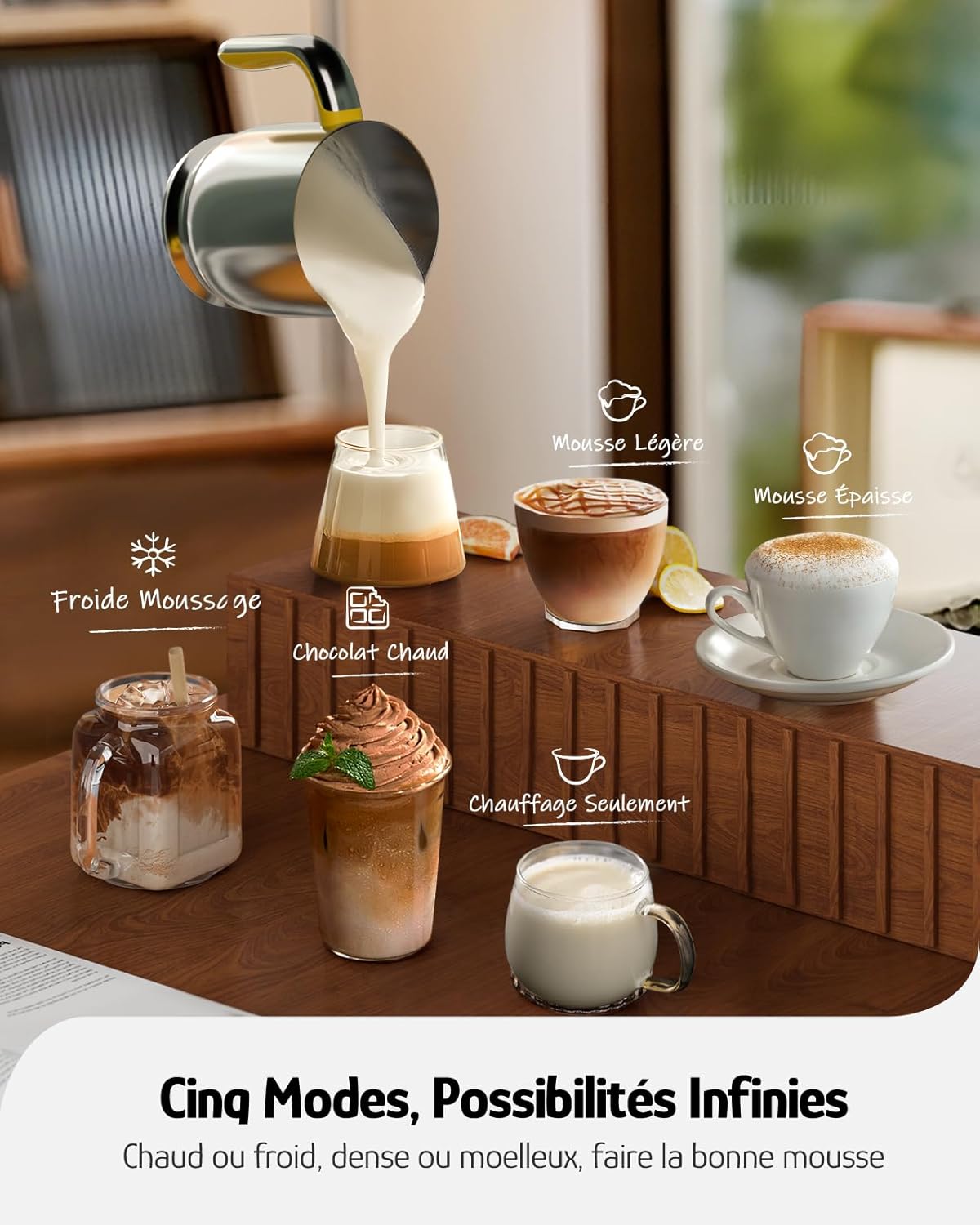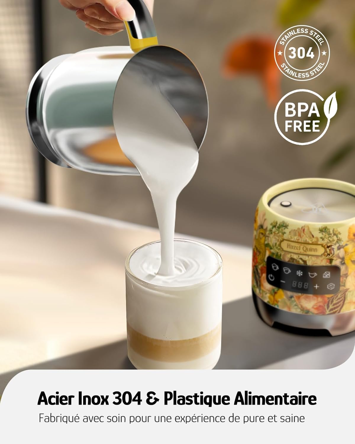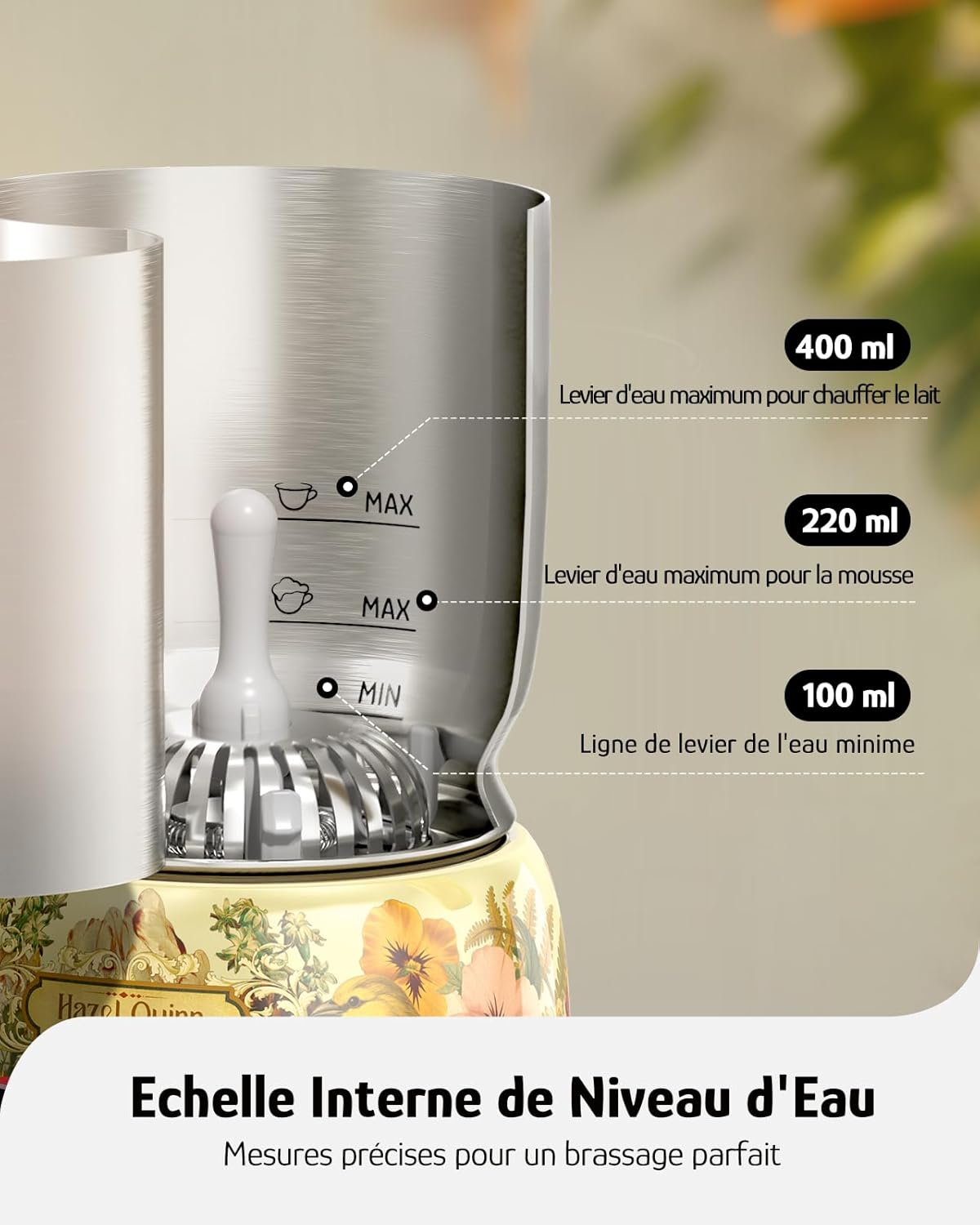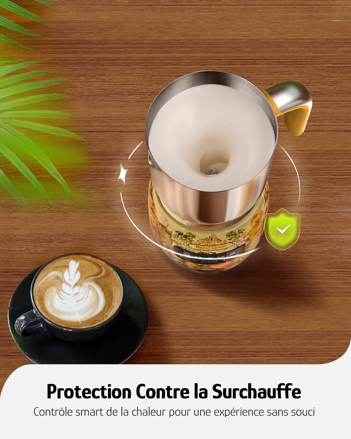 [Heiß- und Kalt-Aufschäumen] Der Hazel Quinn Milchaufschäumer verfügt über 4 einstellbare Temperaturen für Ihren perfekten Schaum - 45 °C/55 °C/65 °C & kaltes Aufschäumen. Ideal für die Zubereitung von sowohl heißem als auch eiskaltem Kaffee und erfüllt alle Ihre Getränkewünsche. [5 vielseitige Funktionen] Erleben Sie mit dem elektrischen Milchaufschäumer von Hazel Quinn eine gehobene Aufschäumerfahrung - genießen Sie dicken/leichten Schaum (heiß), kaltes Aufschäumen, Heizmodus und gönnen Sie sich den Genuss des Heiße-Schokolade-Modus. Die Gestaltung Ihres perfekten Schaums war noch nie so erfreulich! [304 Edelstahl] Der Krug besteht aus 304-Edelstahl im Inneren, dieser Milchaufschäumer von Hazel Quinn garantiert ein BPA-freies Trinkerlebnis und vermeidet jeden Kontakt mit Plastik und Wasser. Mit Priorität auf Langlebigkeit und Reinheit schützt er Ihre Gesundheit. [Magnetisches & abnehmbares Design] Erleben Sie Stabilität durch die magnetische Anziehungskraft zwischen Tasse und Basis während des Aufschäumens, was Sorgen um Verschüttungen beseitigt. Die abnehmbare Tasse ist spülmaschinenfest für eine bequeme und mühelose Reinigung. [Extra Große 13,5oz/400ml Kapazität] Entfesseln Sie Ihre Kreativität mit dem 13,5oz/400ml fassenden Krug von Hazel Quinn. Ausgestattet mit zwei "Max"-Wasserlinien im Inneren der Tasse - die höhere für die Heizfunktion und die leicht niedrigere für das Aufschäumen, um Präzision bei der Zubereitung Ihrer perfekten Getränke zu gewährleisten. | قیمت یورویی : 75.99€