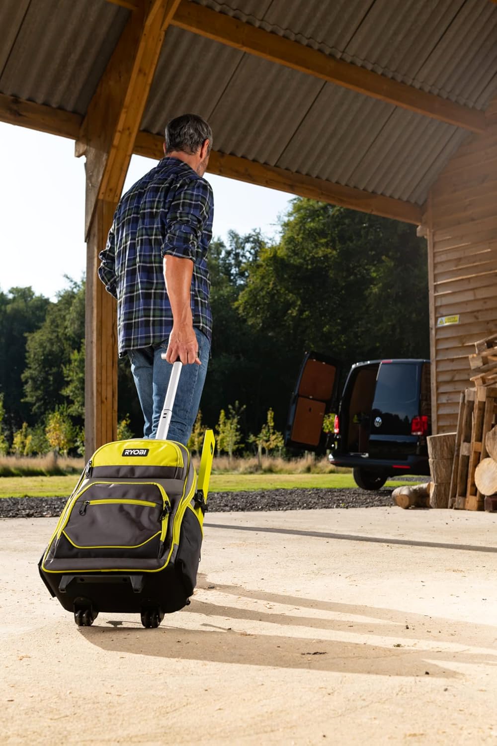 RYOBI Werkzeug-Rucksack RSSBP2 (integrierten Rollen, teleskopierbarem Griff, 600-Denier Polyester Korpus, Gepolsterte Schultergurte, 2x breite Innentaschen, eine mit Reißverschluss, mit Laptopfach) | قیمت یورویی 97.82€