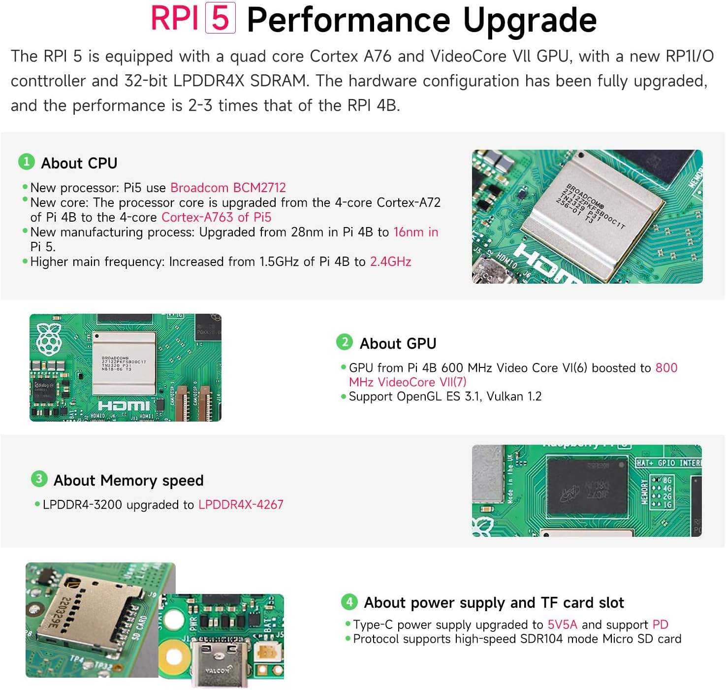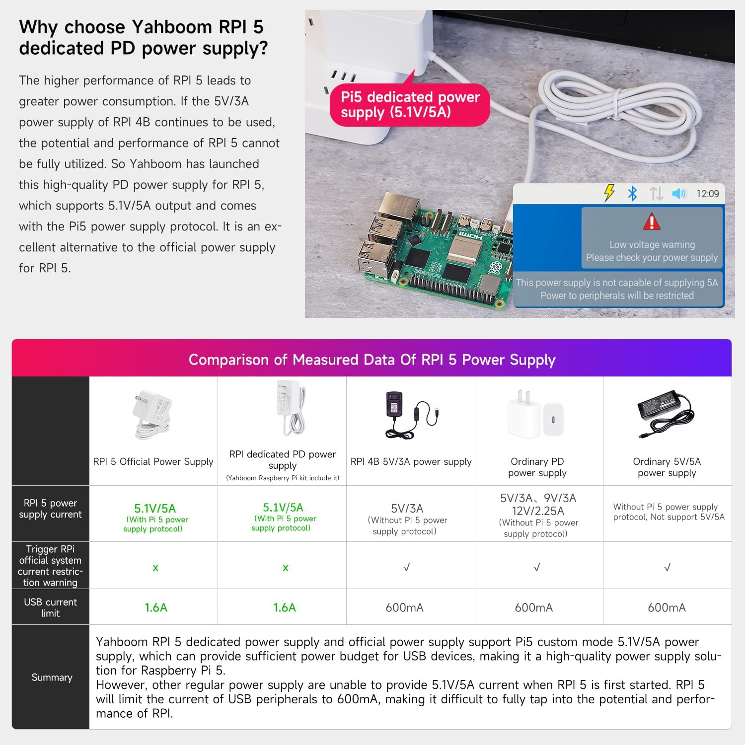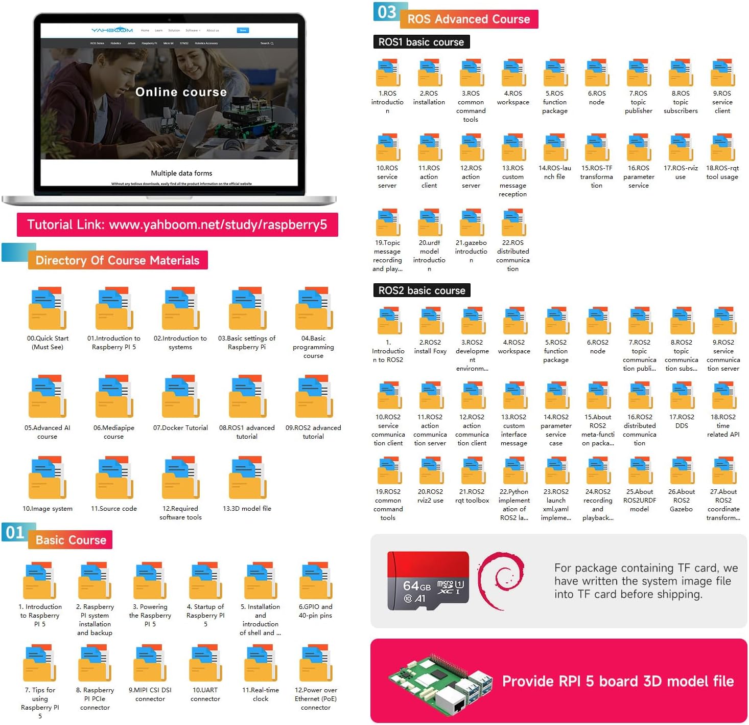 Raspberry Pi 5 features 64-bit quad-core Arm Cortex-A76 processor with aclock speed of 2.4GHz, delivering 2-3 times improved CPU performance compared to Raspberry Pi 4B. Additionally, graphics performance sees significant boost with the 800MHz VideoCore VII GPU, supporting dual 4Kp60 display output via HDMI. The redesigned Raspberry Pi image signal processor provides advanced camera support, offering users a smooth desktop experience and opening new possibilities for industrial applications Yahboom provides different kit combinations for Raspberry Pi 5 to suit various user needs. If you need high-frequency cooling, cooling boost kit is recommended. Camera kit is suitable for visual developers. If you have high quality requirements for raspberry pi 5 case, choose solid metal casing. All kits are equipped with Yahboom's customized Raspberry Pi 5-specific 5.1V/5A power adapter with PD protocol, which can fully utilize the performance of Pi5. Except for the Basic Kit, the other kits include 64G TF card that is burned into the image system , card reader, micro-HDMI cable and network cable Yahboom provides basic usage tutorials, AI vision advanced development tutorials, and Raspberry Pi 5 ROS advanced development materials for the Raspberry Pi 5 development board. Our technical support will also promptly help users with difficulties. Raspberry Pi 5 requires 2 essential conditions for normal and healthy operation: adapter and heat dissipation system. Yahboom’s 27W USB-C 5.1V/5A power adapter solves stable power supply. Various needs of the cooling system, we provide economical heat sinks; moderate heat sinks and fans have metal casings; if long-term high-frequency operation is required, an active cooling solution that doubles the heat dissipation is needed to ensure the normal operation of the pi 5 development board. | قیمت یورویی : 175€