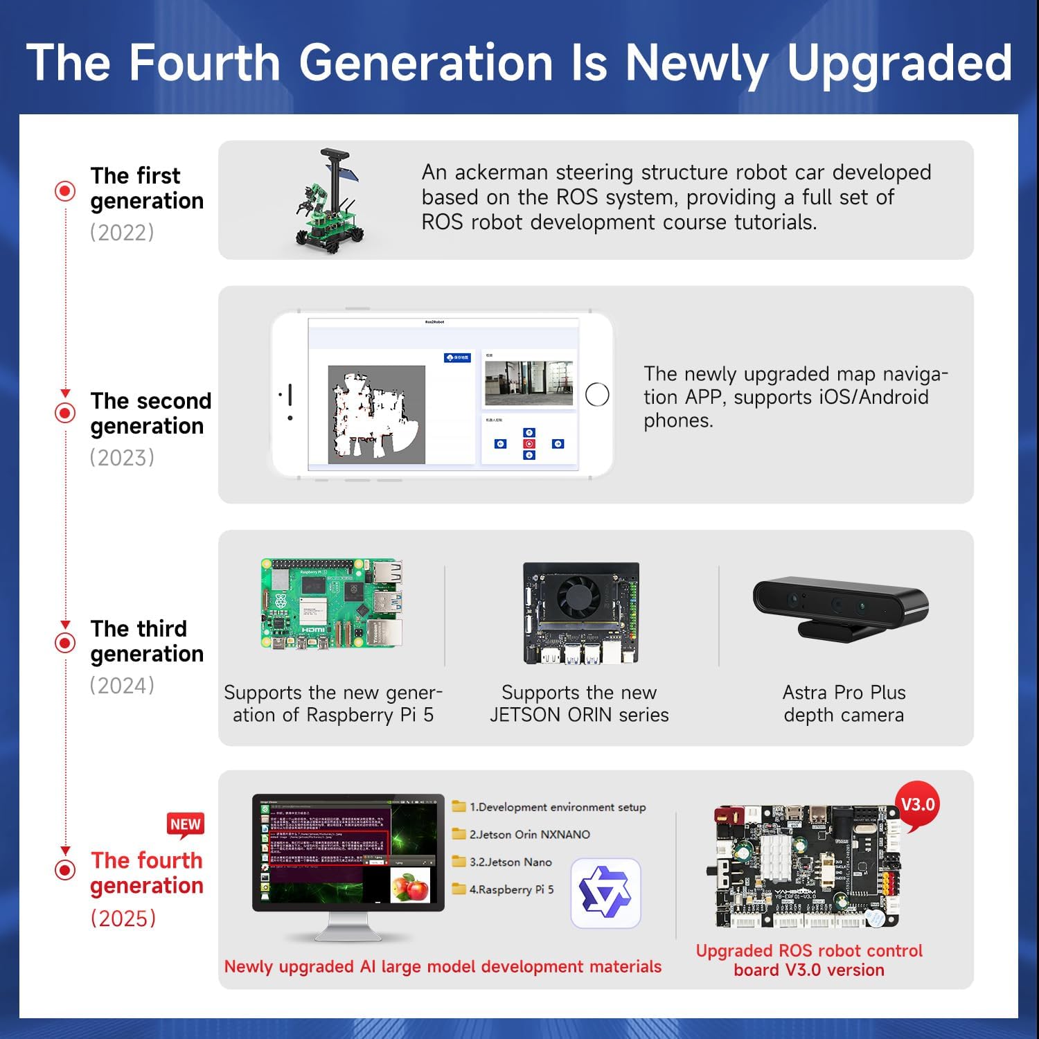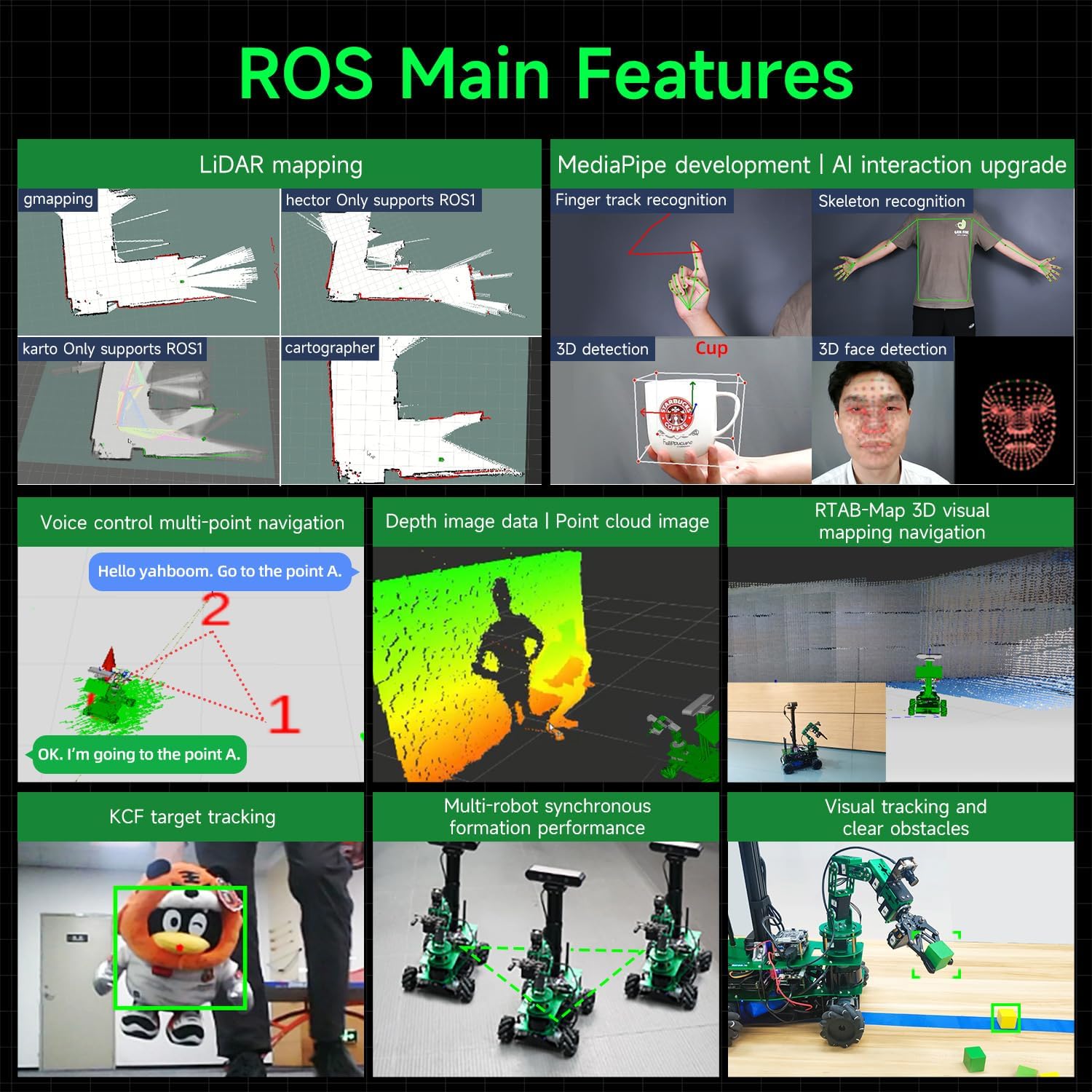 【Flagship configuration】ORBBEC Astra Pro depth camera, high-definition touch-adjustable 7-inch screen, 6-DOF robotic arm with camera AI camera, YDLIDAR 4ROS TOF ranging lidar, 80mm large-size mecanum wheel, 520 Hall encoding Geared motor, 9600MAH lithium battery pack, durable aluminum alloy body structure. NOTE: Contain the Jetson Nano development board is a Jetson Nano SUB, not official board. 【Exploration Function and Gameplay】Voice-controlled robot driving can be combined with mechanical arms for voice-controlled grabbing and other actions. It supports ORBSLAM2, Rtab-Map 3D, RRT exploration, gmapping and other algorithms for mapping, and navigation methods such as voice, lidar, Rtab-Map 3D and so on. , conventional obstacle avoidance, following, recognition, skeleton detection and other functions can be quickly realized. 【Rosmaster X3 Plus has 4 versions】The difference lies in the main control board, namely Raspberry Pi 5 16GB, Jetson nano, Jetson Orin Nano SUPER/NX SUPER. Please choose according to your needs. The main body of the robot car has been assembled, and users can start programming and operating the robot as long as they complete the installation of accessories. 【Based on ROS operating system】Through Python programming, it can learn robot arm Movelt simulation, drawing and navigation, STM32 underlying development, MaeiaPipe development, path planning and various algorithms. Yahboom provides open source materials, including video courses (English and Chinese) from basic to advanced. 【Cross-platform interconnected control】Dual APP control, real-life first-person controller, Jupyter Lab programming control, and ROS system control. | قیمت یورویی : 1139€