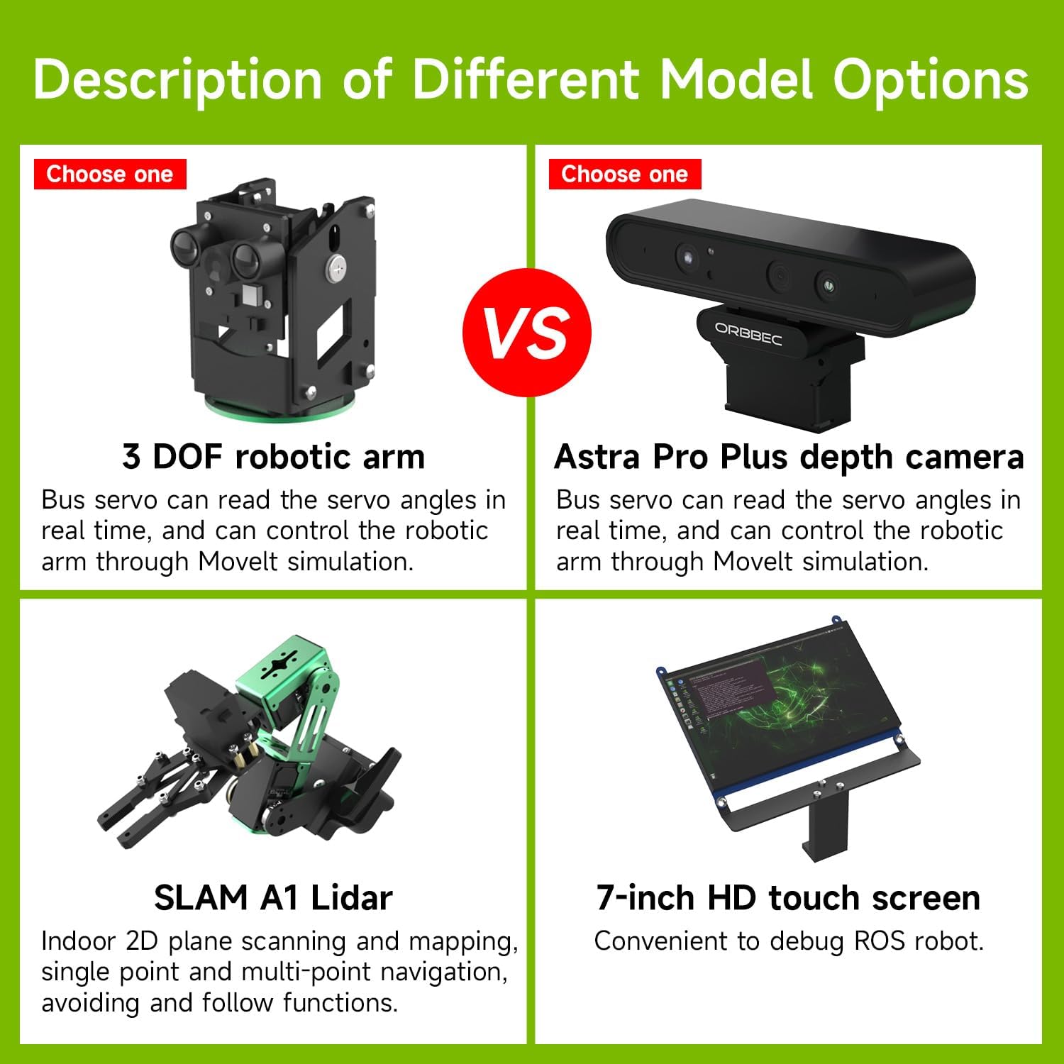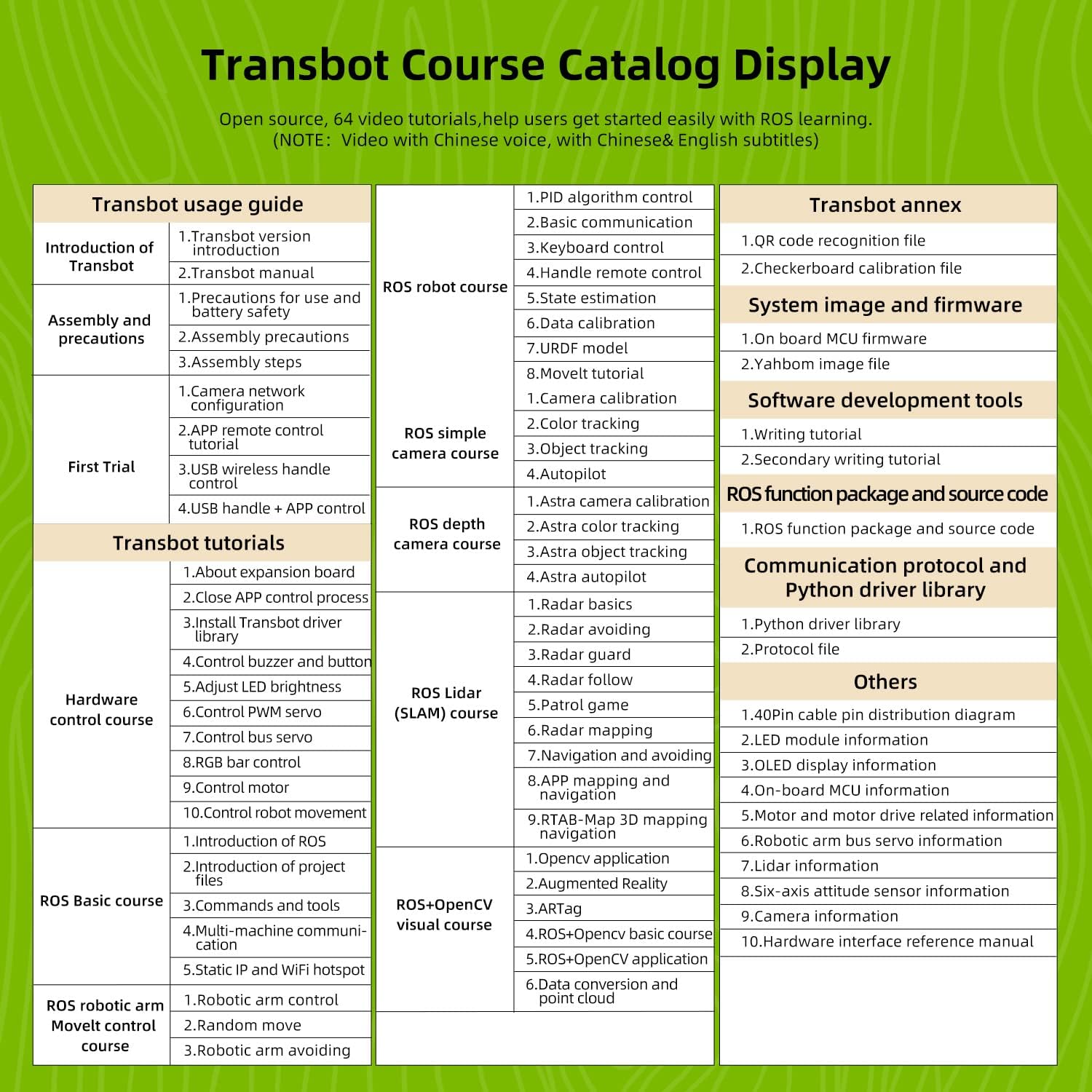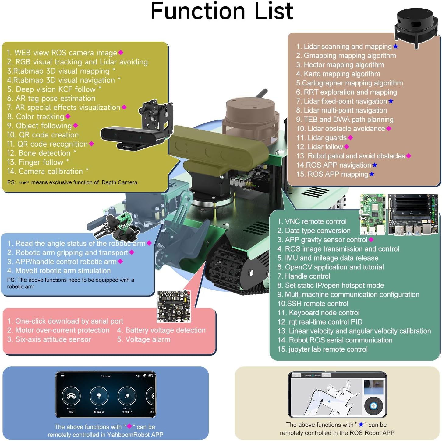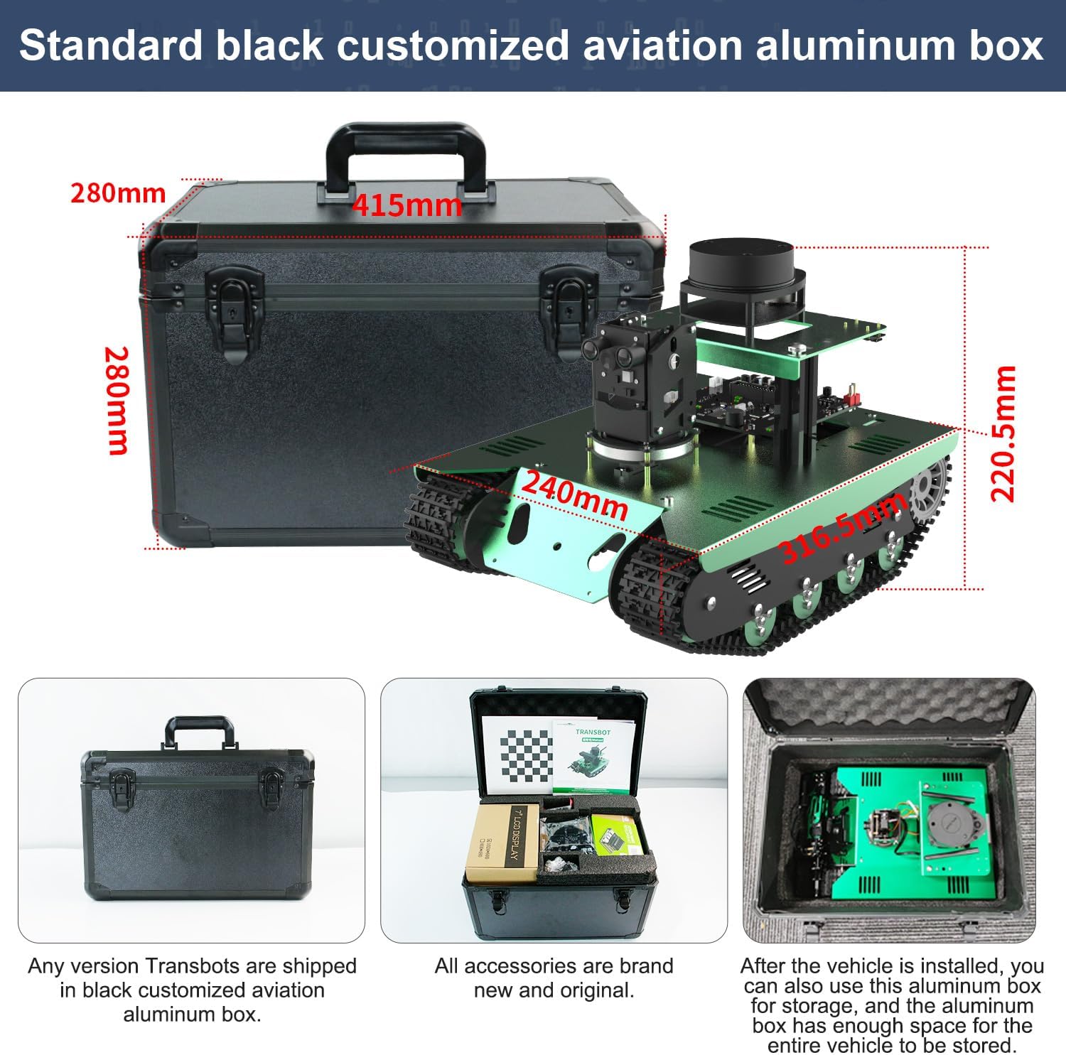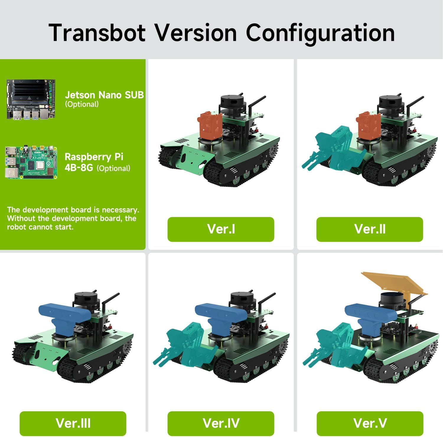 【Based on ROS Programmable Intelligent Educational Robot Set】Transbot uses the Rviz, Movelt and Qt toolboxes in the robot operating system to realize the joint control of the robot arm. Start the journey of learning ROS programming with Transbot. (★Note: Carefully check the version you ordered) NOTE: The kit containing the Jetson Nano development board is a Jetson Nano SUB board, not an official board. Note: The Robot Kit is currently not compatible with Raspberry Pi 5 【Lidar Scanning 2D Mapping Navigation】Crawler robot kit is equipped with Silan A1 lidar, which can complete indoor 2D flight scanning and mapping, realize single point and multi-point navigation and obstacle avoidance and following. (★Note: ROS robot app does not support iOS, you can create map navigation on PC) 【AI function combination】The robot integrates a wealth of AI functions, such as fixed-point navigation, automatic driving, color recognition and tracking, AR tag recognition and reality enhancement, visual image beautification, face recognition, 3-DOF flexible grasping Manipulator, lidar mapping navigation and obstacle avoidance, you get the open source code. to realize more possibilities. Furnishing. 【Cross-platform connection control】Robot can be programmed or controlled in 4 ways, ① Mobile remote control APP integrated with a variety of AI functions, ② Handle control, which can experience the FPV real-time visual effects, ③ JupyterLab online programming and ④ Professional robot Operating system control, a variety of control methods to meet different occasions, in-depth experience of the fun of robot controls. (★Note: Yahboom App Supports iOS and Android, ROS Robot App only for Android) 【Professional Hardware & Courses】Transbot has a highly equipped aluminum alloy frame, anti-jam bearing, SLAM lidar, encoder gear motor, metal servo, Yaboom professional robot expansion board, HD camera with electric rotary pan tilt (optional) and quick release -Manipulator (optional), which makes the robot have strong ability to cross obstacles. 【Courses and Help】At the same time, Yahboom offers 64 video tutorials and detailed documentation. As long as you love ROS, this is a robot not to be missed. It's a professional gift that makers and programmers dream of. Yahboom offers professional technical assistance. If you have any doubts about robotics, I hope you can leave your questions on the page or contact our technical support 【Version Difference】Transbot has a total of 25 versions, I to V distinguishes between high-definition camera or depth camera, whether it contains a robot arm, whether it contains a 7-inch screen; In addition, the Transbot main control board is divided into Jetson Nano or Raspberry Pi, and the Raspberry Pi is divided into 4B 4G or 4B 8G, please check the version you need | قیمت یورویی : 1019€