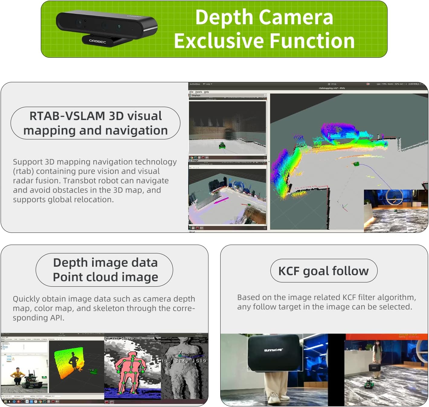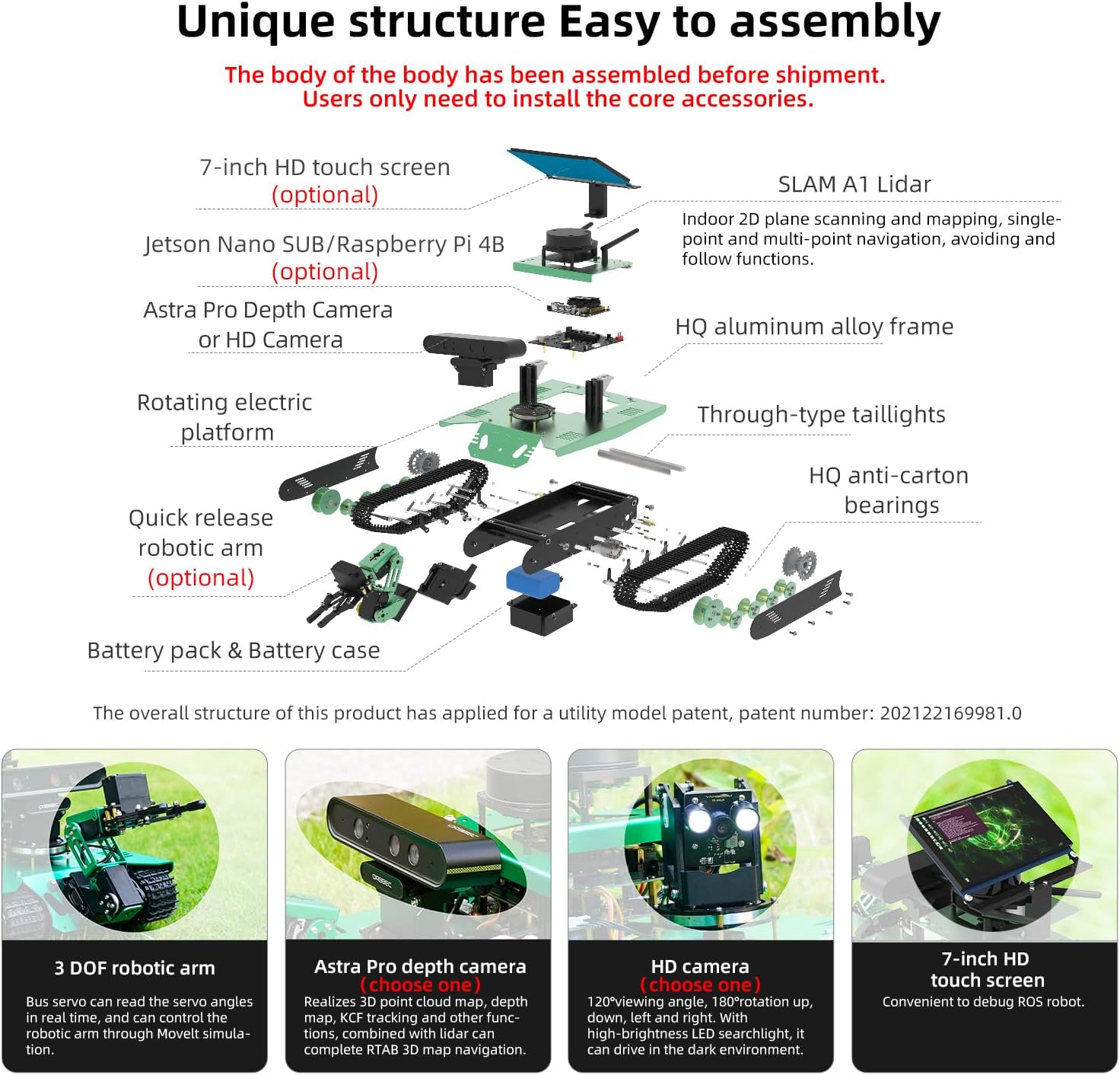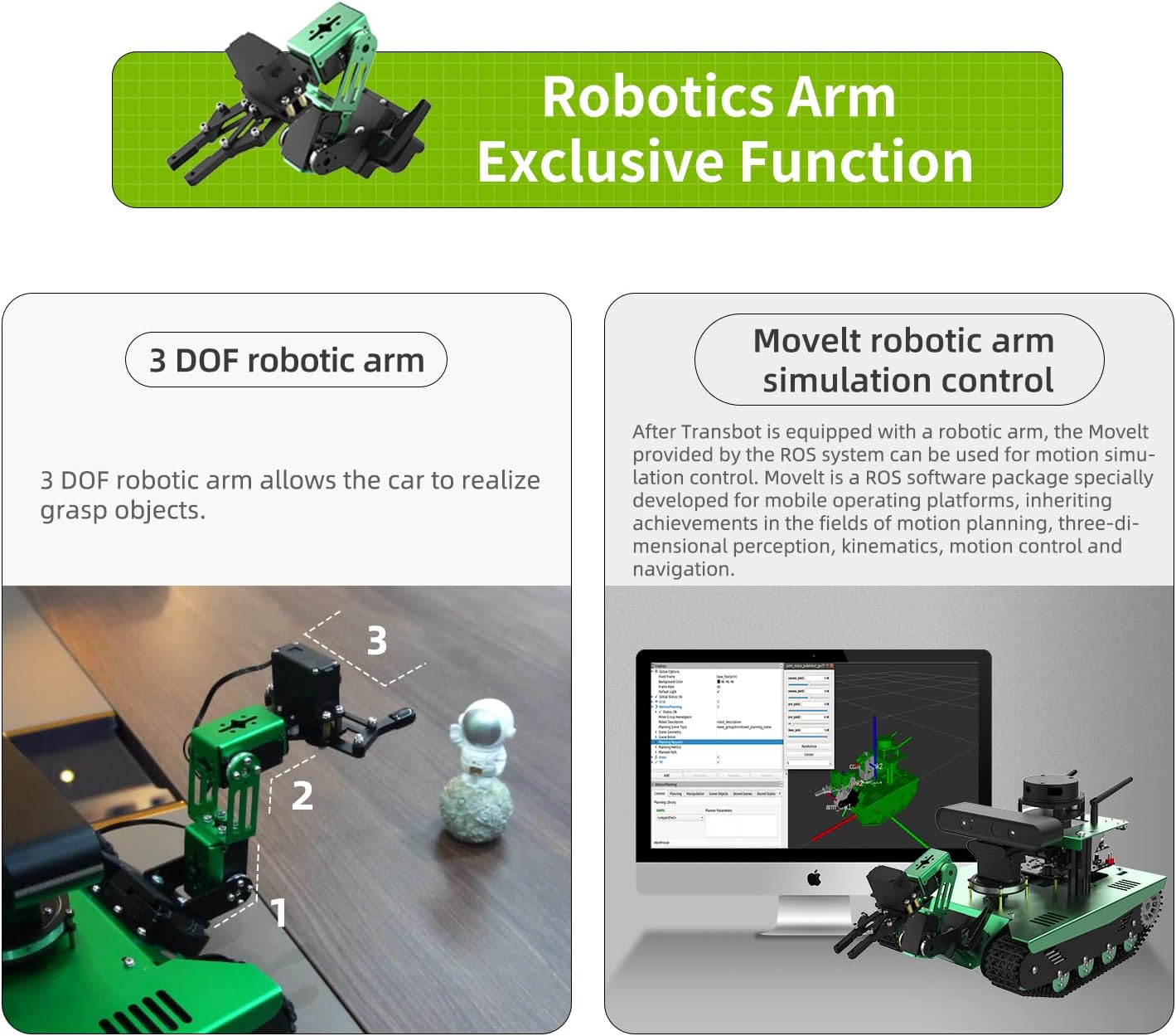 【Based on ROS Programmable Intelligent Educational Robot Set】Transbot uses the Rviz, Movelt and Qt toolboxes in the robot operating system to realize the joint control of the robot arm. Start the journey of learning ROS programming with Transbot. (★Note: Carefully check the version you ordered) 【Lidar Scanning 2D Mapping Navigation】Crawler robot kit is equipped with Silan A1 lidar, which can complete indoor 2D flight scanning and mapping, realize single point and multi-point navigation and obstacle avoidance and following. (★Note: ROS robot app does not support iOS, you can create map navigation on PC) 【AI function combination】The robot integrates a wealth of AI functions, such as fixed-point navigation, automatic driving, color recognition and tracking, AR tag recognition and reality enhancement, visual image beautification, face recognition, 3-DOF flexible grasping Manipulator, lidar mapping navigation and obstacle avoidance, you get the open source code. to realize more possibilities. Furnishing. 【Cross-platform connection control】Robot can be programmed or controlled in 4 ways, ① Mobile remote control APP integrated with a variety of AI functions, ② Handle control, which can experience the FPV real-time visual effects, ③ JupyterLab online programming and ④ Professional robot Operating system control, a variety of control methods to meet different occasions, in-depth experience of the fun of robot controls. (★Note: Yahboom App Supports iOS and Android, ROS Robot App only for Android) 【Professional Hardware & Courses】Transbot has a highly equipped aluminum alloy frame, anti-jam bearing, SLAM lidar, encoder gear motor, metal servo, Yaboom professional robot expansion board, HD camera with electric rotary pan tilt (optional) and quick release -Manipulator (optional), which makes the robot have strong ability to cross obstacles. 【Courses and Help】At the same time, Yahboom offers 64 video tutorials and detailed documentation. As long as you love ROS, this is a robot not to be missed. It's a professional gift that makers and programmers dream of. Yahboom offers professional technical assistance. If you have any doubts about robotics, I hope you can leave your questions on the page or contact our technical support 【Version Difference】Transbot has a total of 25 versions, I to V distinguishes between high-definition camera or depth camera, whether it contains a robot arm, whether it contains a 7-inch screen; In addition, the Transbot main control board is divided into Jetson Nano or Raspberry Pi, and the Raspberry Pi is divided into 4B 4G or 4B 8G, please check the version you need | قیمت یورویی : 1168€