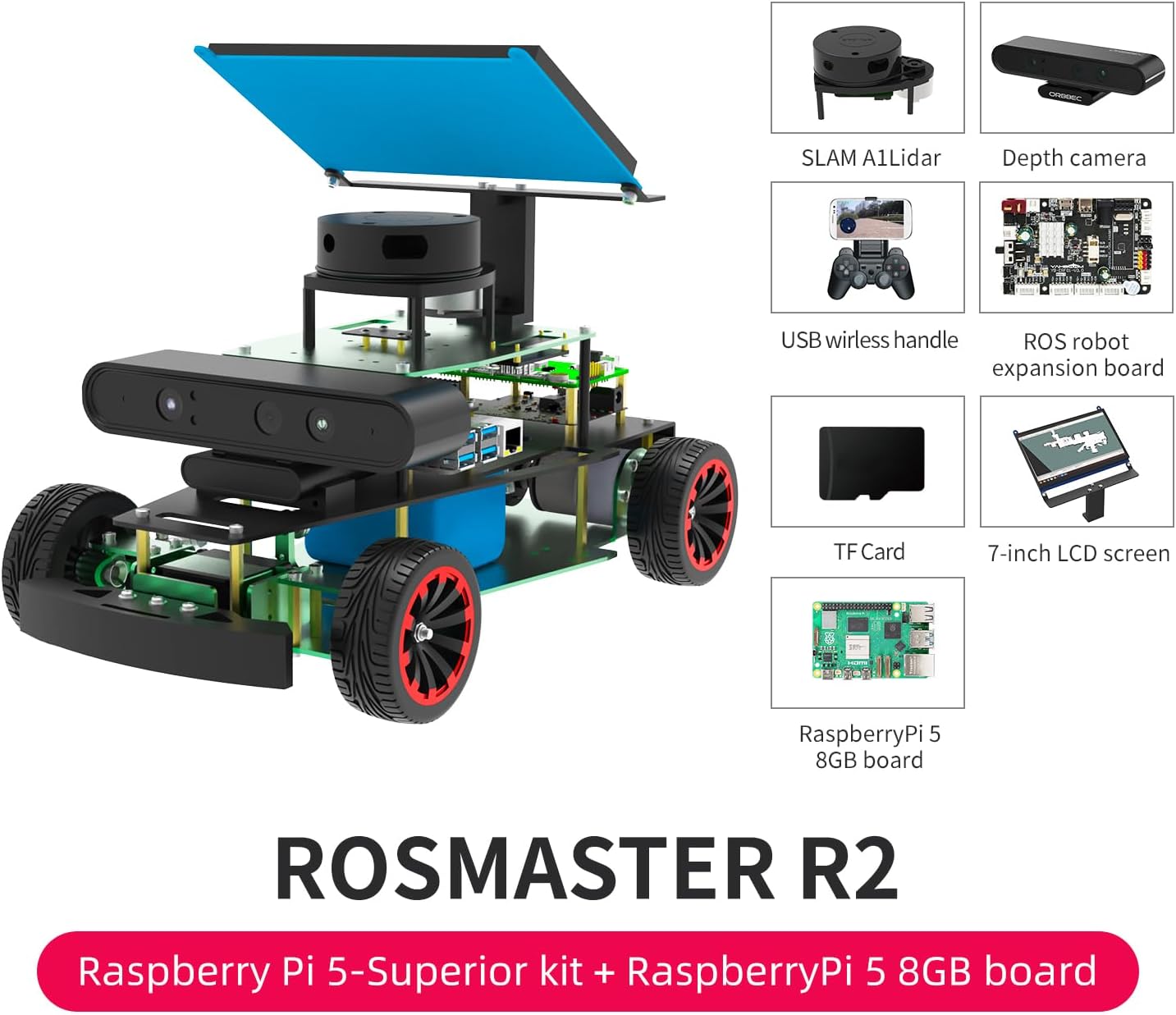 【Ackermann Steering Structure】The Rosmaster R2 robot car adopts the steering method of modern cars and adopts an aluminum Ackermann chassis structure. When the robot car turns, the angle of the inner ring is different, and the turning radius of the inner tube is smaller than the turning radius of the tire, which can maximize the performance of the robot car. R2 is compatible with ROS&ROS2, and Yahboom provides relevant ROS2 system programming information. 【Rosmaster R2 has 3 versions (standard version, deluxe version, ultimate version)】It can be used with 4 development boards (Raspberry Pi 5, Jetson Nano 4GB, Jetson Orin Nano SUPER, Jetson Orin NX SUPER), depending on the version you choose. Please note that a development board is included. If you would like to reduce the amount of hardware in your kit (e.g. depth camera, ridar, etc.), please contact Yahboom first. 【Based on robot operating system】is equipped with high-performance hardware such as lidar, depth camera, and voice interaction module. It can realize applications such as robot motion control, remote communication control, measurement navigation, obstacle tracking, automatic driving, human body feature action recognition, and voice alternating control. Yahboom provides tutorials, source code and professional technical support. All documentation,including installation instructions is English. 【Multi-platform linkage】Supports multiple remote control methods. For example, mobile applications, steering wheels, ROS systems, computer keyboards, etc. It is an artificial intelligence robot that listens to your commands. You can control your robot car and import your code at any time. Note: Map navigation app is only compatible with Android phones. 【Excellent hardware configuration】Aluminum alloy body, 360° omnidirectional Mecanum wheel, optional lidar, high-quality depth camera, optional voice interaction module, professionally designed expansion board. Support more development. Provide professionals with exploration models, learning algorithms, acquisition of unknown area terrain, deep learning AI visual recognition, research on autonomous driving, exploration of 3D object recognition, etc. | قیمت یورویی : 785€