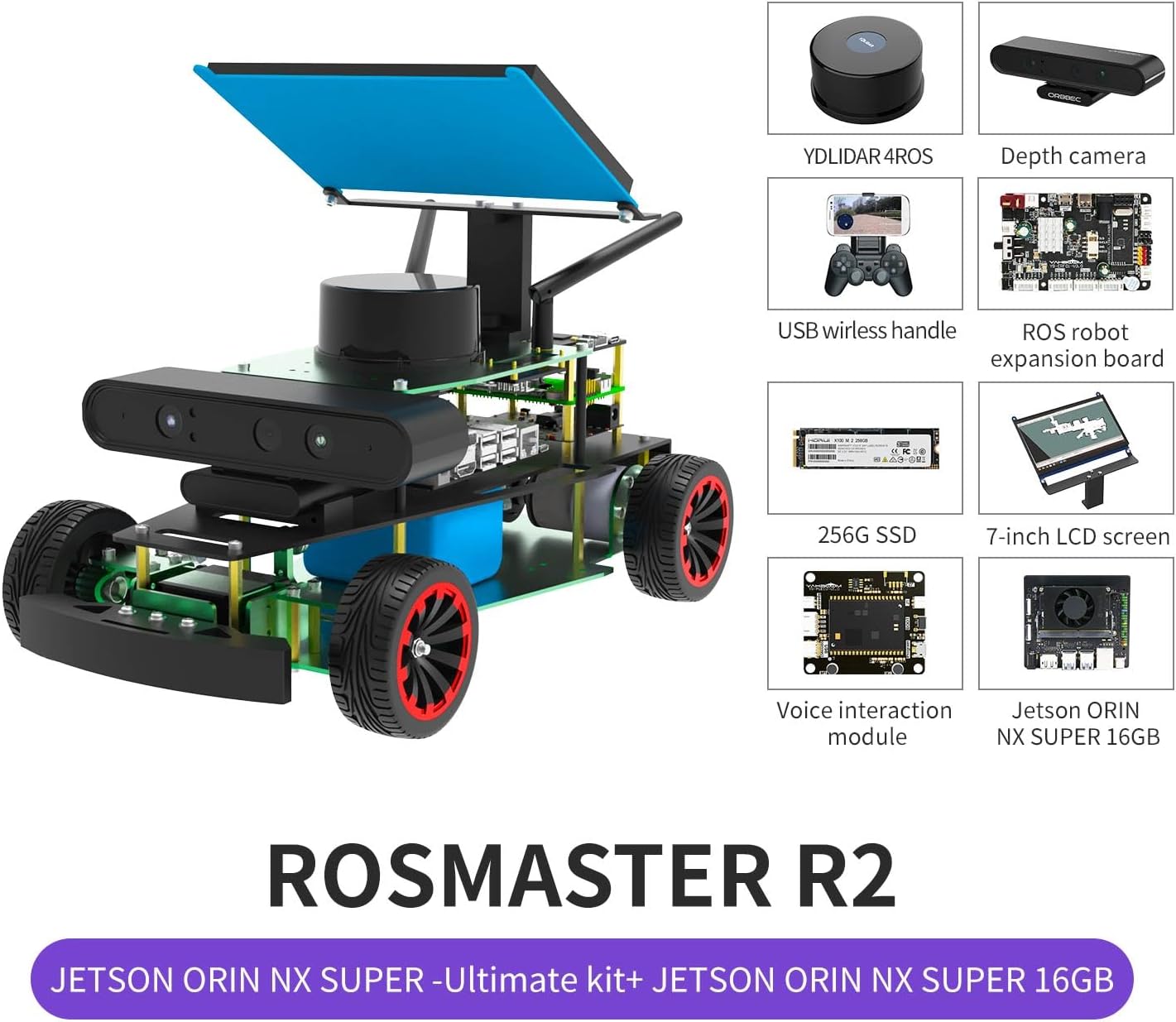 【Ackermann Steering Structure】The Rosmaster R2 robot car adopts the steering method of modern cars and adopts an aluminum Ackermann chassis structure. When the robot car turns, the angle of the inner ring is different, and the turning radius of the inner tube is smaller than the turning radius of the tire, which can maximize the performance of the robot car. R2 is compatible with ROS&ROS2, and Yahboom provides relevant ROS2 system programming information. 【Rosmaster R2 has 3 versions (standard version, deluxe version, ultimate version)】It can be used with 4 development boards (Raspberry Pi 5, Jetson Nano 4GB, Jetson Orin Nano SUPER, Jetson Orin NX SUPER), depending on the version you choose. Please note that a development board is included. If you would like to reduce the amount of hardware in your kit (e.g. depth camera, ridar, etc.), please contact Yahboom first. 【Based on robot operating system】is equipped with high-performance hardware such as lidar, depth camera, and voice interaction module. It can realize applications such as robot motion control, remote communication control, measurement navigation, obstacle tracking, automatic driving, human body feature action recognition, and voice alternating control. Yahboom provides tutorials, source code and professional technical support. All documentation,including installation instructions is English. 【Multi-platform linkage】Supports multiple remote control methods. For example, mobile applications, steering wheels, ROS systems, computer keyboards, etc. It is an artificial intelligence robot that listens to your commands. You can control your robot car and import your code at any time. Note: Map navigation app is only compatible with Android phones. 【Excellent hardware configuration】Aluminum alloy body, 360° omnidirectional Mecanum wheel, optional lidar, high-quality depth camera, optional voice interaction module, professionally designed expansion board. Support more development. Provide professionals with exploration models, learning algorithms, acquisition of unknown area terrain, deep learning AI visual recognition, research on autonomous driving, exploration of 3D object recognition, etc. | قیمت یورویی : 1965€