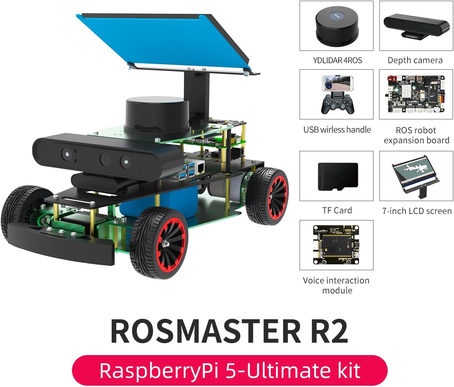 【Ackermann Steering Structure】The Rosmaster R2 robot car adopts the steering method of modern cars and adopts an aluminum Ackermann chassis structure. When the robot car turns, the angle of the inner ring is different, and the turning radius of the inner tube is smaller than the turning radius of the tire, which can maximize the performance of the robot car. R2 is compatible with ROS&ROS2, and Yahboom provides relevant ROS2 system programming information. 【Rosmaster R2 has 3 versions (standard version, deluxe version, ultimate version)】It can be used with 4 development boards (Raspberry Pi 5, Jetson Nano 4GB, Jetson Orin Nano SUPER, Jetson Orin NX SUPER), depending on the version you choose. Please note that a development board is included. If you would like to reduce the amount of hardware in your kit (e.g. depth camera, ridar, etc.), please contact Yahboom first. 【Based on robot operating system】is equipped with high-performance hardware such as lidar, depth camera, and voice interaction module. It can realize applications such as robot motion control, remote communication control, measurement navigation, obstacle tracking, automatic driving, human body feature action recognition, and voice alternating control. Yahboom provides tutorials, source code and professional technical support. All documentation,including installation instructions is English. 【Multi-platform linkage】Supports multiple remote control methods. For example, mobile applications, steering wheels, ROS systems, computer keyboards, etc. It is an artificial intelligence robot that listens to your commands. You can control your robot car and import your code at any time. Note: Map navigation app is only compatible with Android phones. 【Excellent hardware configuration】Aluminum alloy body, 360° omnidirectional Mecanum wheel, optional lidar, high-quality depth camera, optional voice interaction module, professionally designed expansion board. Support more development. Provide professionals with exploration models, learning algorithms, acquisition of unknown area terrain, deep learning AI visual recognition, research on autonomous driving, exploration of 3D object recognition, etc. | قیمت یورویی : 855€
