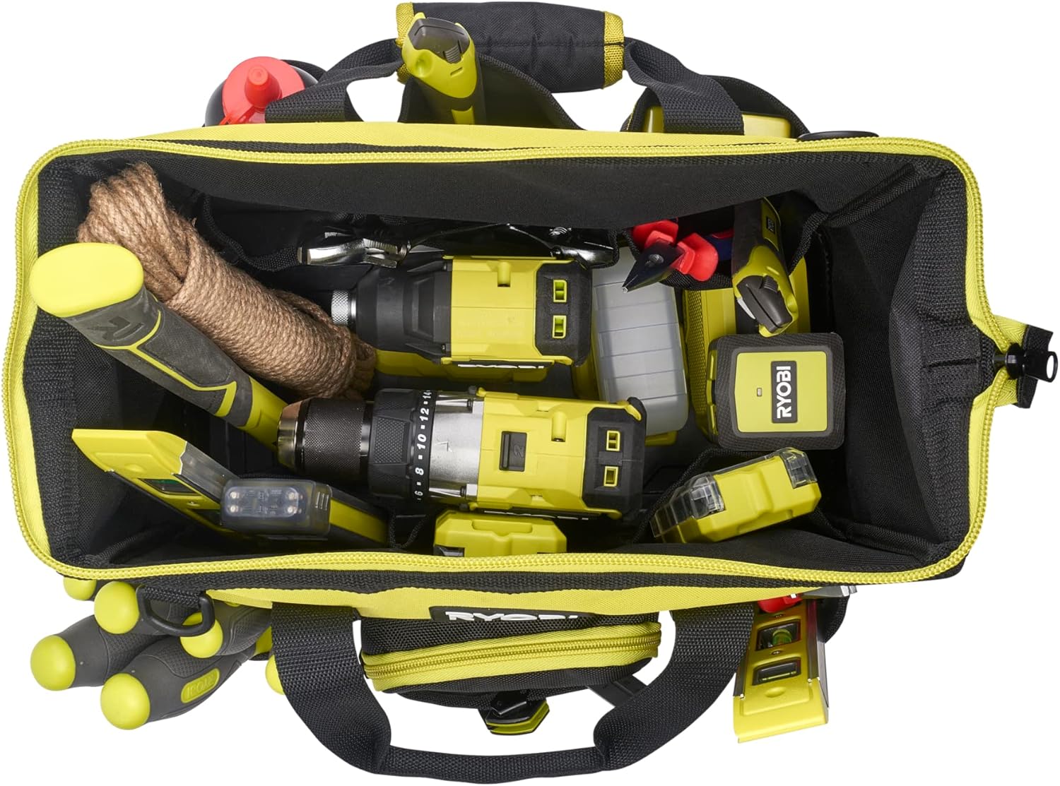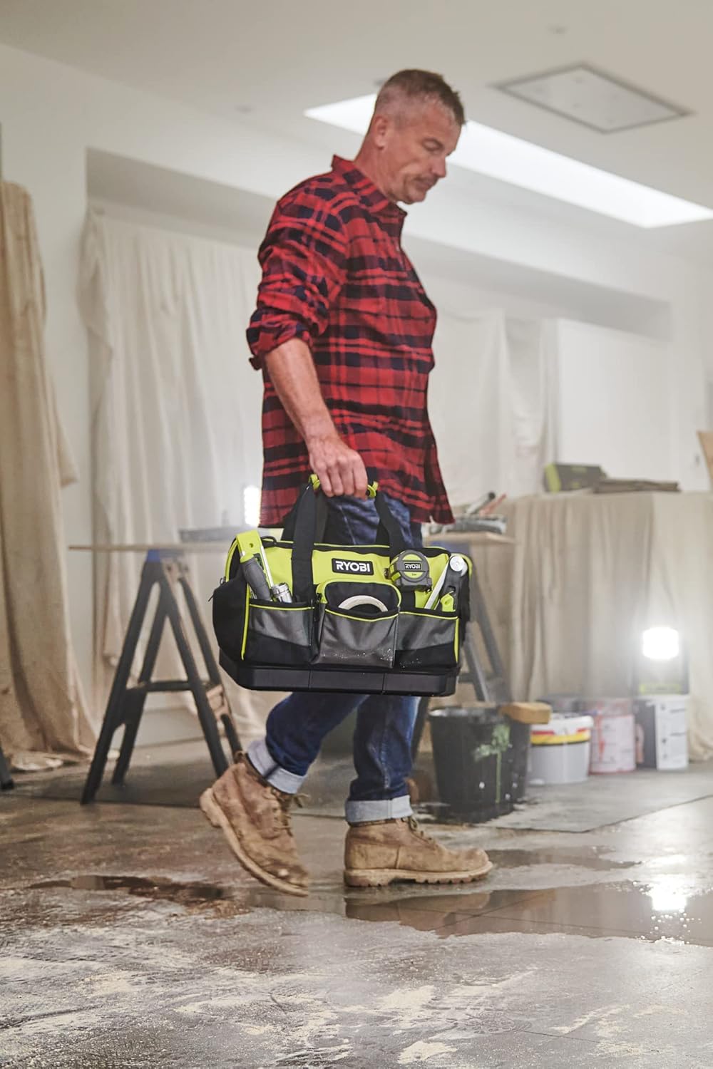 RYOBI Handwerkertasche mit Schultergurt, S, 22 L Fassungsvermögen, für verschiedene Arbeitsbereiche einsetzbar Widerstandsfähiger Körper aus 600 Ihrer Polyester und Taschen aus 1680 Ihrer Polyester, für eine längere Lebensdauer und maximale Verschleißfestigkeit Stabiler Polypropylen-Hartboden, auch auf nassen Oberflächen einsetzbar Taschen: 6 x Innentaschen, 3 x offene Taschen auf der Vorderseite, 1 x Reißverschlusstasche auf der Vorderseite, 3 x offene Taschen auf der Rückseite, 1x Maßbandhalter Stabiler und wasserfester Boden Diese Tasche bietet viel Stauraum mit einer einzigen Reißverschlussöffnung und einer vorderen Reißverschlusstasche zur Aufbewahrung persönlicher Gegenstände Gepolsterter Schultergurt und verstärkte Griffe Lieferumfang: RYOBI Handwerkertasche Größe S RSSSTB1 | قیمت یورویی : 37.64€